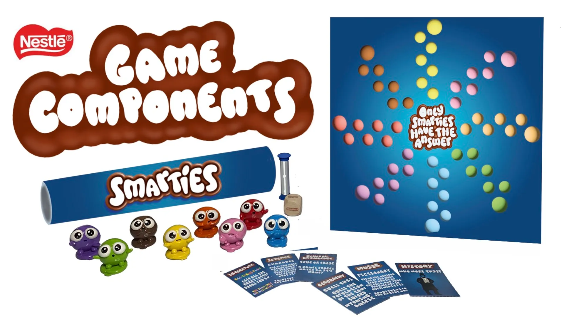 “Meet the brand new Smarties characters; Edie, Nessie, Fin, Ronnie, Billy, Ozzy, Kirby and Shell in ‘Only Smarties Have the Answer’ an interactive board game inspired by an old Smarties campaign. In this game, friends and families test their knowledge to see who has the answer.”