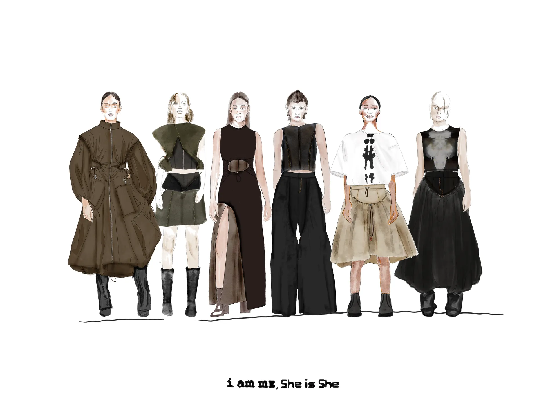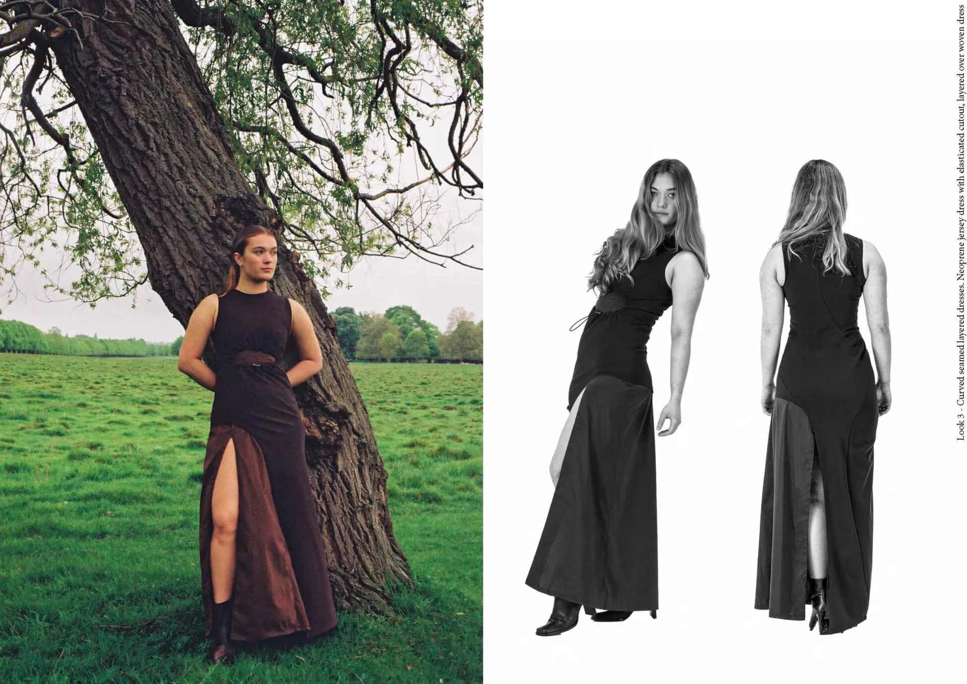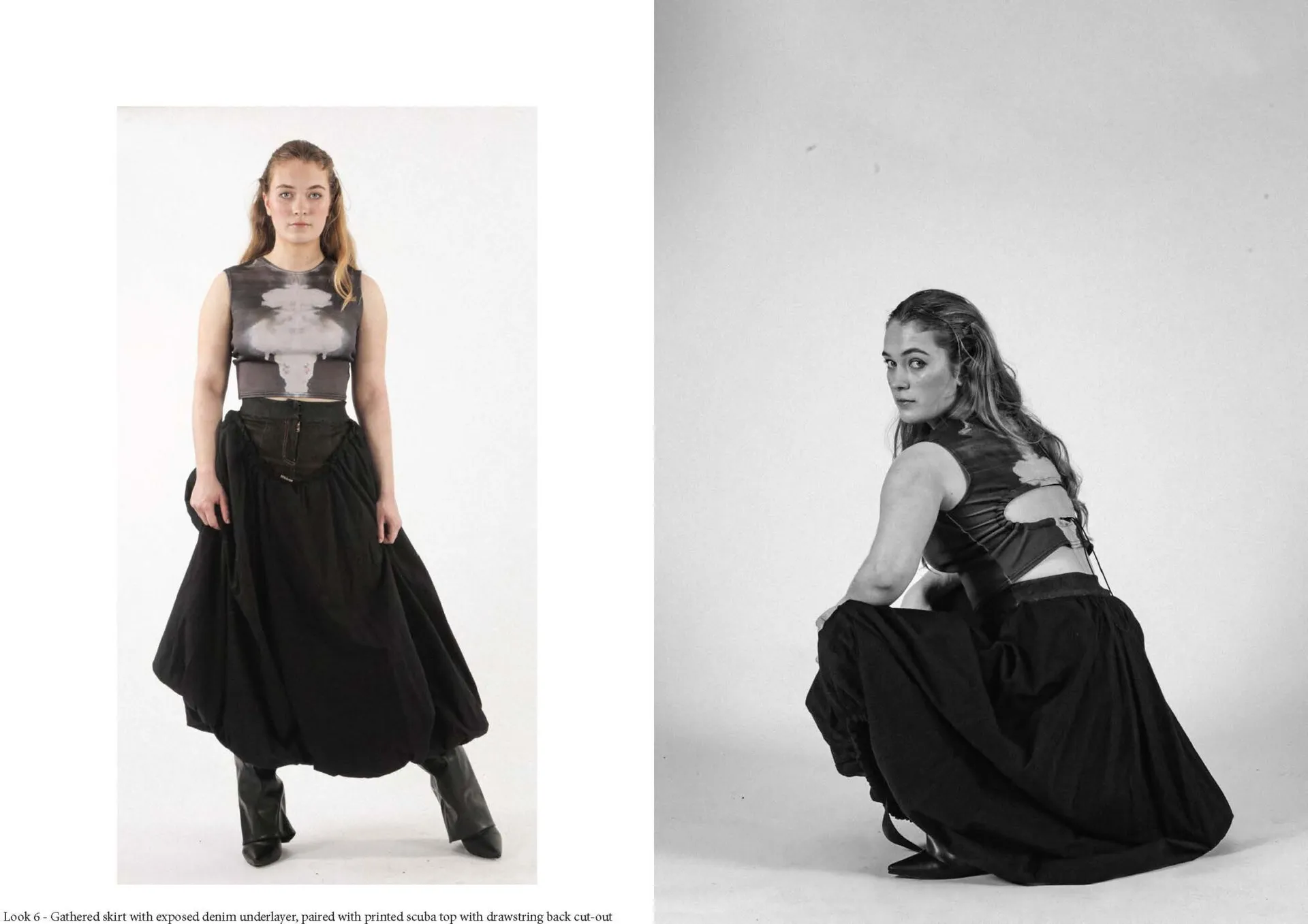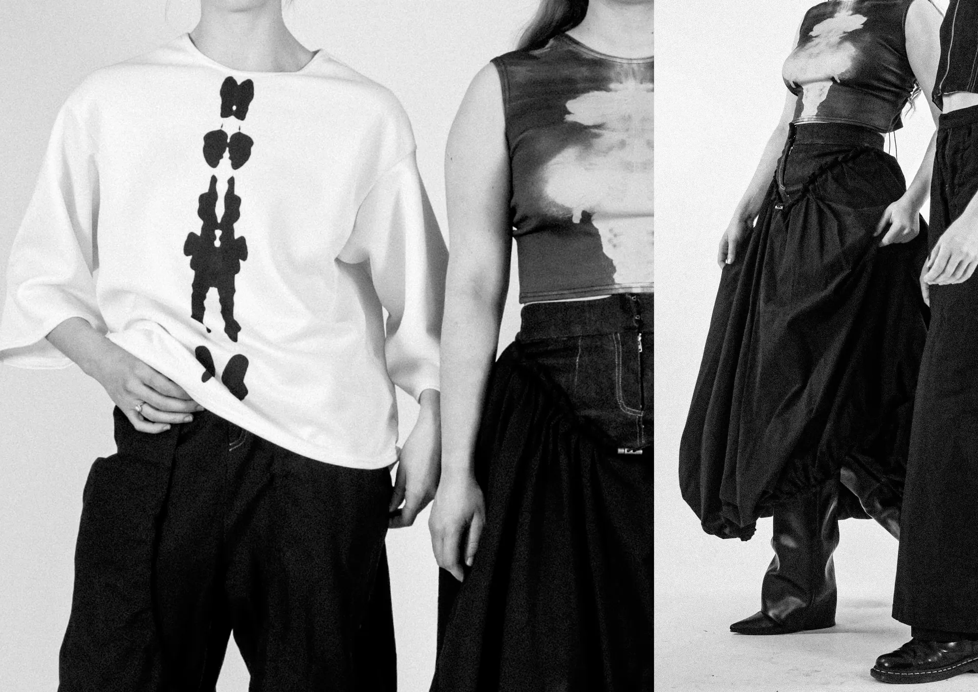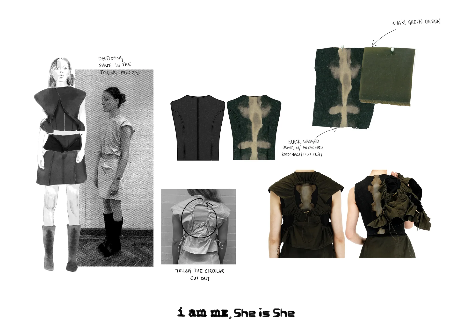 My graduate fashion collection is a visual exploration of my identity as an identical twin, drawing inspiration from the Rorschach test. Just as the Rorschach test presents ambiguous inkblots that provoke varied interpretations, my collection symbolises my identity as a twin, demonstrated through the use of contrasting textures, layered garments, experimentation with symmetrical and asymmetrical silhouettes, and my Rorschach test prints.