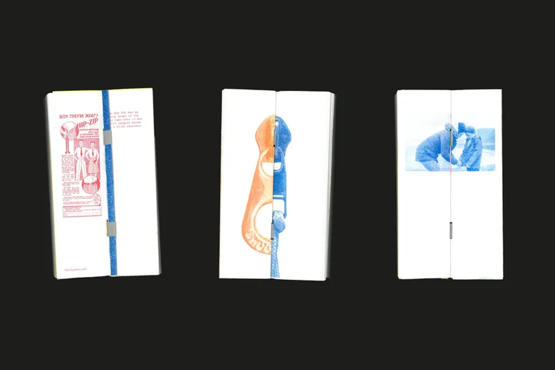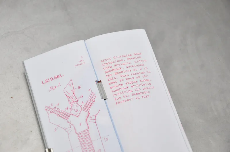 Hookless No.2 is a publication that is a celebration of the Zip, an unseen, functional item that we use everyday, but never notice. Named after the first ever iteration of the modern Zip, this publication aims to draw attention to this once brand-new remarkable invention. Bound entirely with paper and printed using soy-based inks this publication aims to promote a sustainable design practice.