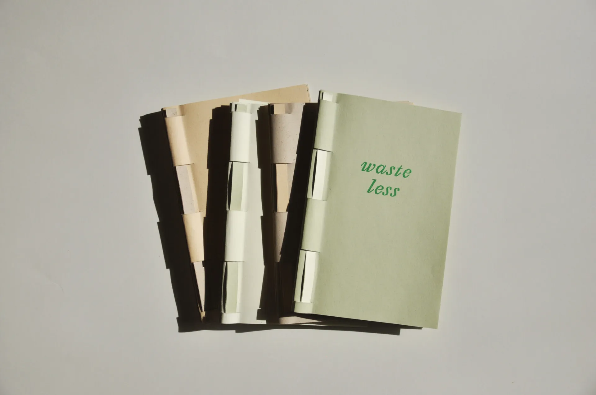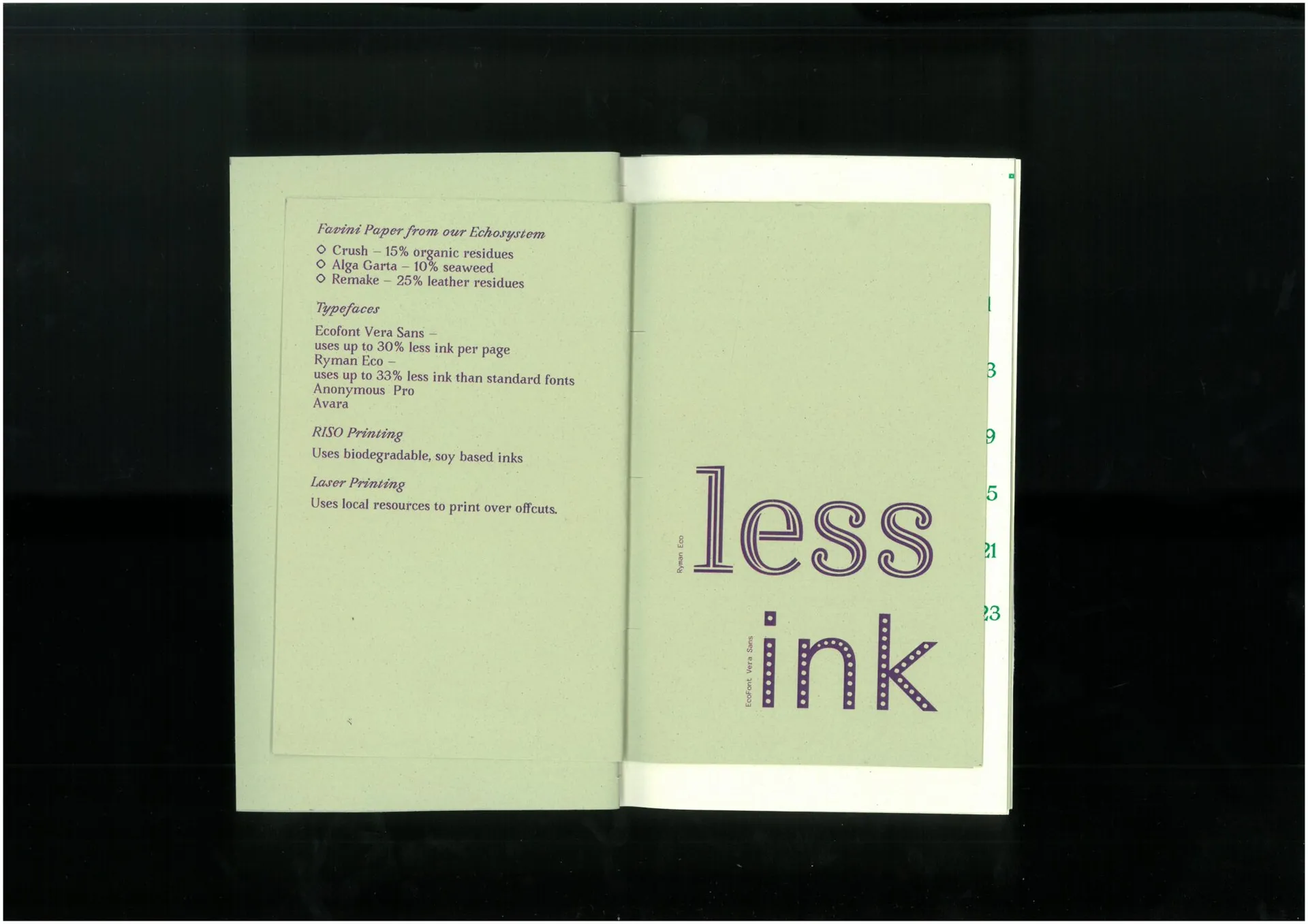 Waste Less is a zero-waste publication, a book created and bound from one piece of paper that uses all of it’s offcuts in it’s assembly. It is driven by the idea that the method of ‘use, make, dispose’ is unacceptable, aiming to encourage creatives to take ownership of the waste they produce in their practice. As a result, papers made from waste materials, various Ecofonts and sustainable printing methods were used in it’s creation. Inside are five interviews with UK based designers about sustainable production methods and taking ownership of the waste that is produced in the creative industry.
