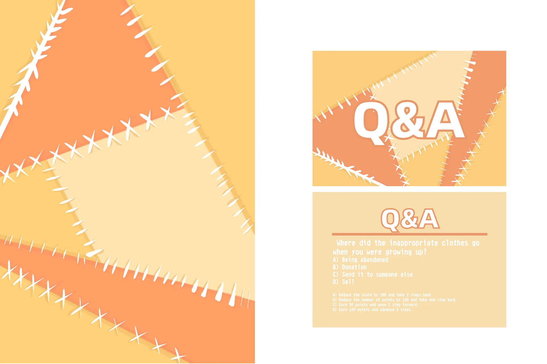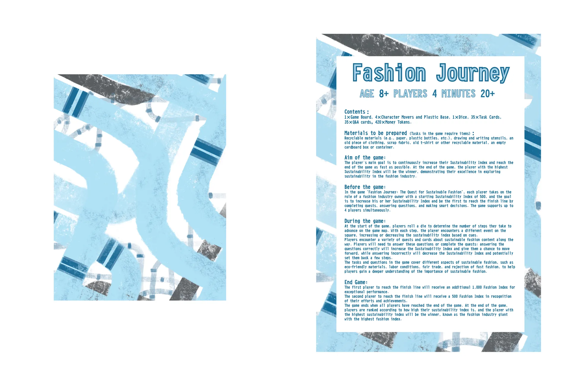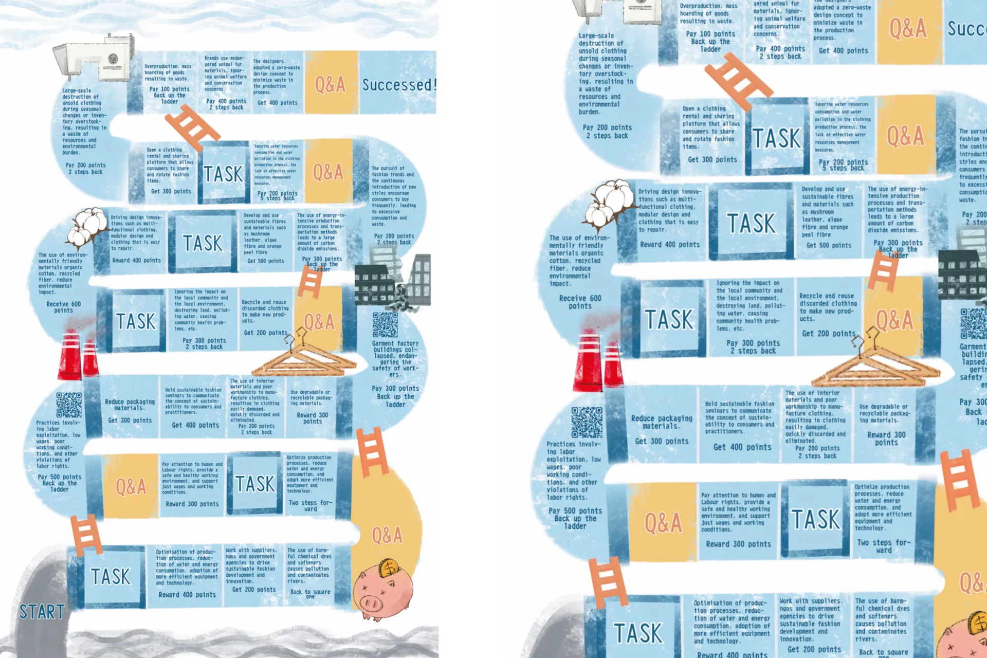 The name of the board game is “Fashion Journey: The Quest for Sustainable Fashion”, and the game scenario is based on a sewage pipe in the garment industry, where players climb up the pipe with scores, rewards or penalties. Thus, the main body of the game board is the water pipe, with clean water above the composition and sewage below it. There are 36 squares on the pipe, including one for “Start” one for “Success”; five for “Quest” and five for “Q&A”. “Each of these grids has five, the player walks to these grids, according to the cards drawn, to complete the “task” cards or answer the “Q & A” questions, choose different options will trigger different penalties or rewards; other grids are triggered rewards or rewards. The other grids are for prompts that trigger rewards or penalties. The prompts that trigger rewards are mainly sustainable fashion behaviours, of which there are 13, while the prompts that trigger penalties are the negative impacts of the fashion industry, of which there are 11. In addition, there are QR codes on two grids. The information on the QR codes records the big events in the fashion industry, one of which depicts the collapse of the Rana building in Bangladesh, with information cited from the Clean Clothes Campaign, Wikipedia, and an image from the New York Daily News. The other one is about fashion labour, with information and images from Collective Fashion Justice. In order to let players experience the authenticity of the information in the tabletop game, players can scan the QR code to learn the information.