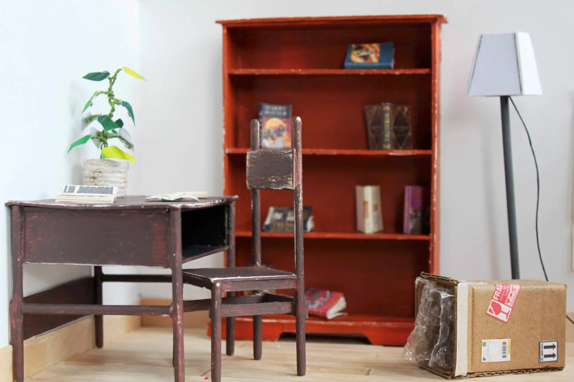 Based on Graphic Props within the film industry, ‘Dissertation Diorama’ is a miniature set depicting the only habitat endured in the weeks leading up to dissertation hand-in. Focusing on specific aspects of my surroundings such as furniture, books and general ephemera, the diorama signifies the journey to a finished essay. Replicating real life, the diorama replicates the Balham Library desk, books that were used for research and actual home furniture. Along with the miniature world, a small print of the dissertation is included to be read with a magnifying glass.