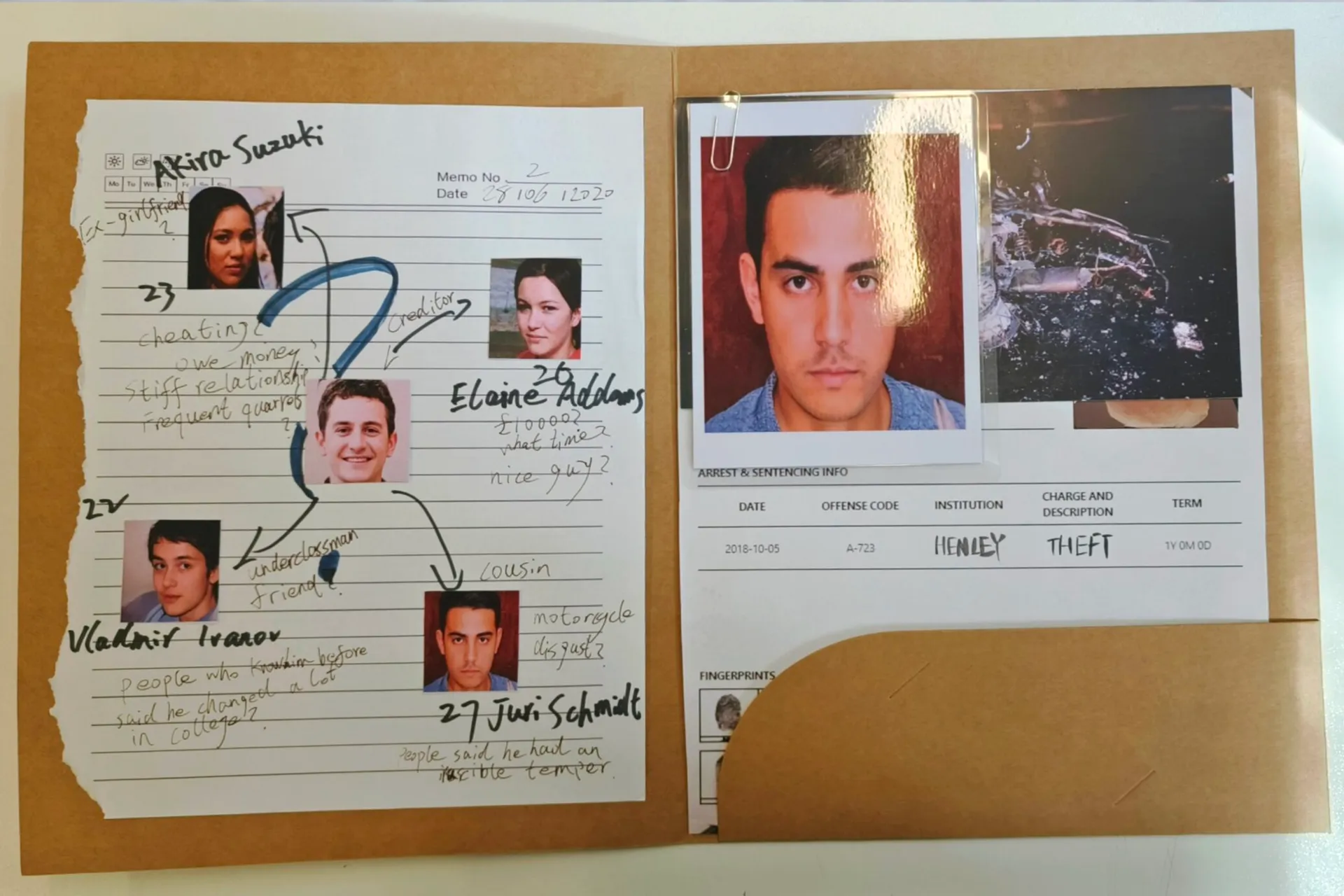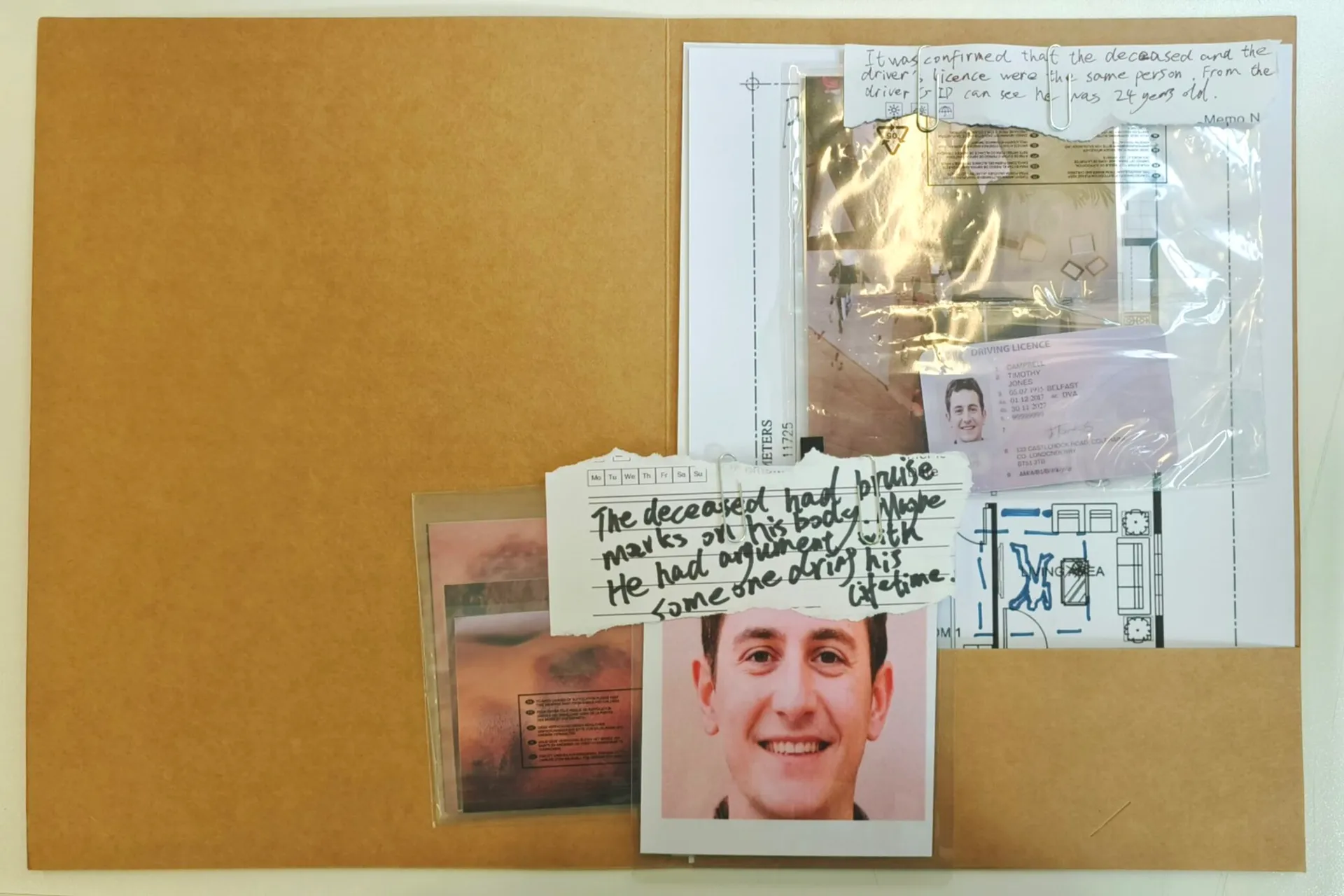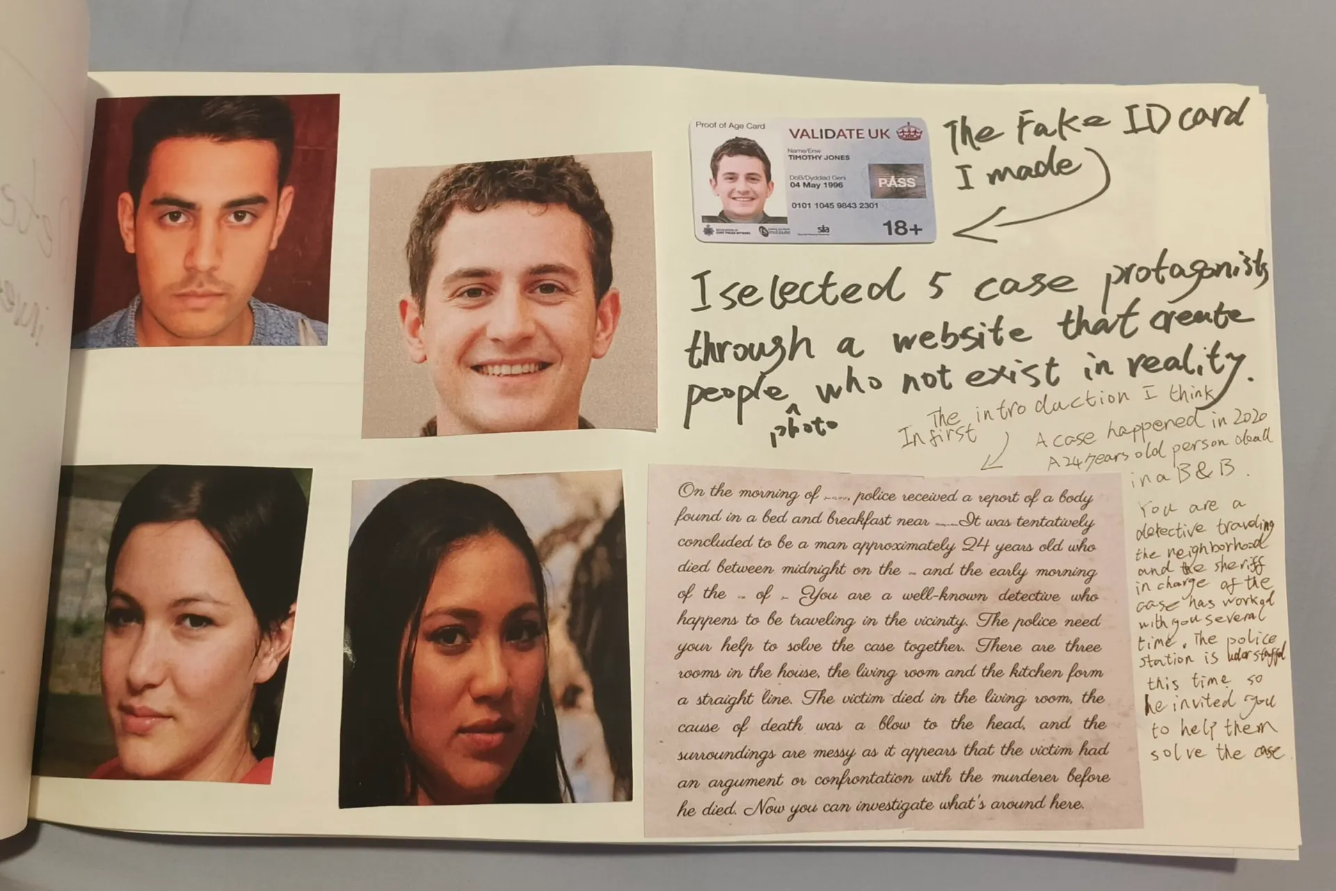 My design is to immerse the audience in a fictional case by playing a detective to investigate. By collecting clues various photo-forged files, id cards. To understand the relationship between the events and the task and to think about who the real killer is.The idea was to create a piece where everyone could participate and experience the fun of being a detective. The case is a murder case with four suspects. They all have different motives and the audience can use the clues to determine who the most likely killer is.