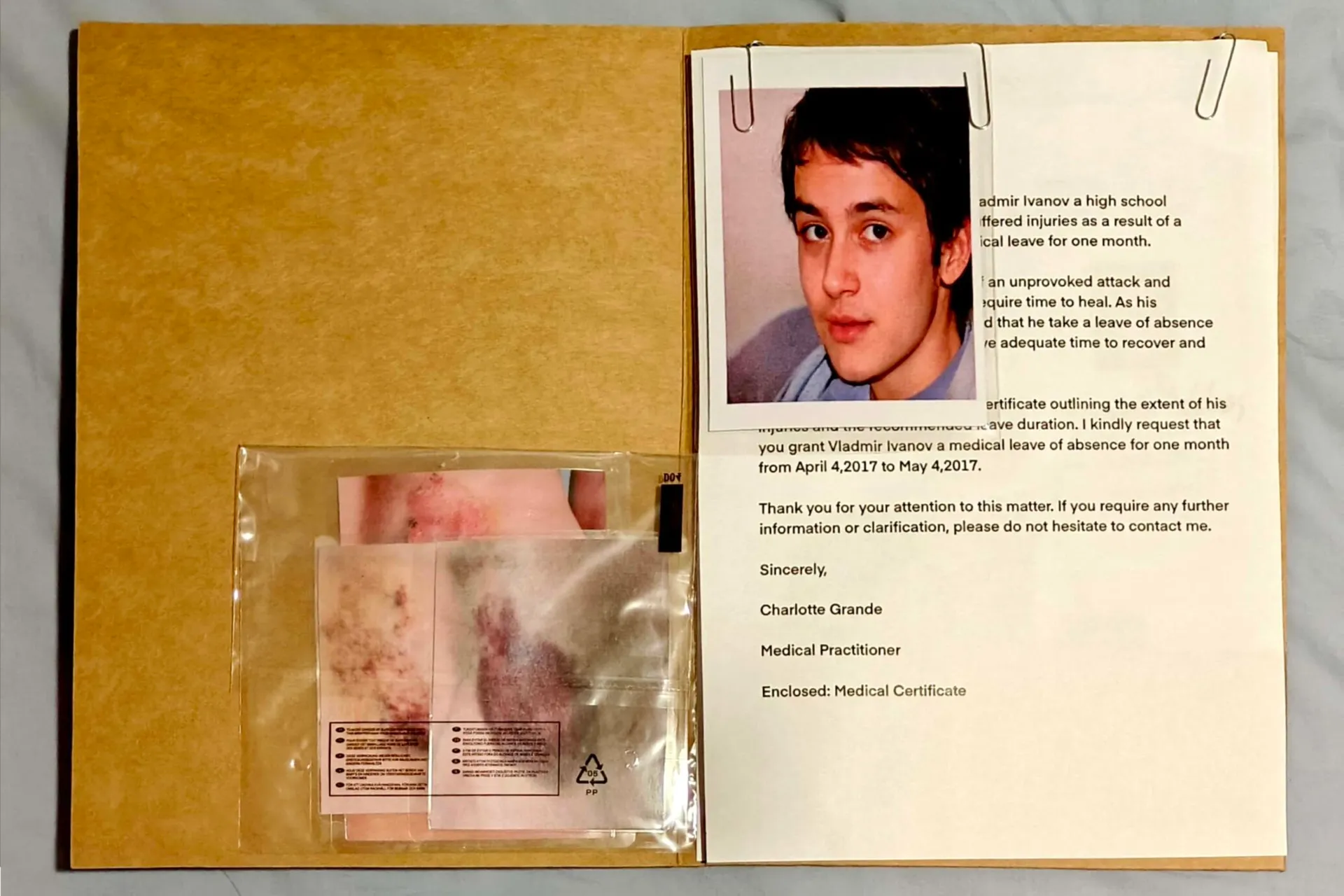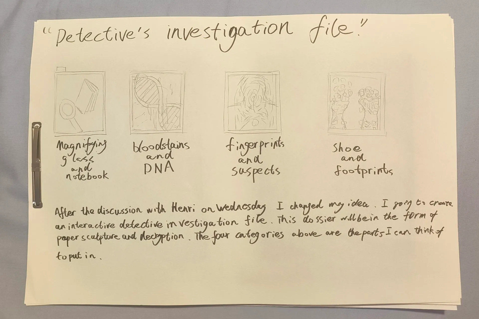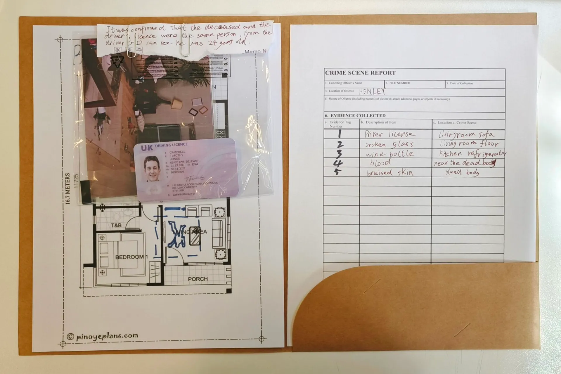 My design is to immerse the audience in a fictional case by playing a detective to investigate. By collecting clues various photo-forged files, id cards. To understand the relationship between the events and the task and to think about who the real killer is.The idea was to create a piece where everyone could participate and experience the fun of being a detective. The case is a murder case with four suspects. They all have different motives and the audience can use the clues to determine who the most likely killer is.