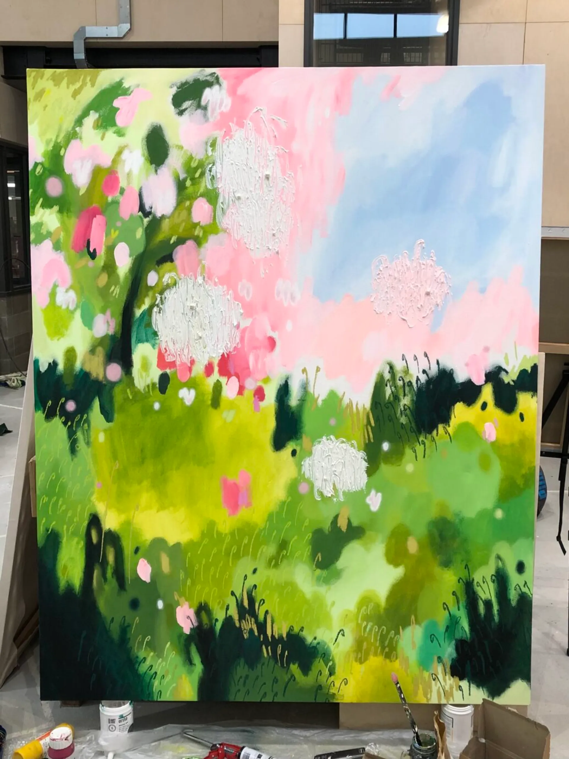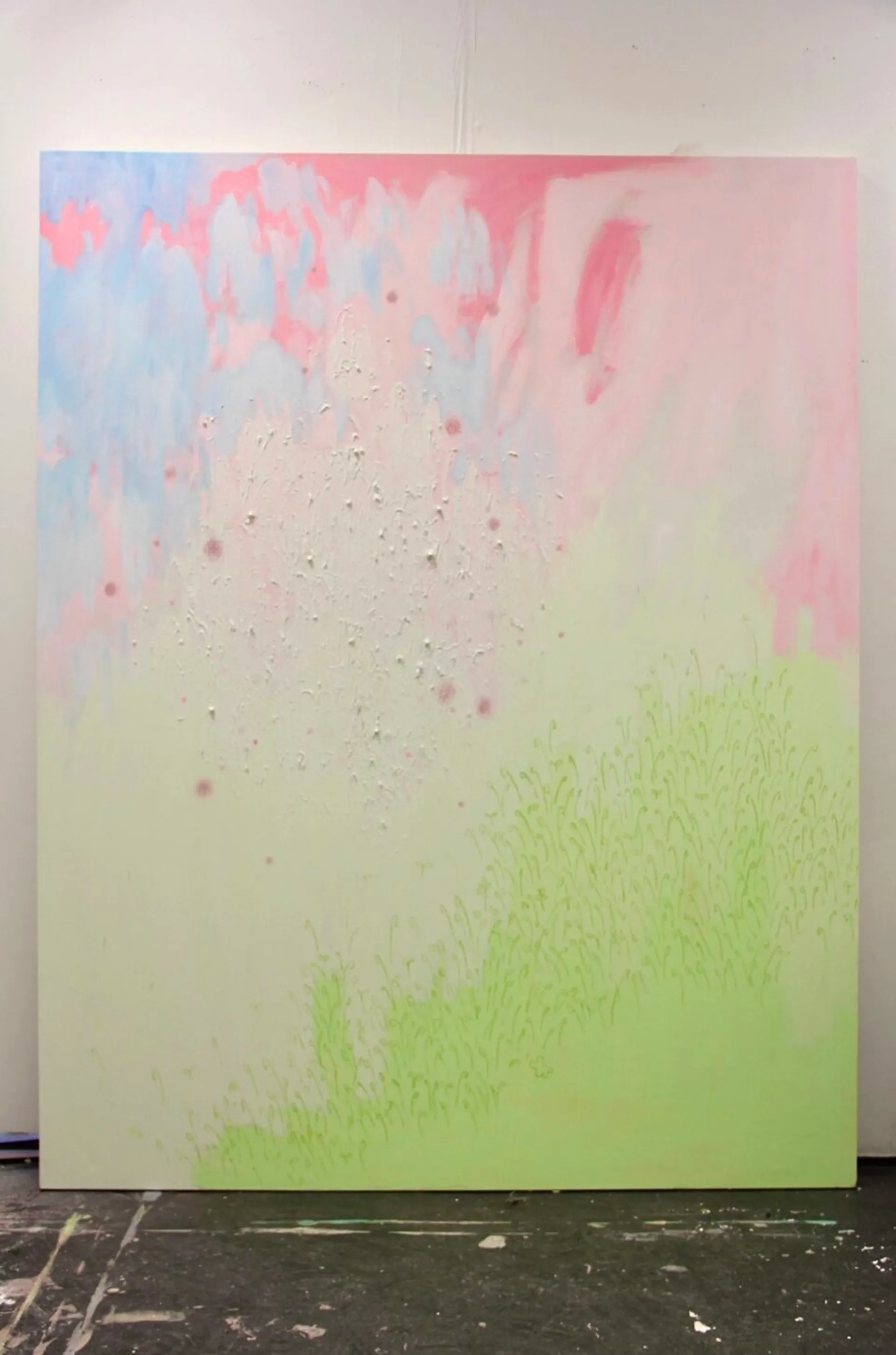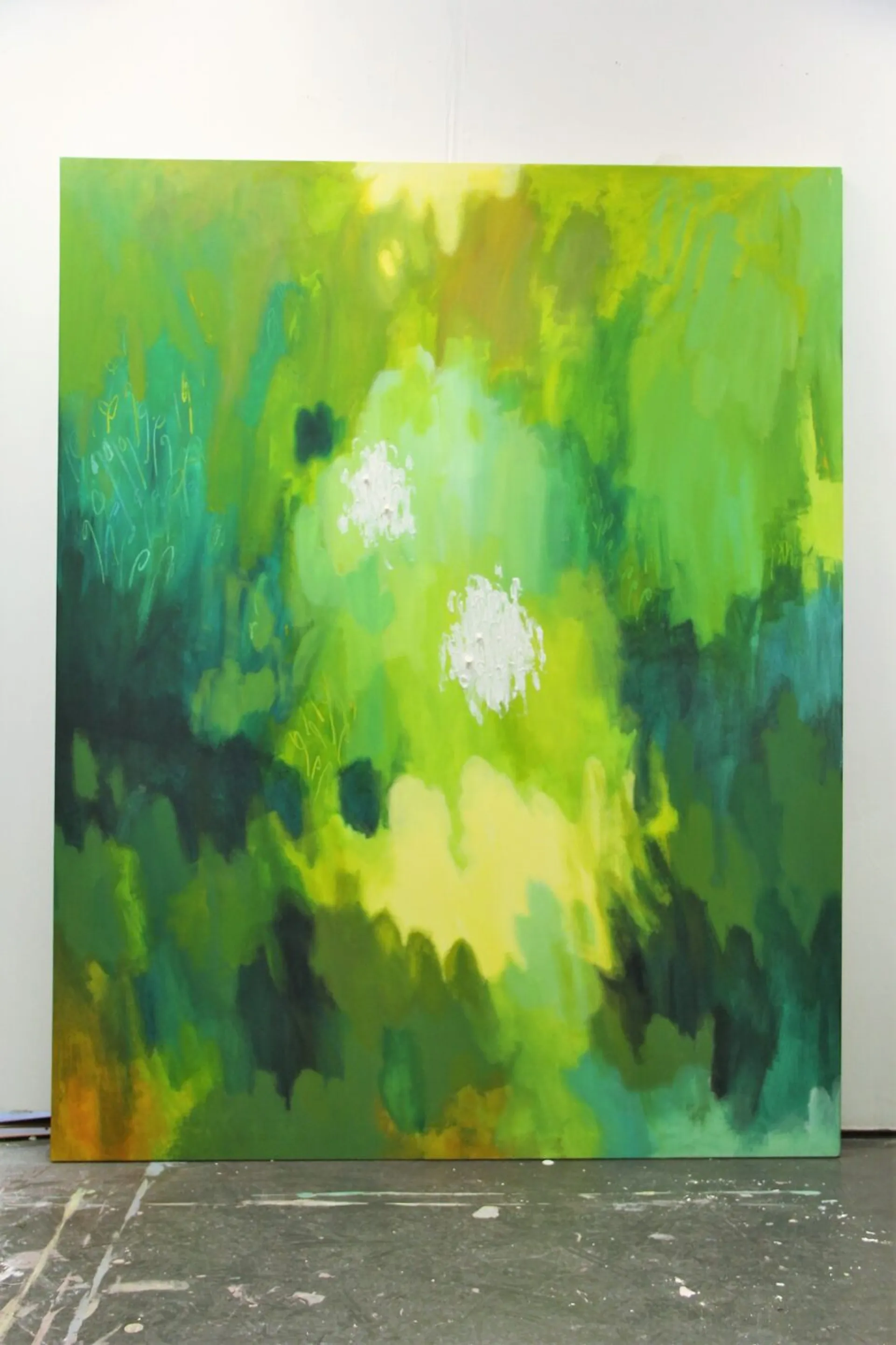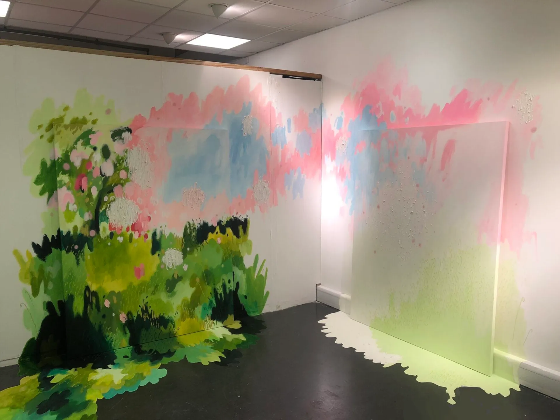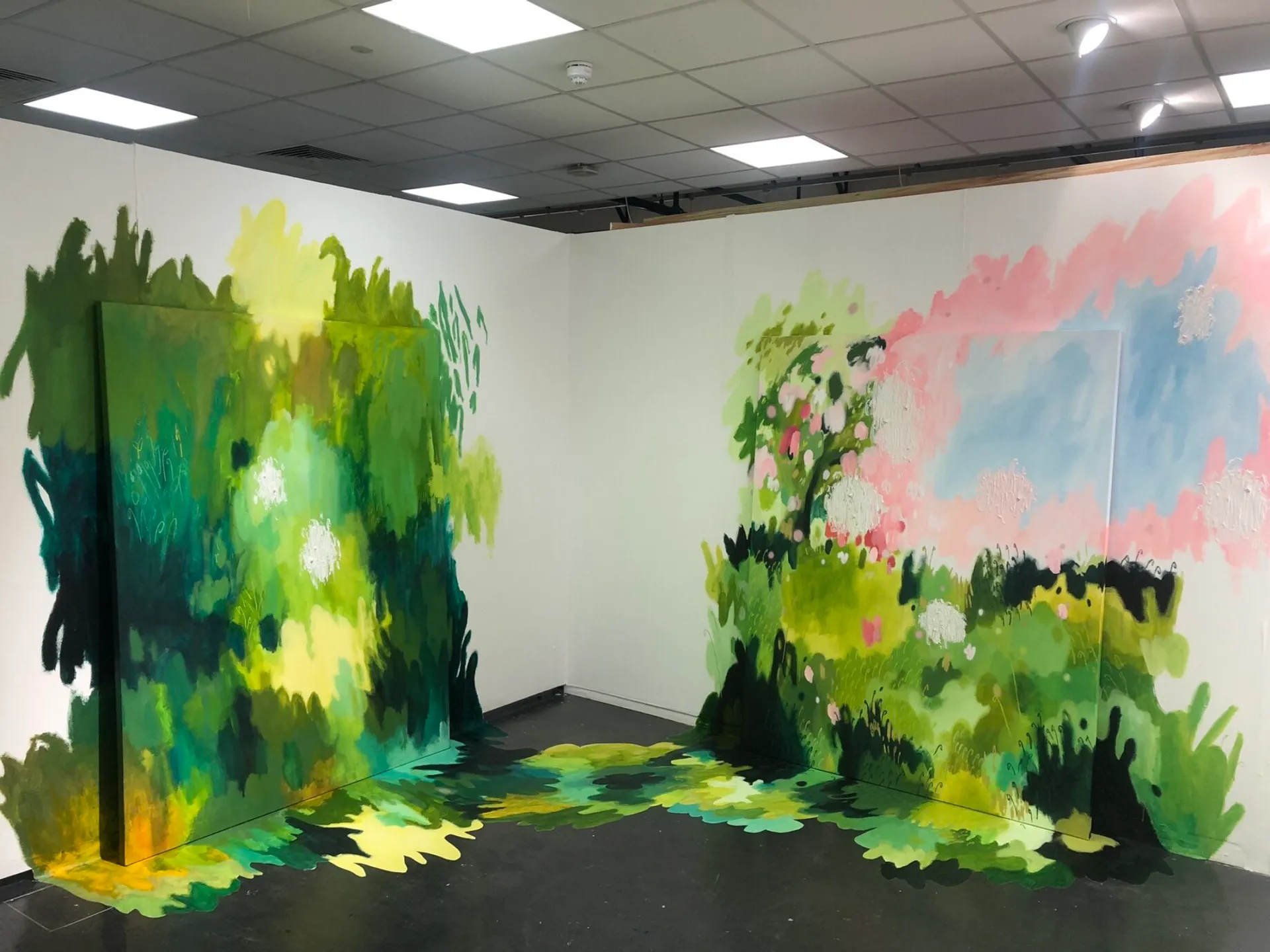 Most recently my work has been exploring scale to envelop the viewer, creating an otherworldly encounter, much like how nature and the paranormal present themselves to me. This goes as far as bleeding my work off the canvas and onto the surrounding walls, to further emphasise the idea that my paintings create more of an experience than exist simply as an image, representing fragments and relics of other worlds. Moreover, my degree show installation aims to displace my viewer to a space that speaks of permanence and nostalgia, in contrast to the actual area in which the work may be exhibited. Creating a distinct sense of otherness, grasping it viscerally with both hands and taming it to the point of habitability.