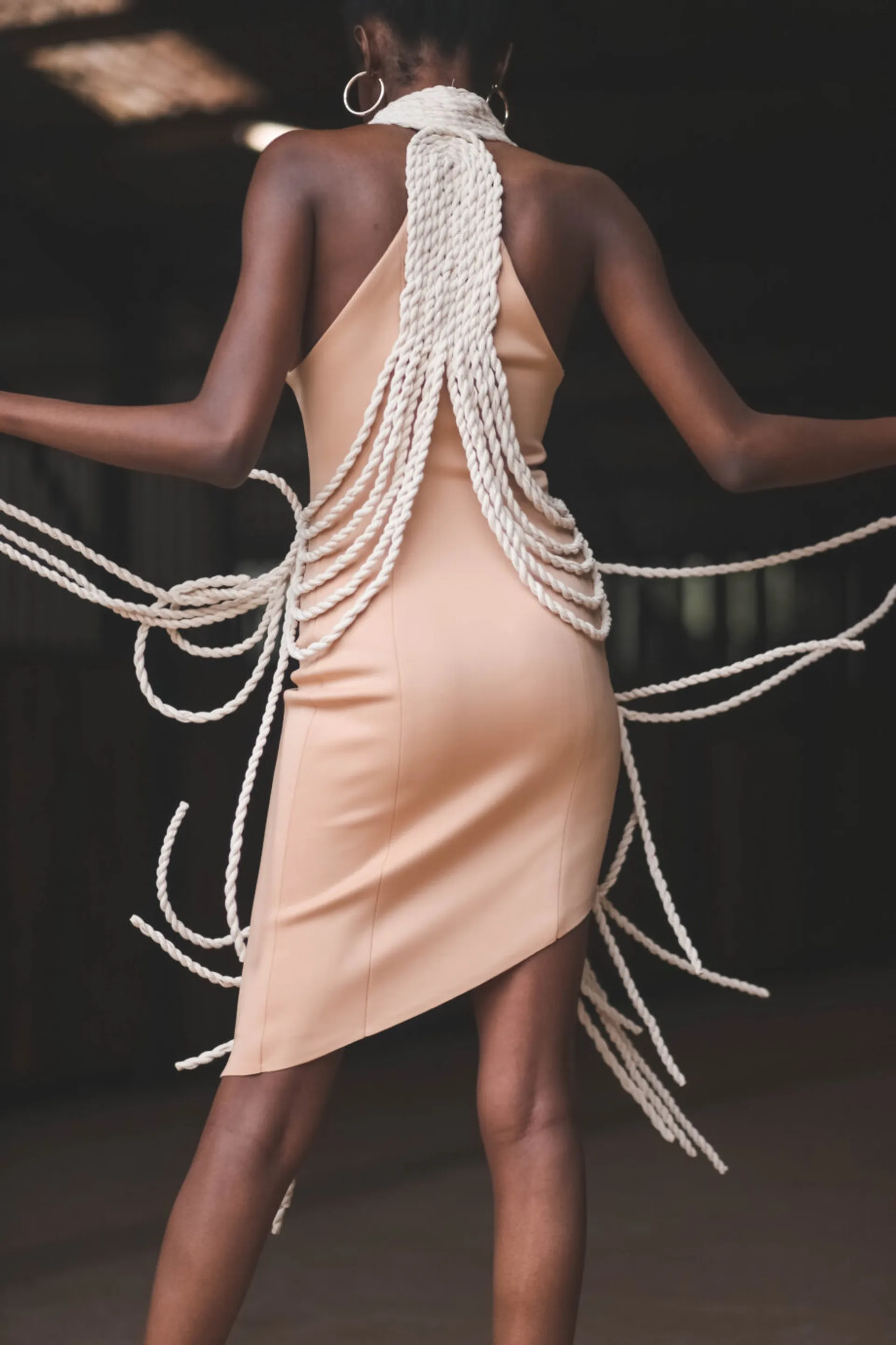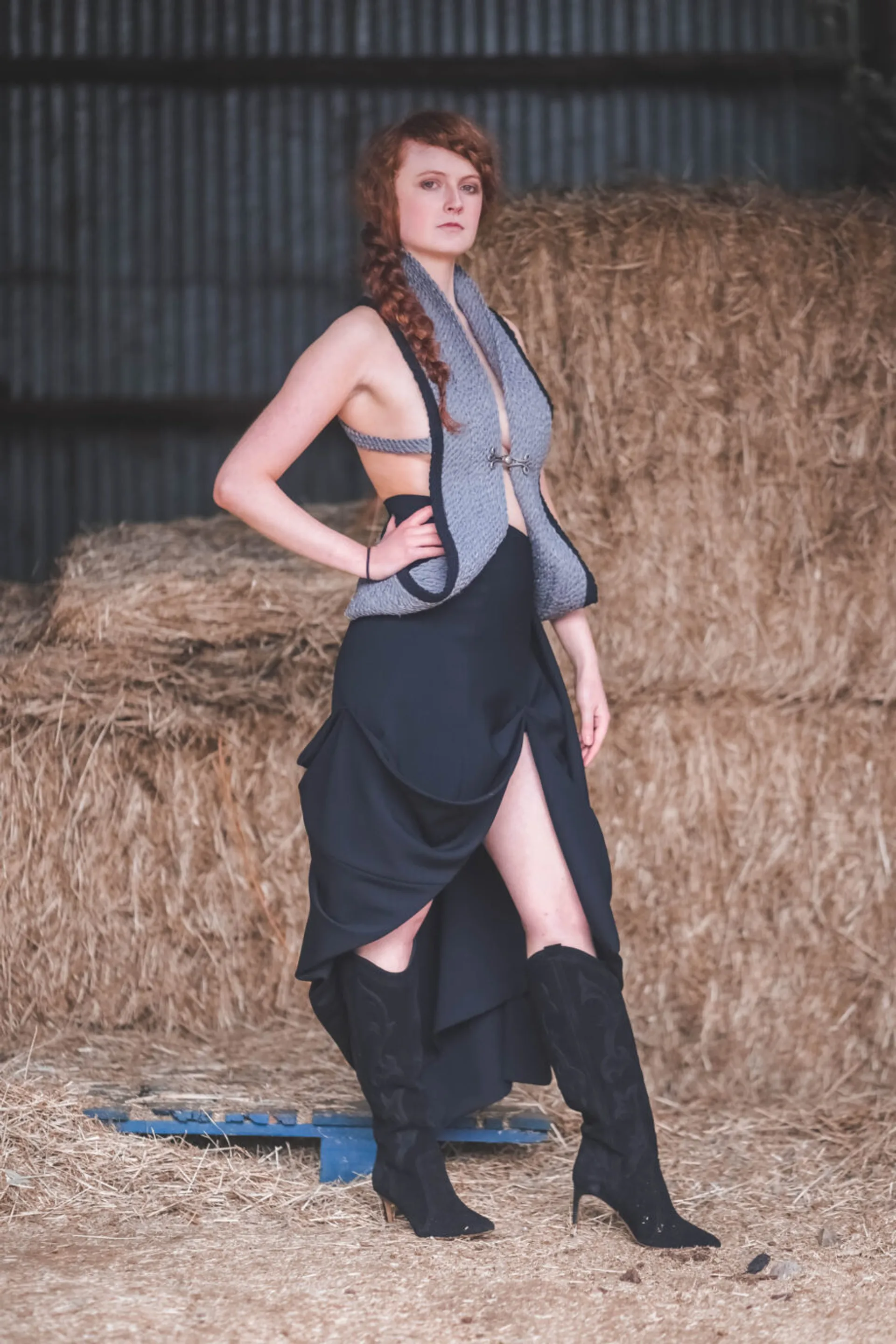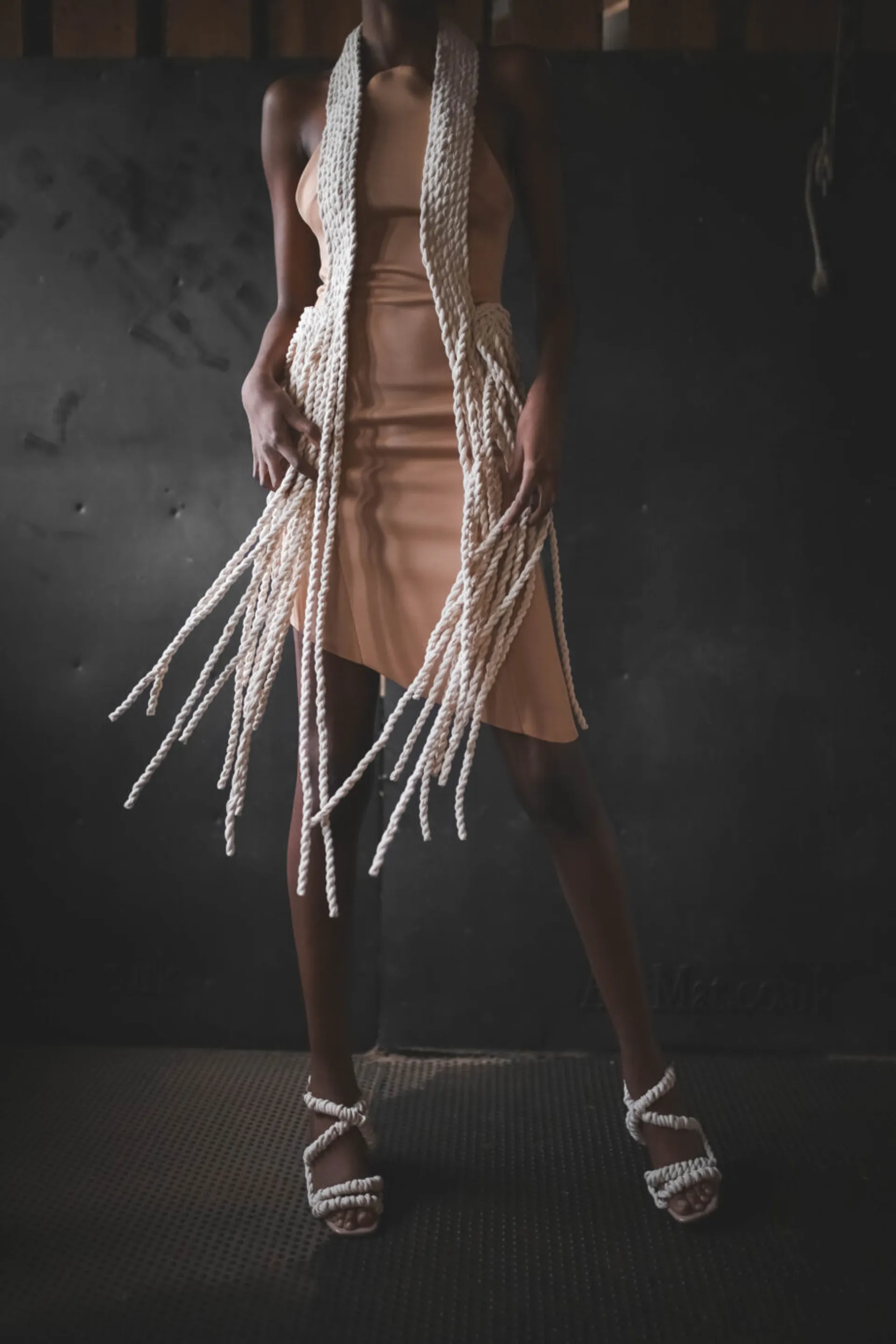 Drawing upon fashion influences from vintage western cowgirls and their use of lassos to control their horses, I have engineered a rope textile made from a range of materials which I have incorporated into my collection. The silhouettes of my garments are inspired by the fluid forms that can be achieved with rope together with the flexibility of a horse’s body, in particular the arc of the neck.