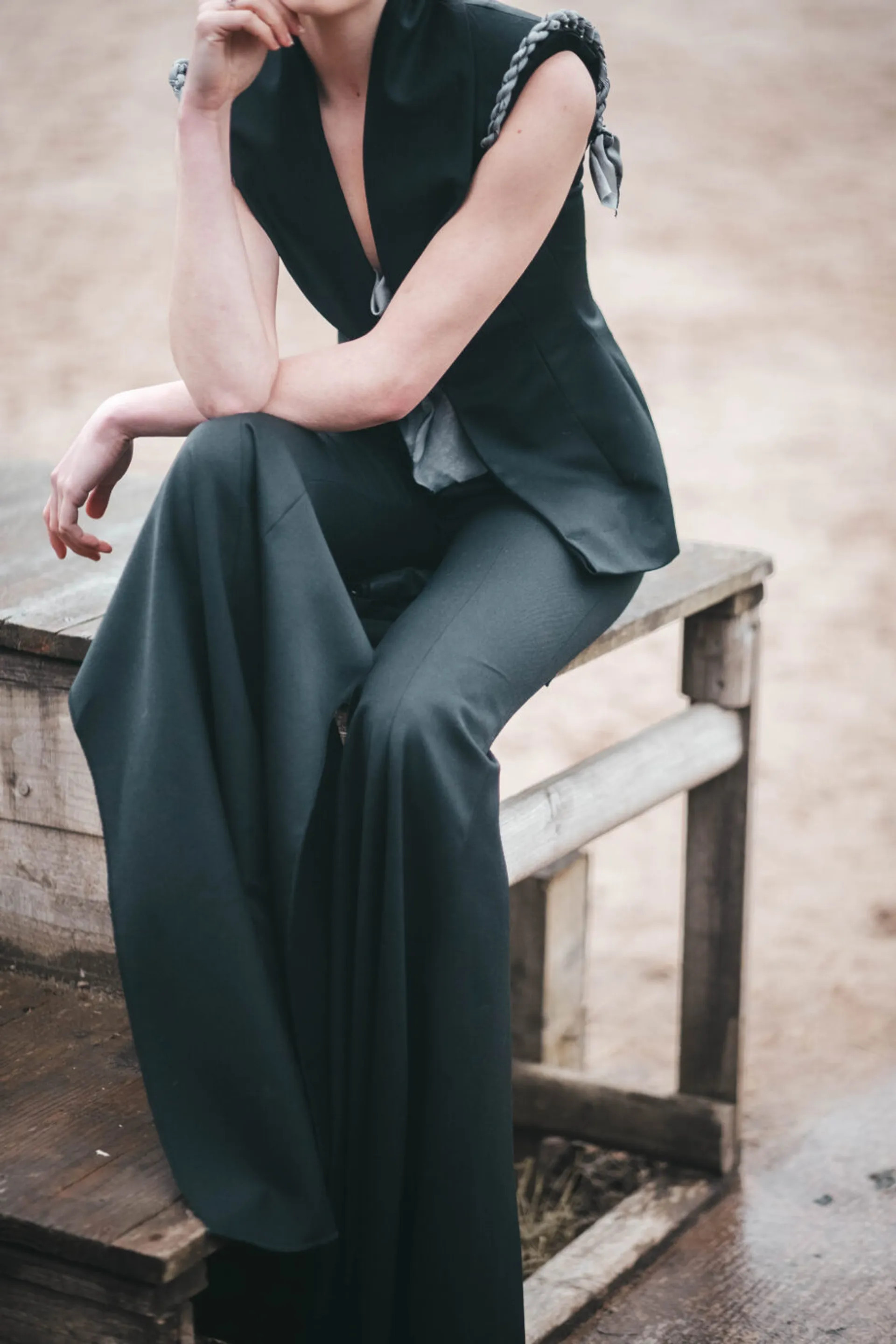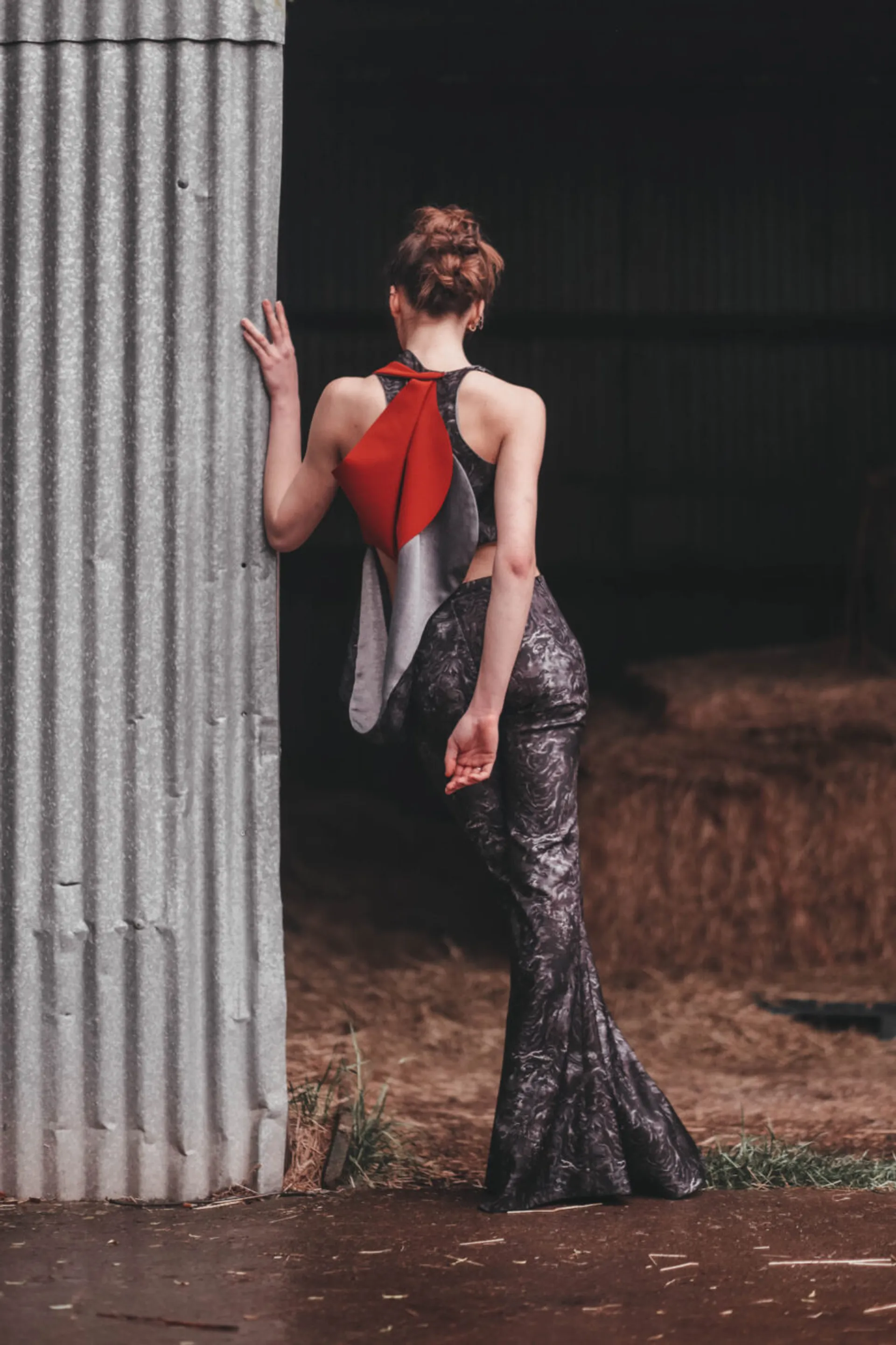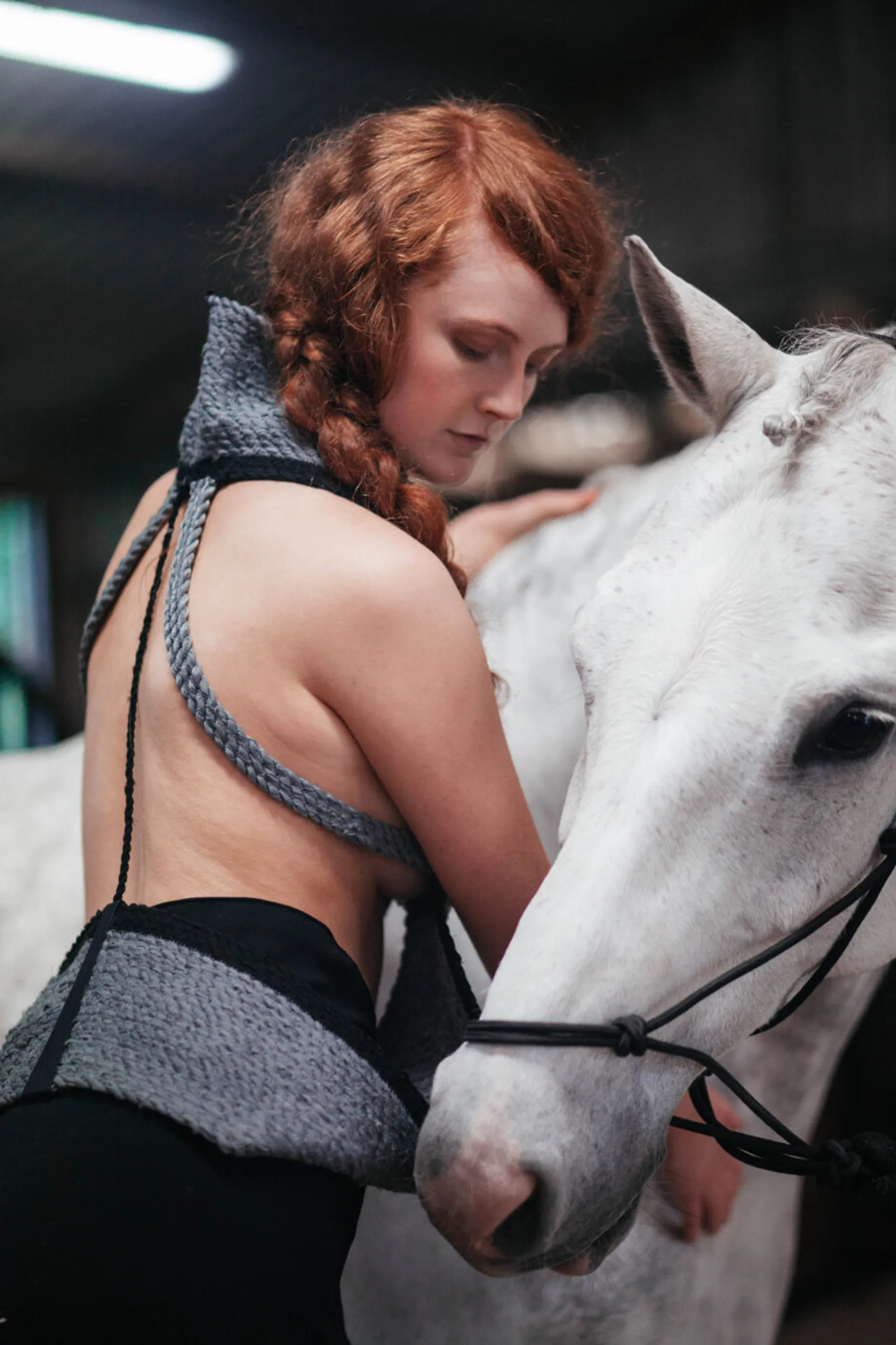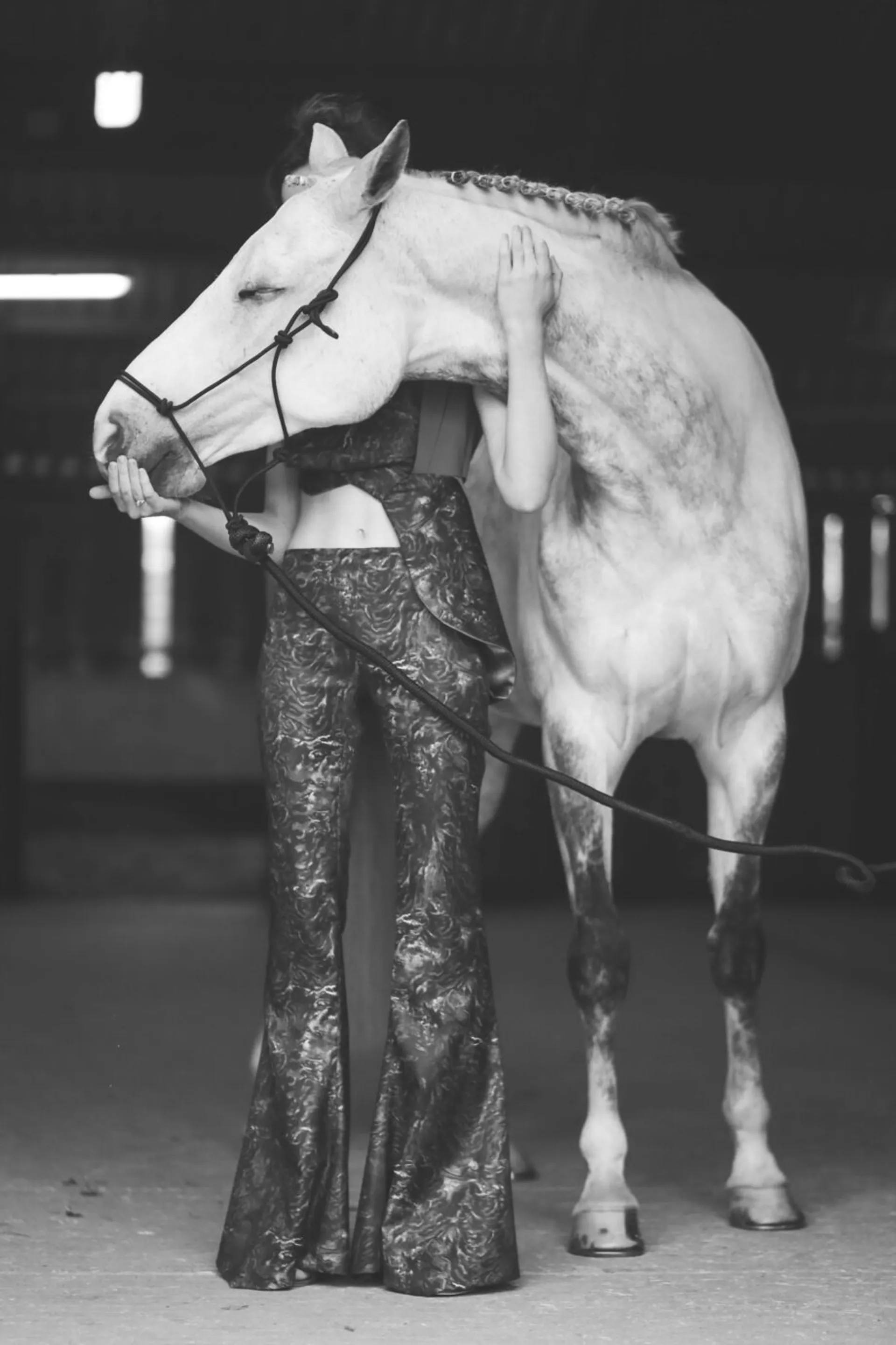 Drawing upon fashion influences from vintage western cowgirls and their use of lassos to control their horses, I have engineered a rope textile made from a range of materials which I have incorporated into my collection. The silhouettes of my garments are inspired by the fluid forms that can be achieved with rope together with the flexibility of a horse’s body, in particular the arc of the neck.