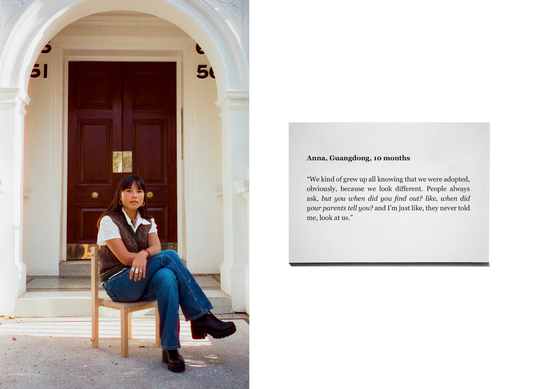 Little Chairs, Little Conversations is a 20-minute short film (to be released in 2024, with a 6-minute preview at the KSA Degree Show) and series of portraits set on the Chinese archetype of a ‘Little Chair’ to sit down and chat about the ways in which Chinese adoptees navigate life.