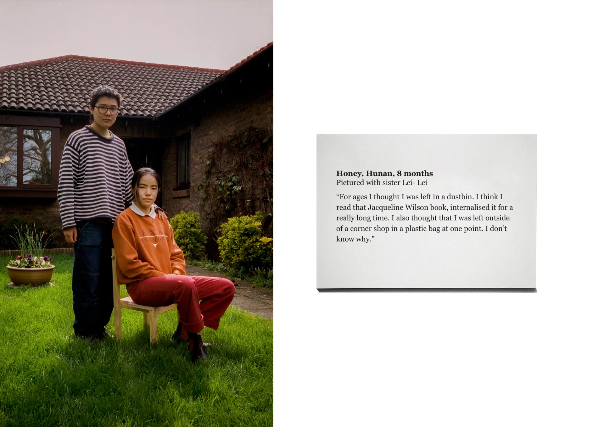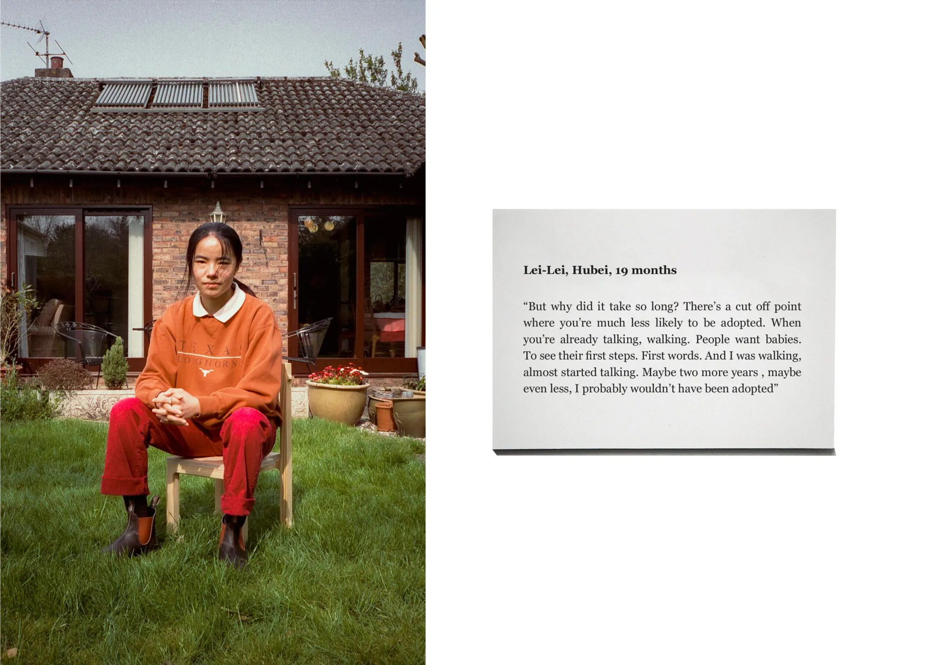 Adopted from China at the age of 8 months old, Honey Birch returned to her hometown on a finding trip in 2018. Whilst there, she saw little chairs scattered around the streets, outside homes, filled with old people sitting, eating, chatting, and watching the world go by. Through building two chairs of her own, taking influence from both Chinese and British design, Little Chairs, Little Conversations is an attempt to connect with her own experience of growing up Chinese-ish. The project stems from a frustration of not being understood, and wanting to talk with others with the same experience. Mirroring a life that could have been, the Little Chairs provides a space for conversation. Through connecting with 3 other adoptees about our experiences, similarities and differences, this project offers a glimpse of the lives of adopted Chinese diaspora.