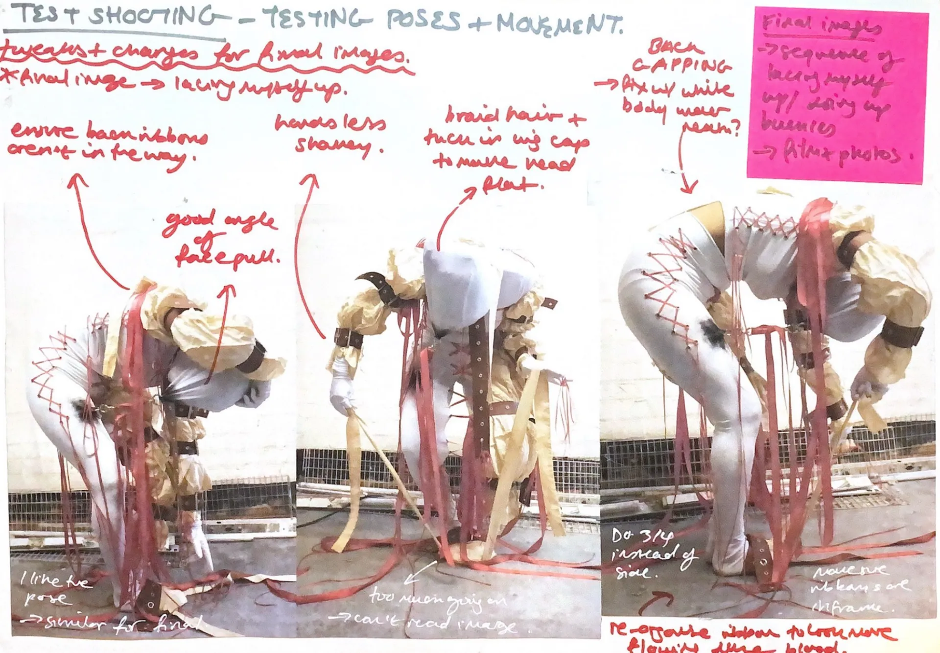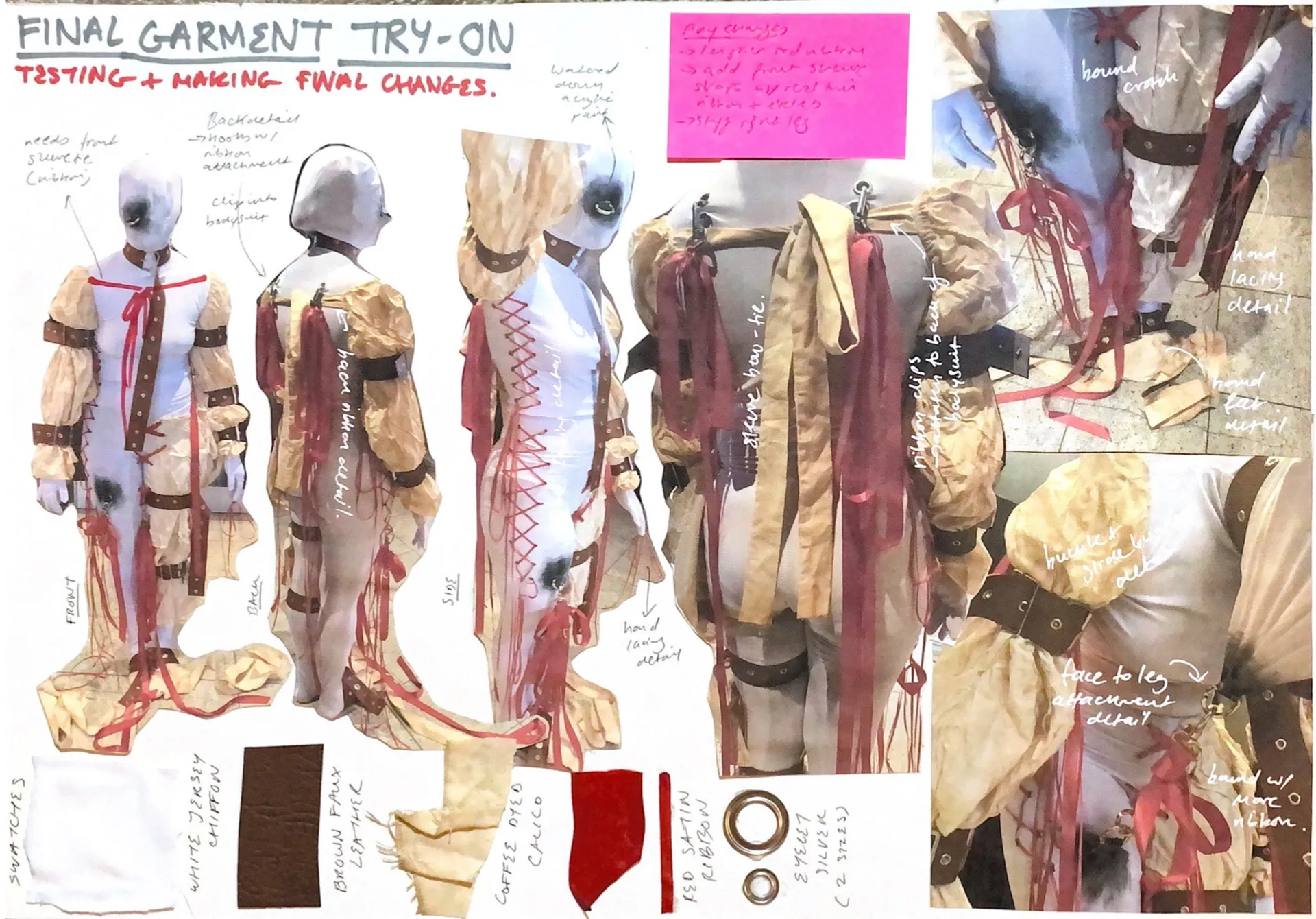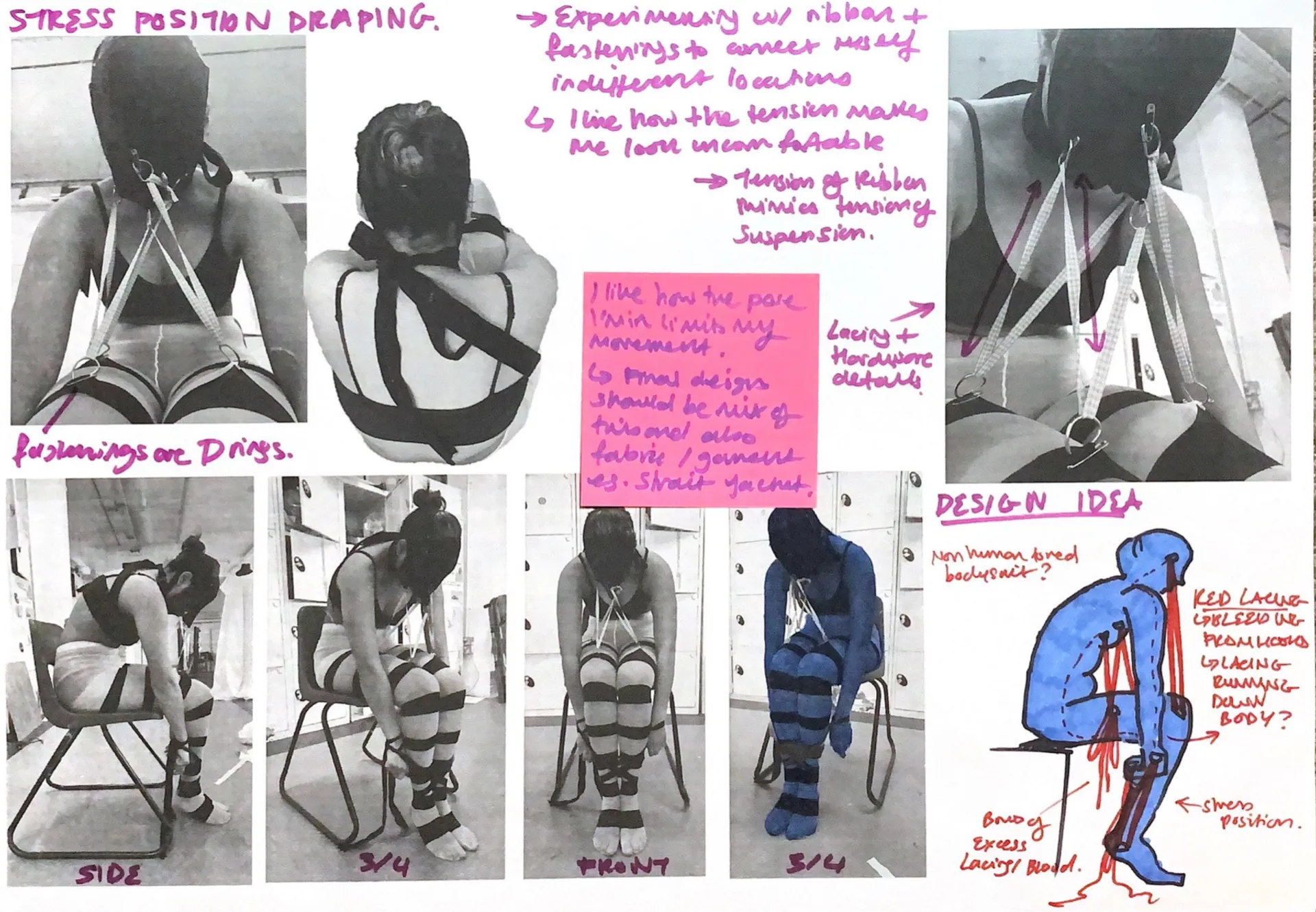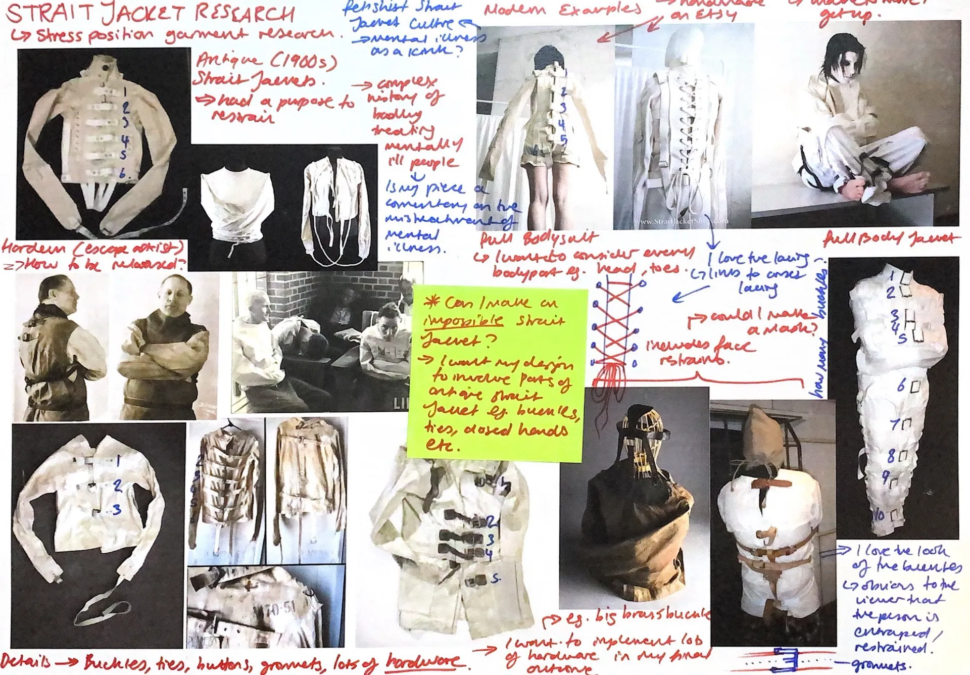 My research and testing includes looking at the mechanics of strait jackets, testing internal stress with torture positions, the making of the sleeves of my garment and my final garment try on.