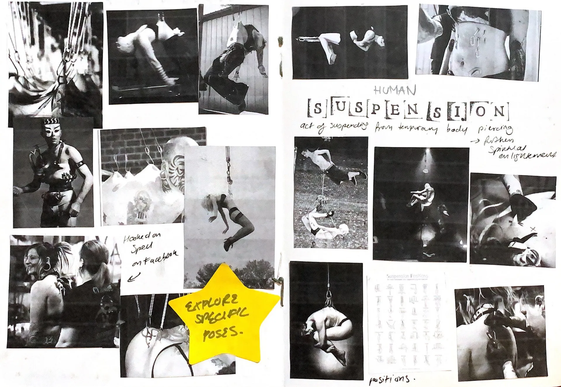 My final project explores the world of suspension piercing as a spiritual practice and an art form. I have been exploring controversial and misunderstood subcultures and wanted to show the beauty within the art of human suspension, which is seen as a barbaric and disturbing practice to most people. My research on suspension lead me to look at tension and internal stress within the body. I looked at strait jackets and torture positions as references on suspension within the frame of the human body, and my final design is inspired by the fastenings and mechanics of strait jackets. My final images have a serene and ethereal nature, to represent the euphoria that one experiences when being suspended by their skin.