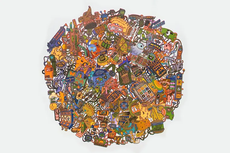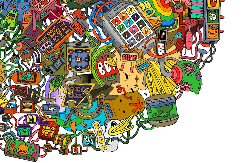 “MASS” represents the over-saturation of advertisements, information and the push to consume that is inherent in society. My outcome consists of a series of 4 layer CMYK Risograph prints of a digitally drawn illustration representing the density and complexity of life that surrounds us, taking a surrealist and dystopian approach based on my findings. Alongside this, I created a series of digitally edited versions of my piece, stitched into a video, with a soundtrack designed to communicate my tone.