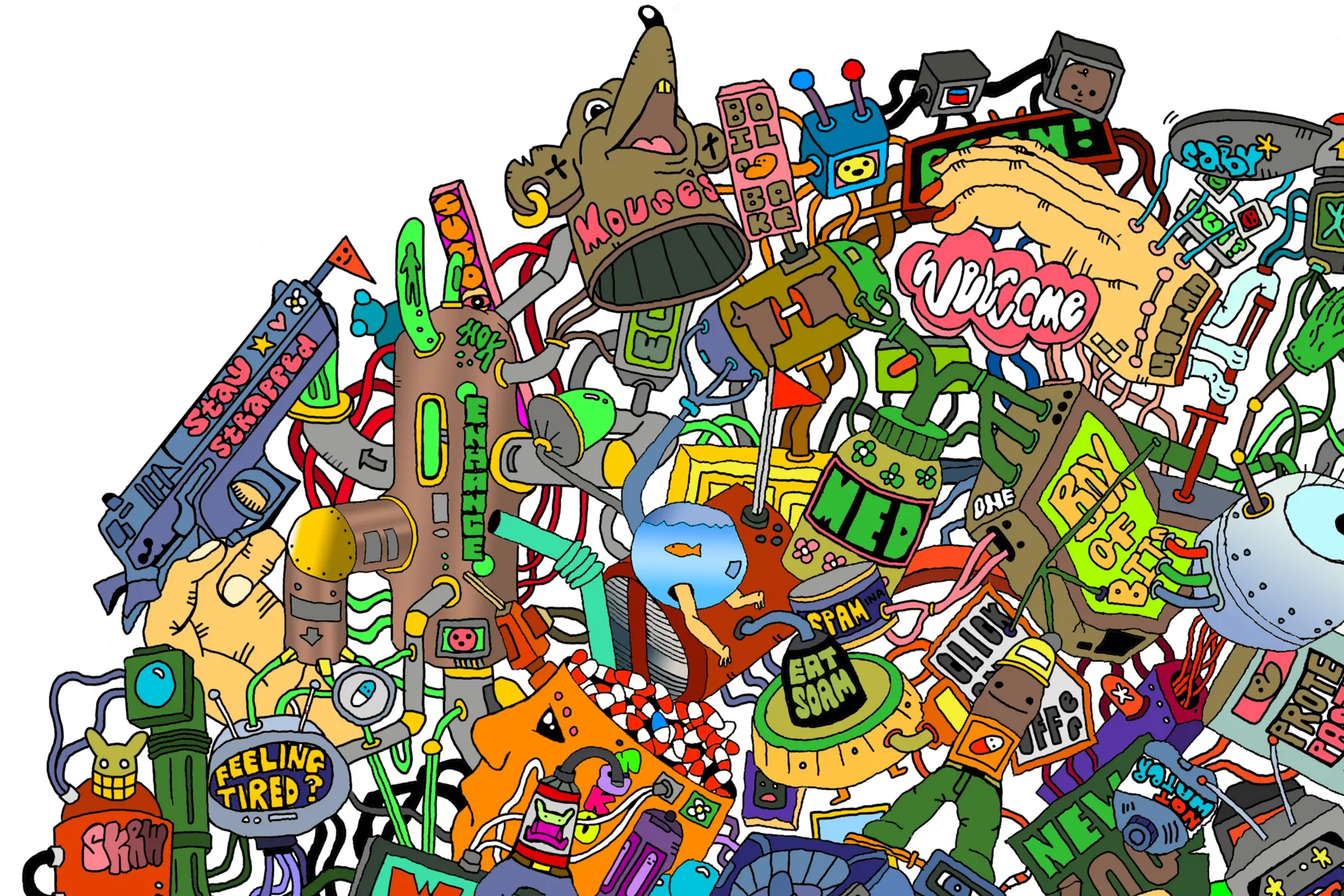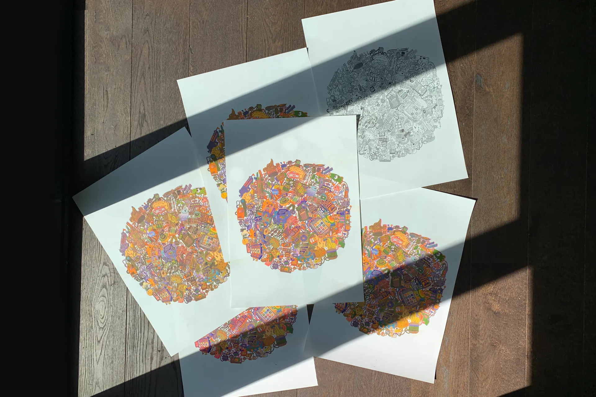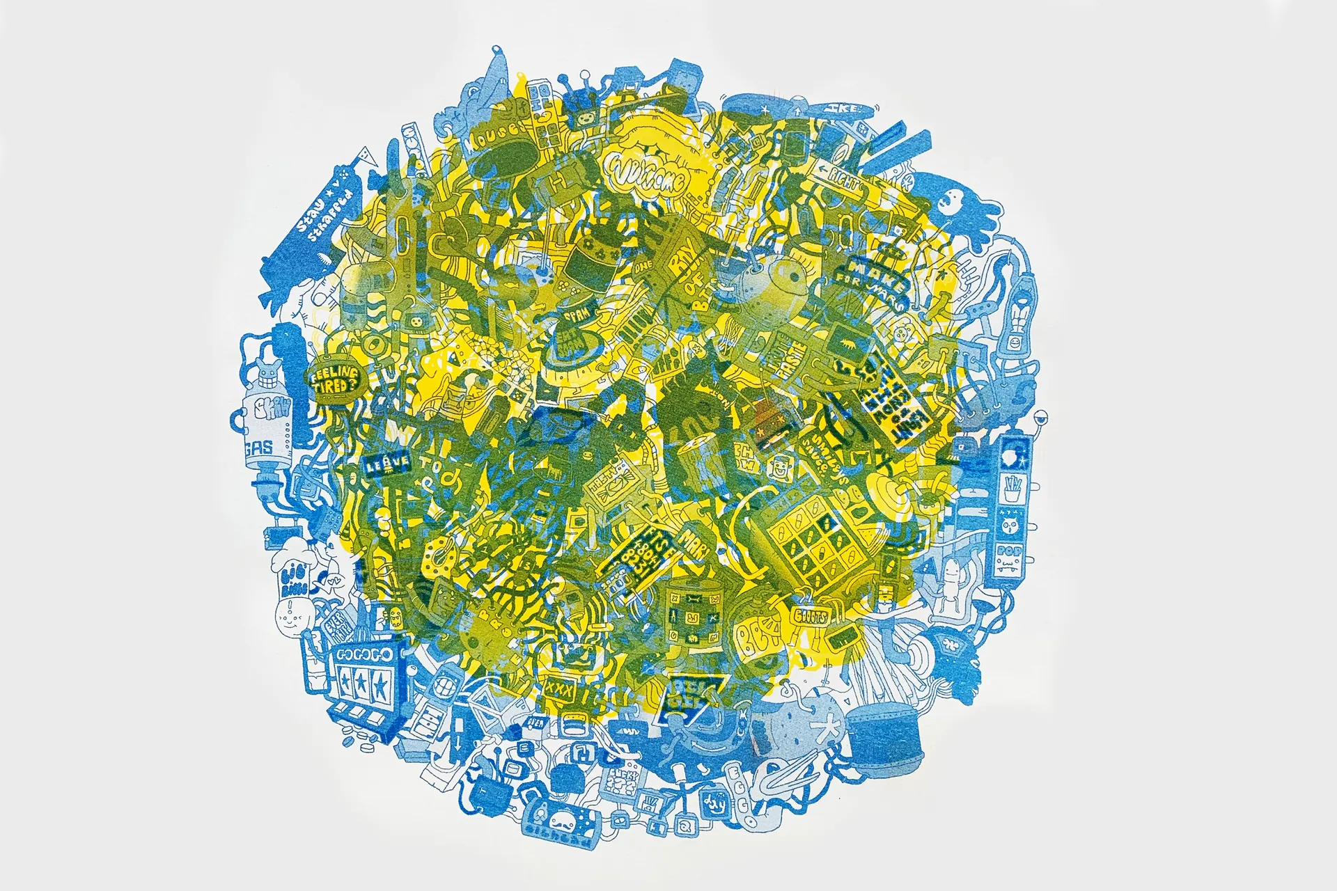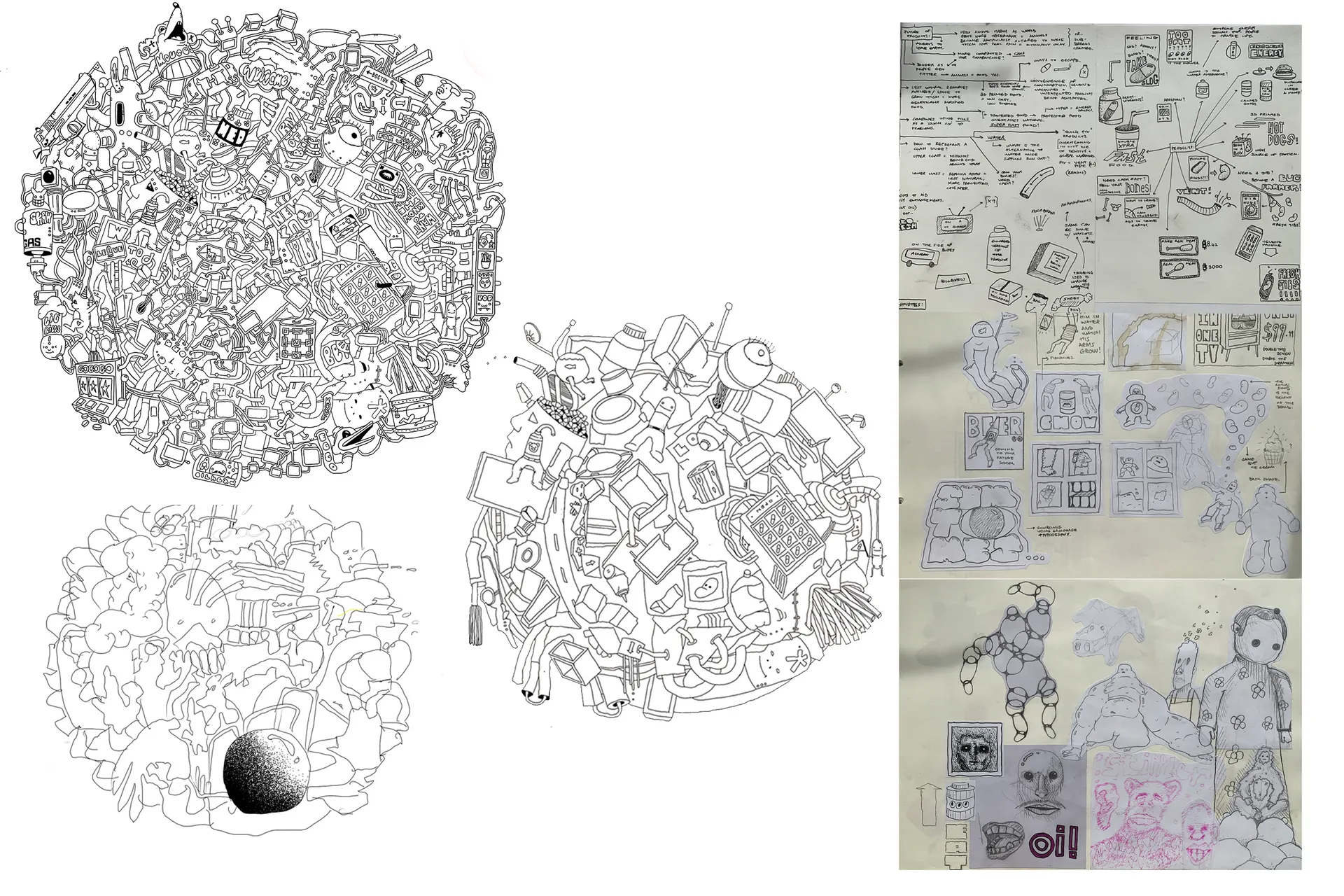 “MASS” represents the over-saturation of advertisements, information and the push to consume that is inherent in society. My outcome consists of a series of 4 layer CMYK Risograph prints of a digitally drawn illustration representing the density and complexity of life that surrounds us, taking a surrealist and dystopian approach based on my findings. Alongside this, I created a series of digitally edited versions of my piece, stitched into a video, with a soundtrack designed to communicate my tone.