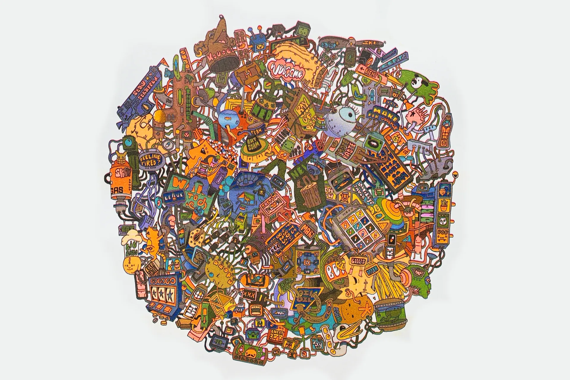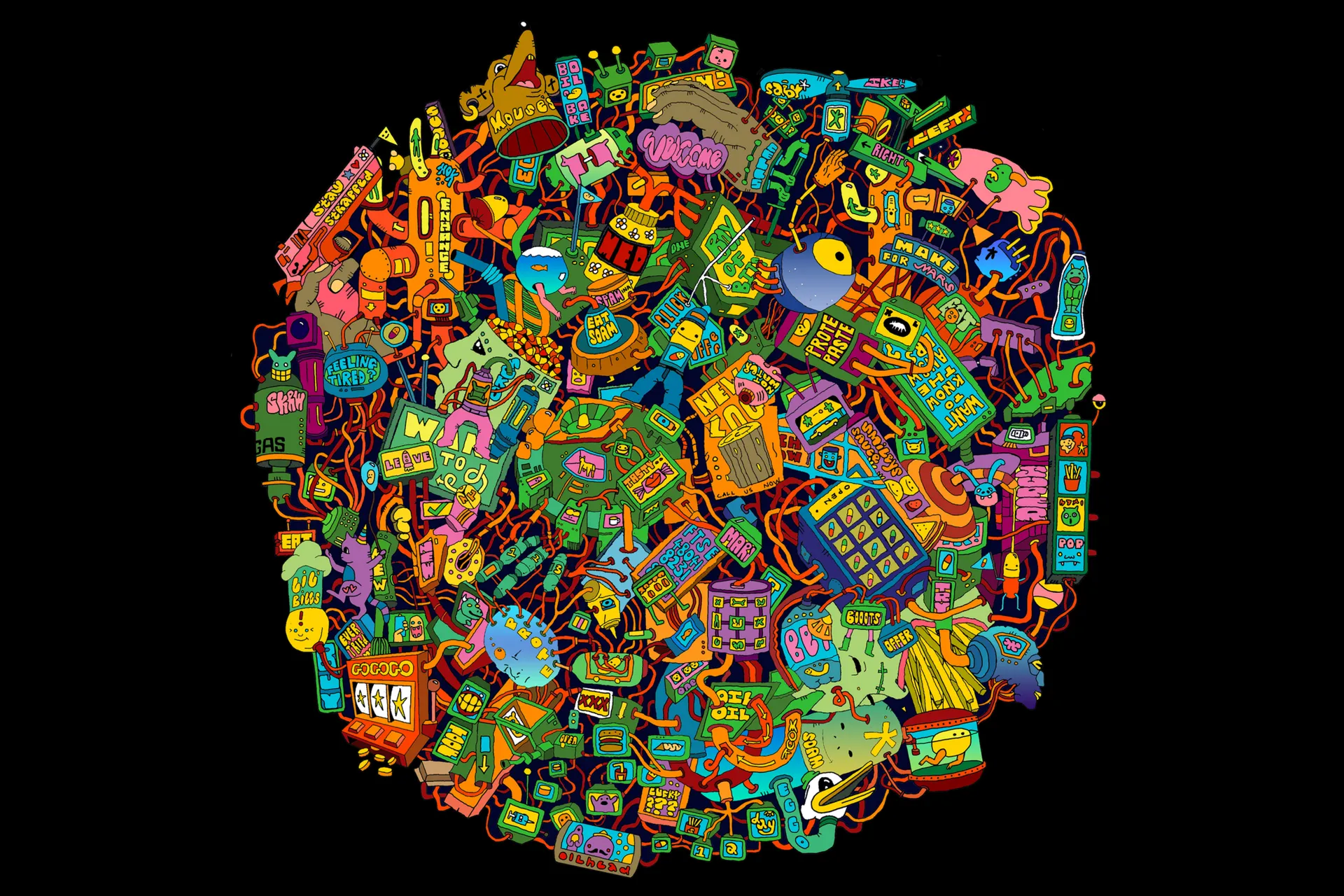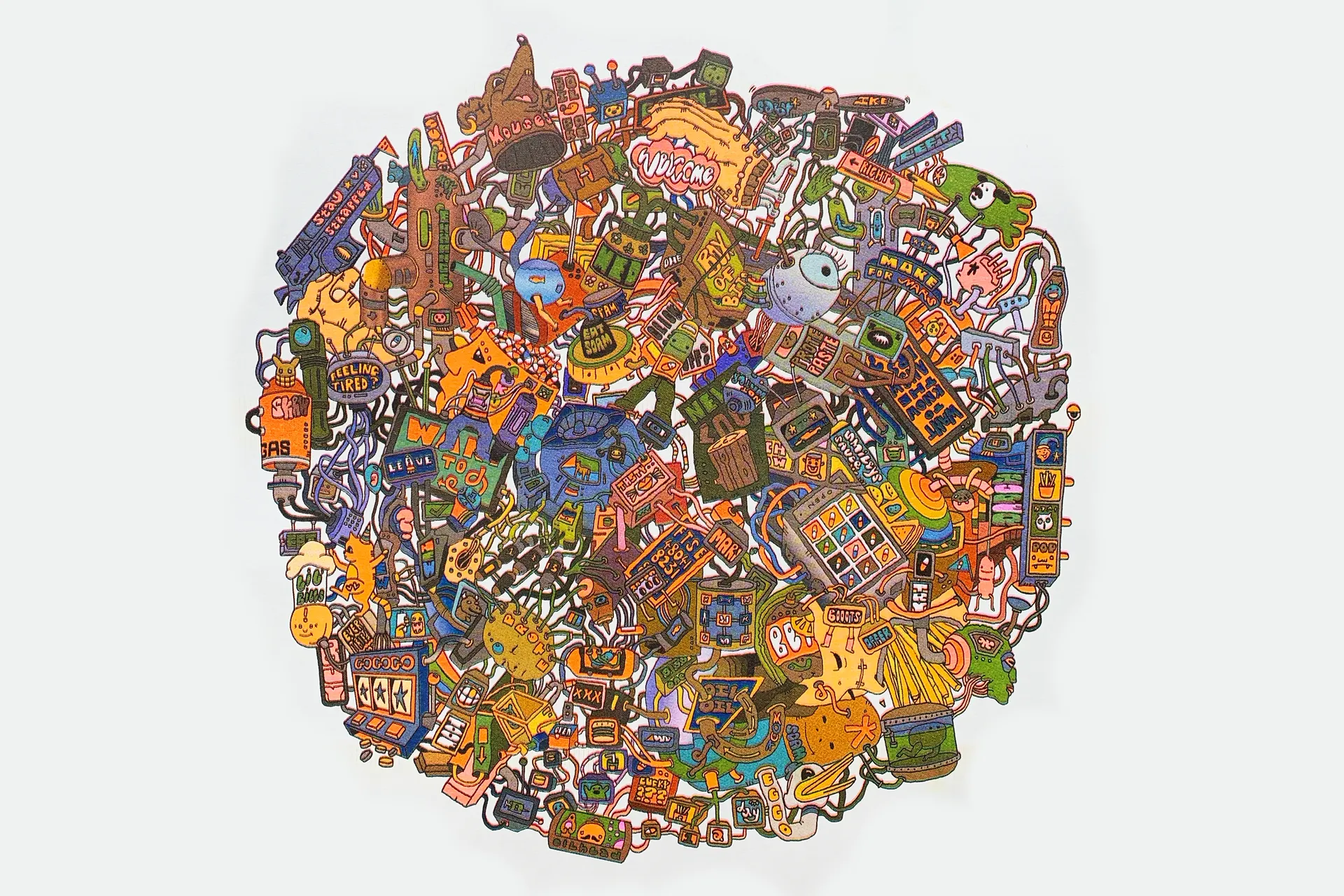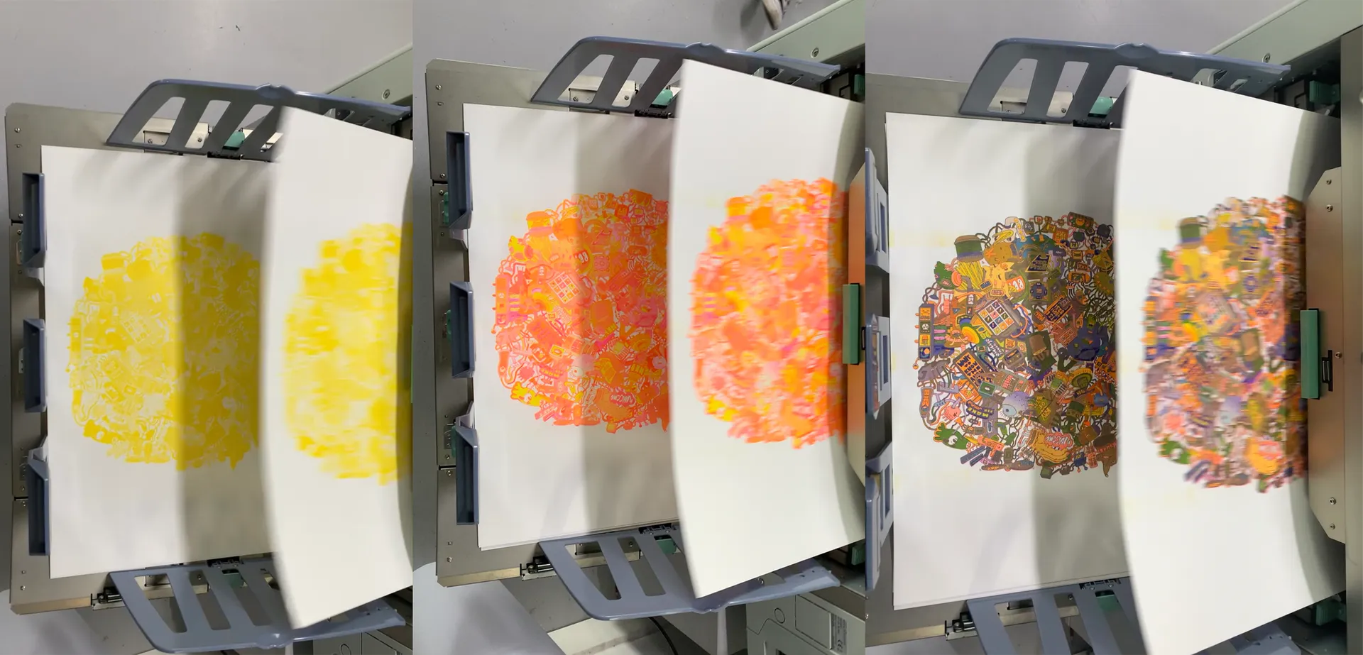 “MASS” represents the over-saturation of advertisements, information and the push to consume that is inherent in society. My outcome consists of a series of 4 layer CMYK Risograph prints of a digitally drawn illustration representing the density and complexity of life that surrounds us, taking a surrealist and dystopian approach based on my findings. Alongside this, I created a series of digitally edited versions of my piece, stitched into a video, with a soundtrack designed to communicate my tone.