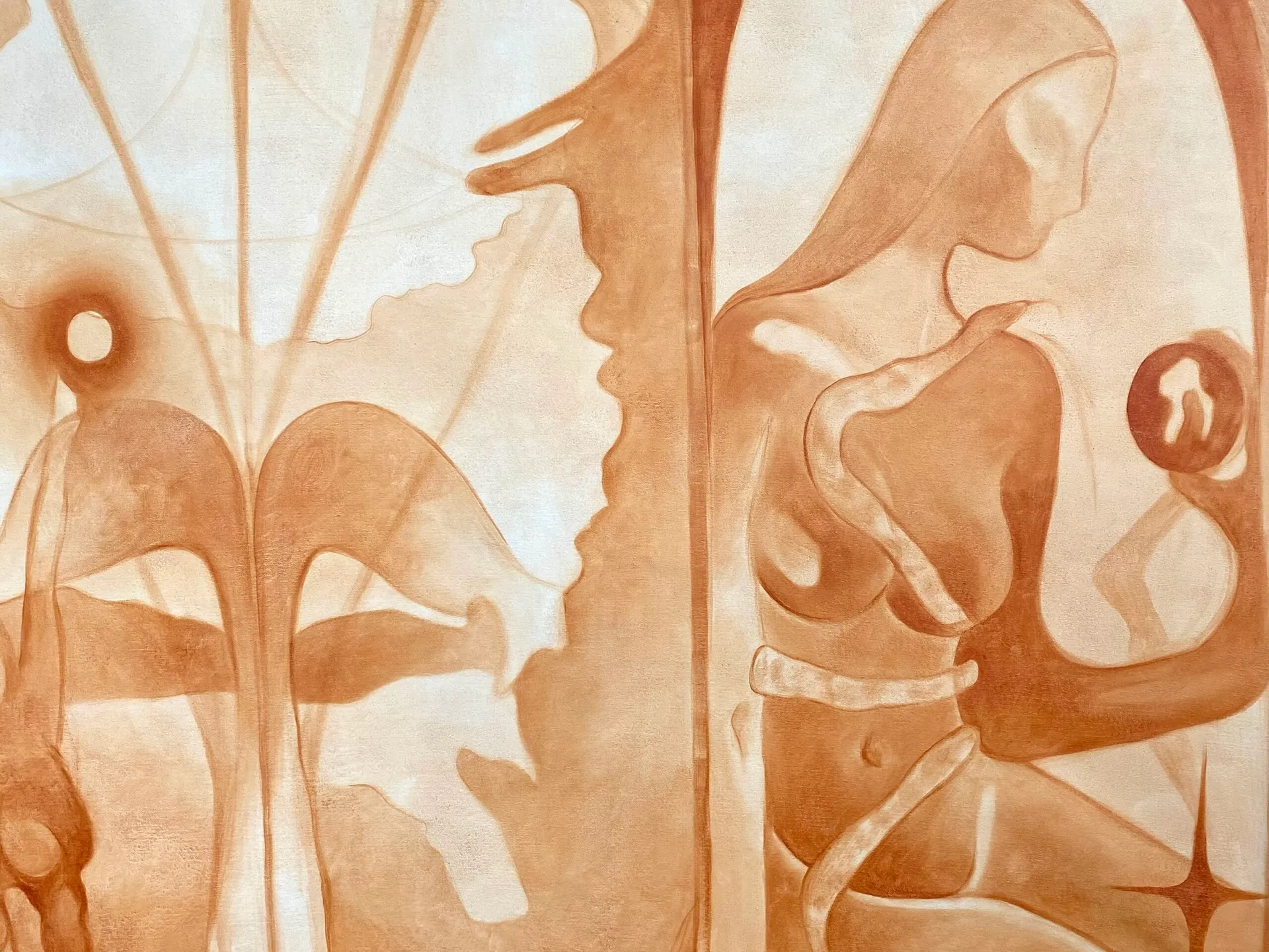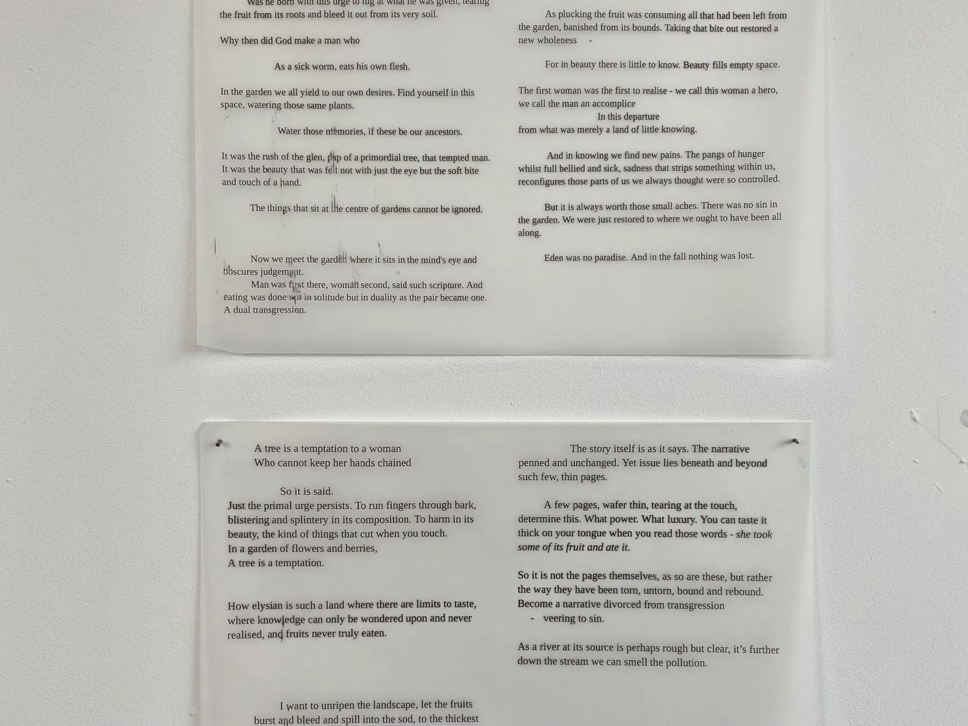 My work, ‘Fall Sequence’, attempts to bring the Edenic landscape back into a contemporary sphere for re-evaluation , visually conveying the three states of man pre, during, and post fall. My research concerned an array of origin stories involving women from the Enuma Elish and Pandora’s Jar, yet I was drawn back again and again to Genesis as the manifestation of the power of creation narratives to uphold dangerous ideas around gender, as I believe many creation myths unfairly pigeonhole women as the bringers of so called ‘original sin’. I strive to marry narrative painting and text in my work, and doing so here, I provide a feminist reading of the Bible, suggesting that original sin liberated man from ignorance, as opposed to bringing about evil in the world. We can thus see Eve as a hero, and Paradise as a mere illusion.