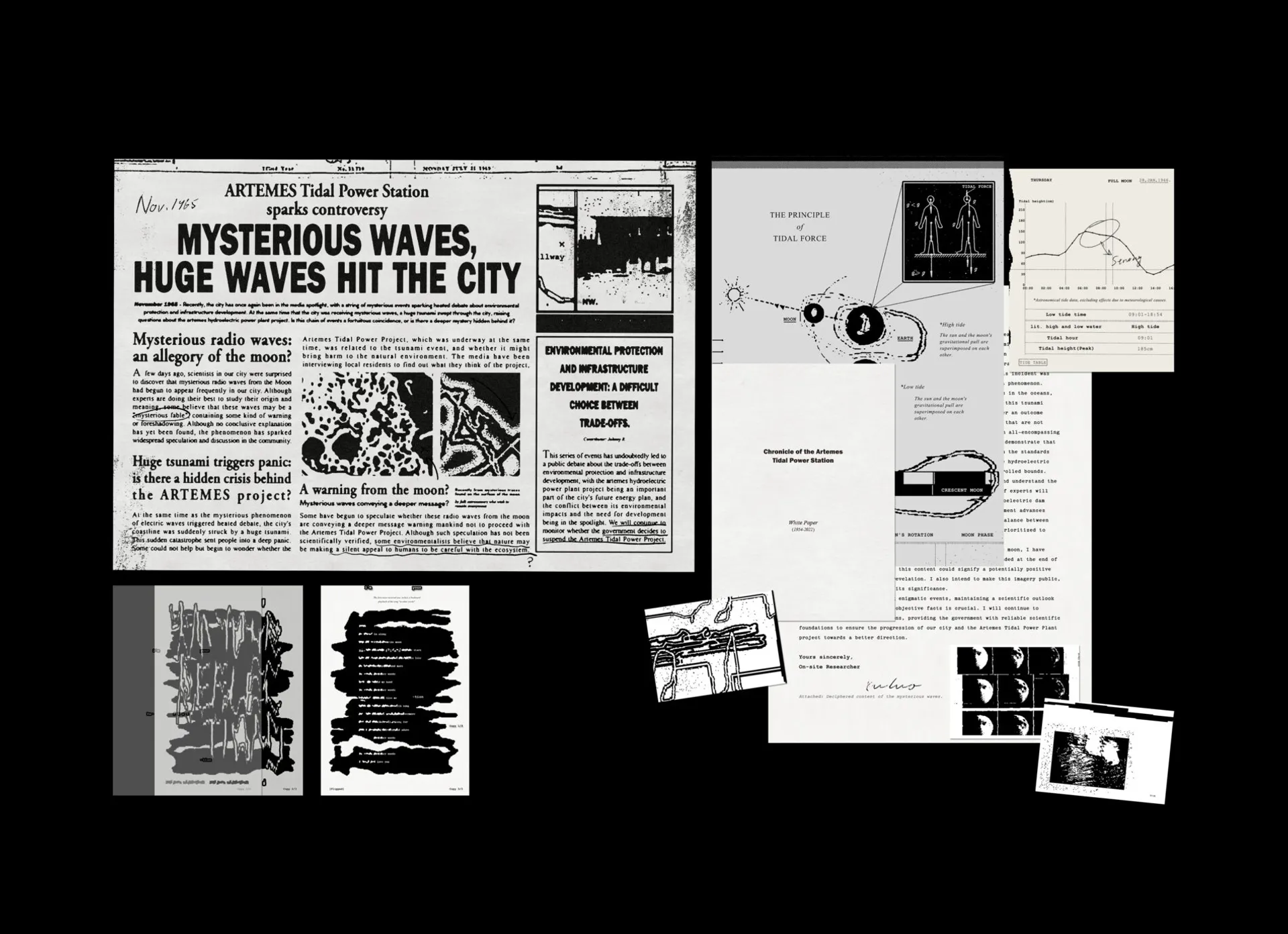 The author, starting from the purpose of human use of tidal forces, uses visual storytelling to present the moon and the connection between humanity and a hydroelectric station (a human achievement). The story of this project takes place in a parallel timeline against the backdrop of the “Space Race” of the last century.