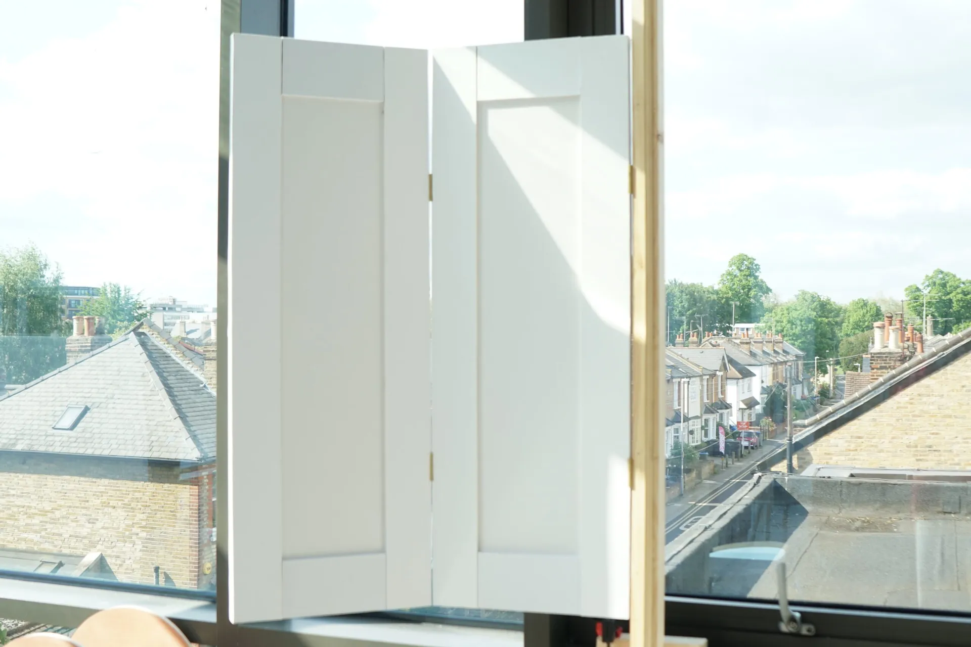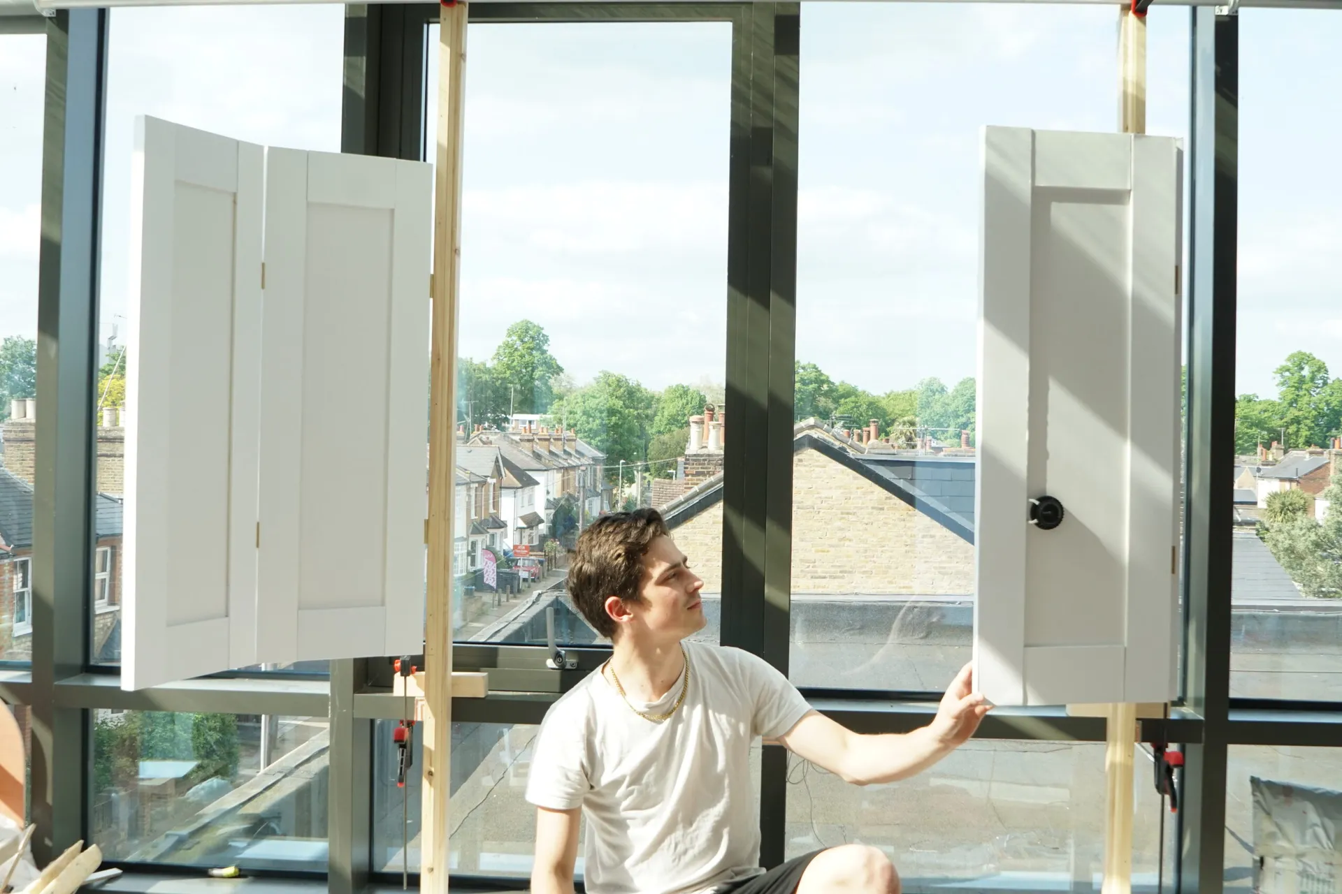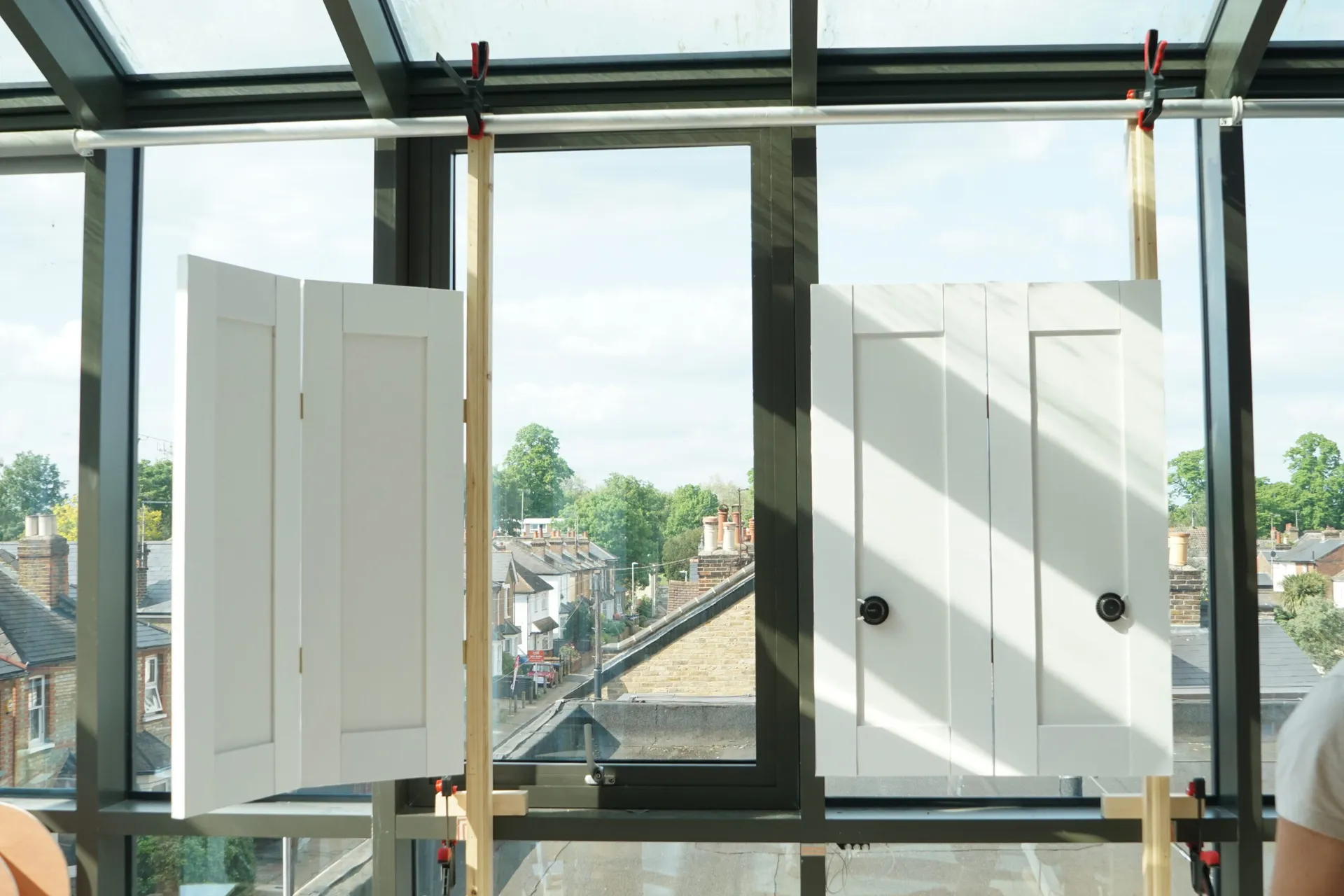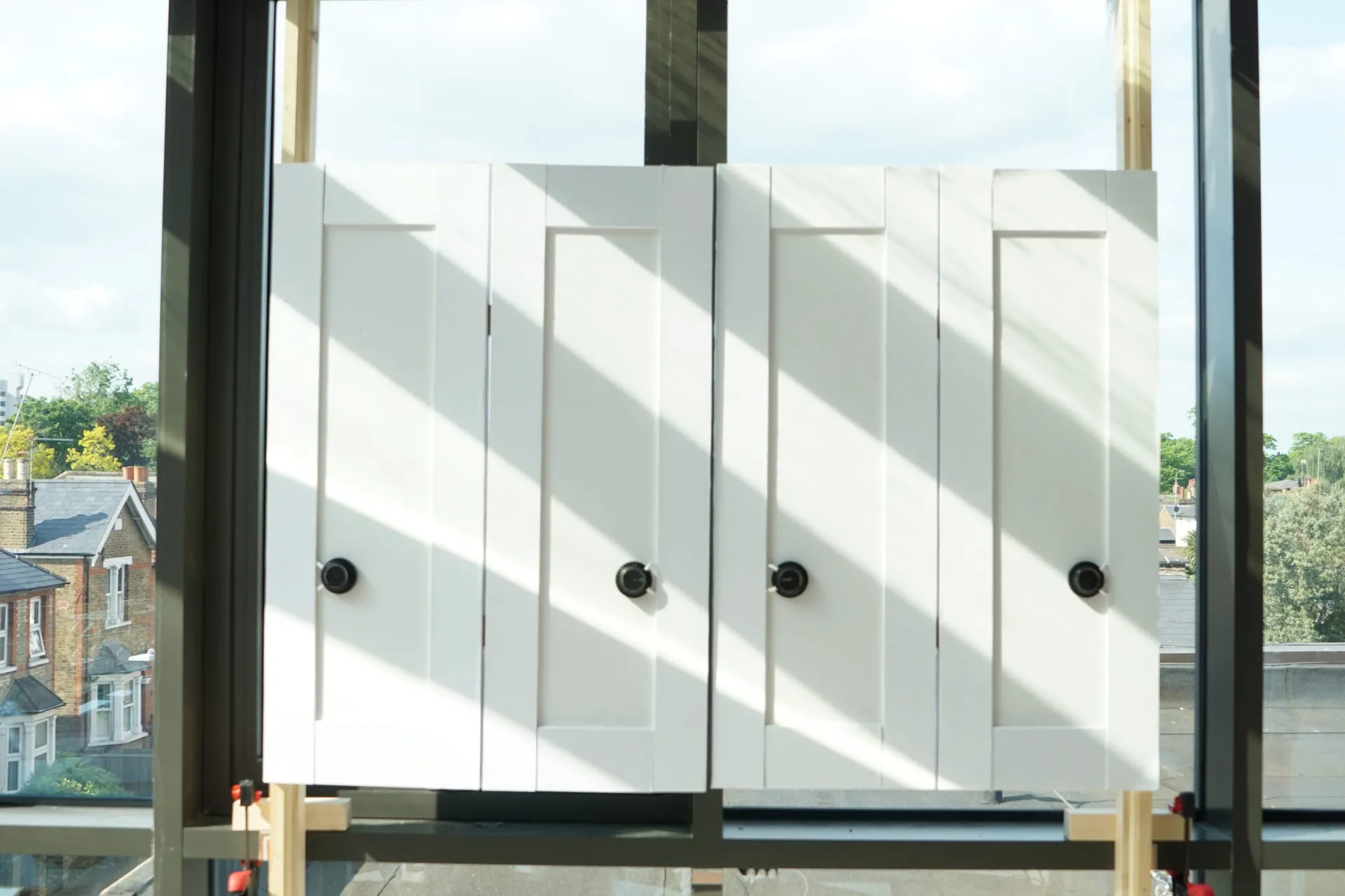 The second project offers an alternative take on traditional home speaker systems. By blending speakers in with an architectural feature found in many houses, window shutters. They utilise audio exciters to vibrate each of the 4 panels independently to create a large sound system with full directional control. The panels are made from a 10mm honeycomb cardboard panel at the centre, with a shaker-style border made from various laminated paper materials. These trim pieces improve the sound by greatly increasing the rigidity of the panels, while adding minimal weight. They greatly improve the durability and fully conceal the copper tape wiring. Power is transferred to the exciters on the faces by adhesive copper tape, and between panels via the drawn brass hinges, creating a fully wireless aesthetic. The use of hinges in DML speaker panels is unique to my project, the final prototype is intended to showcase the functionality of this discovery, rather than delivering a fully production-ready product.