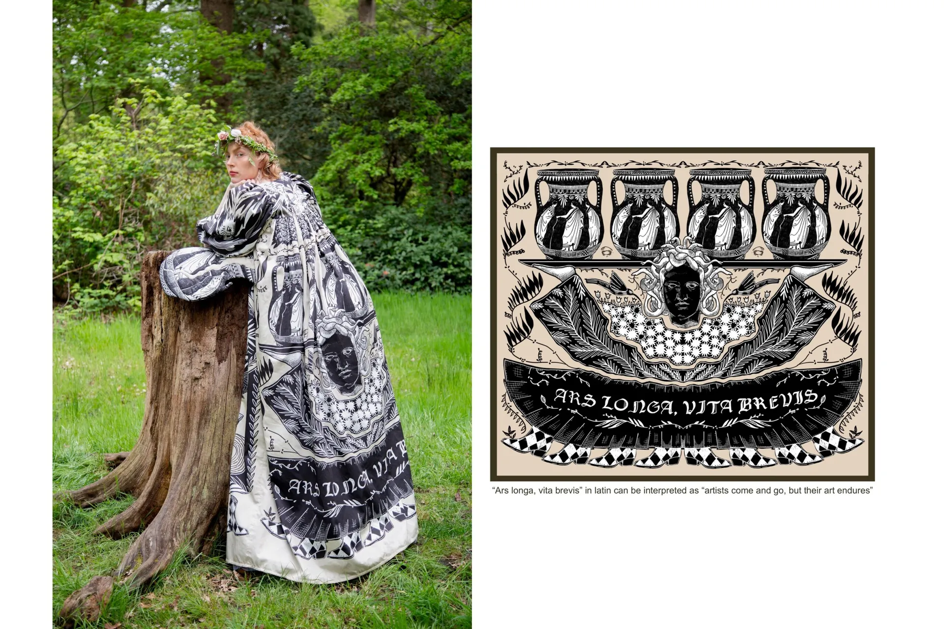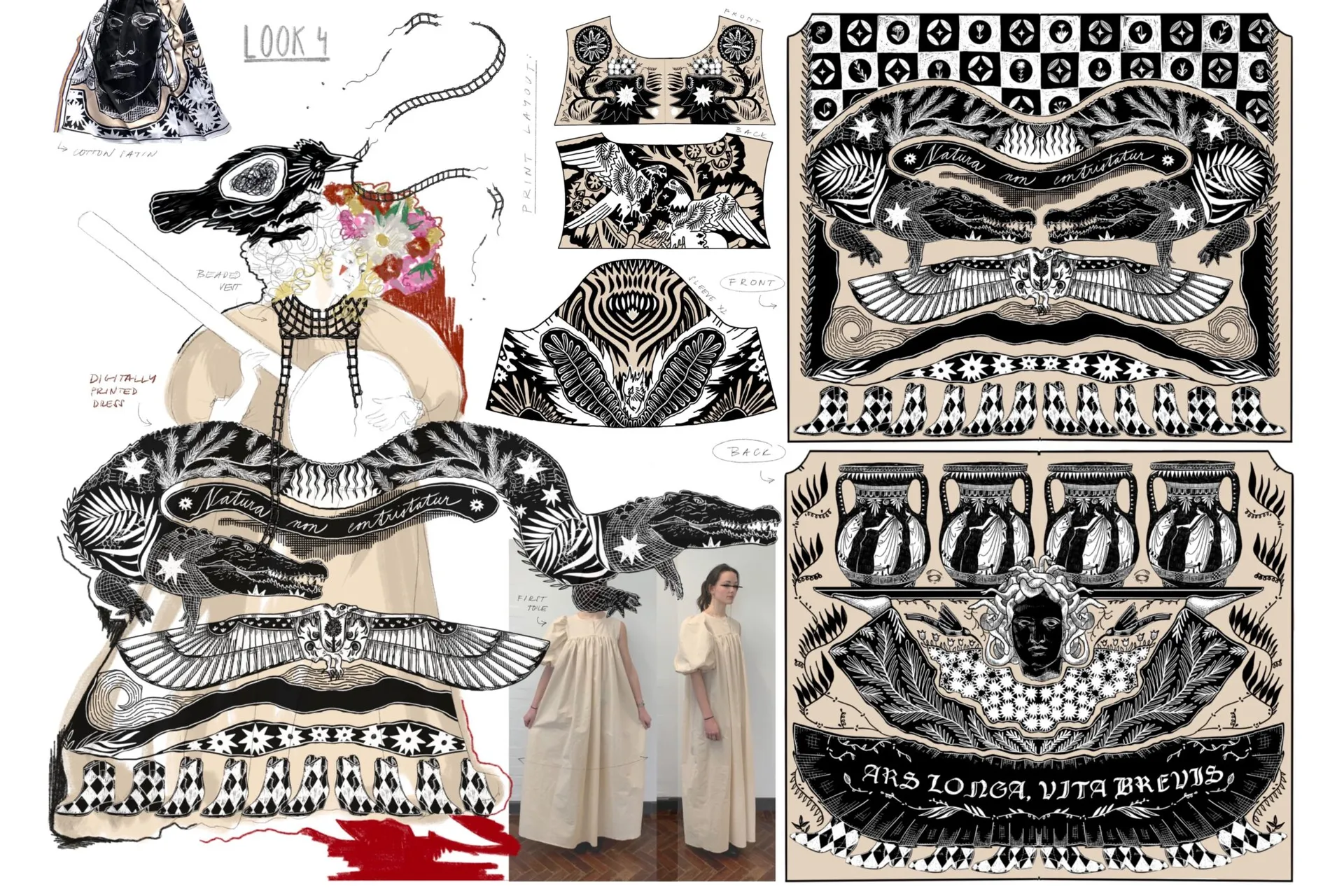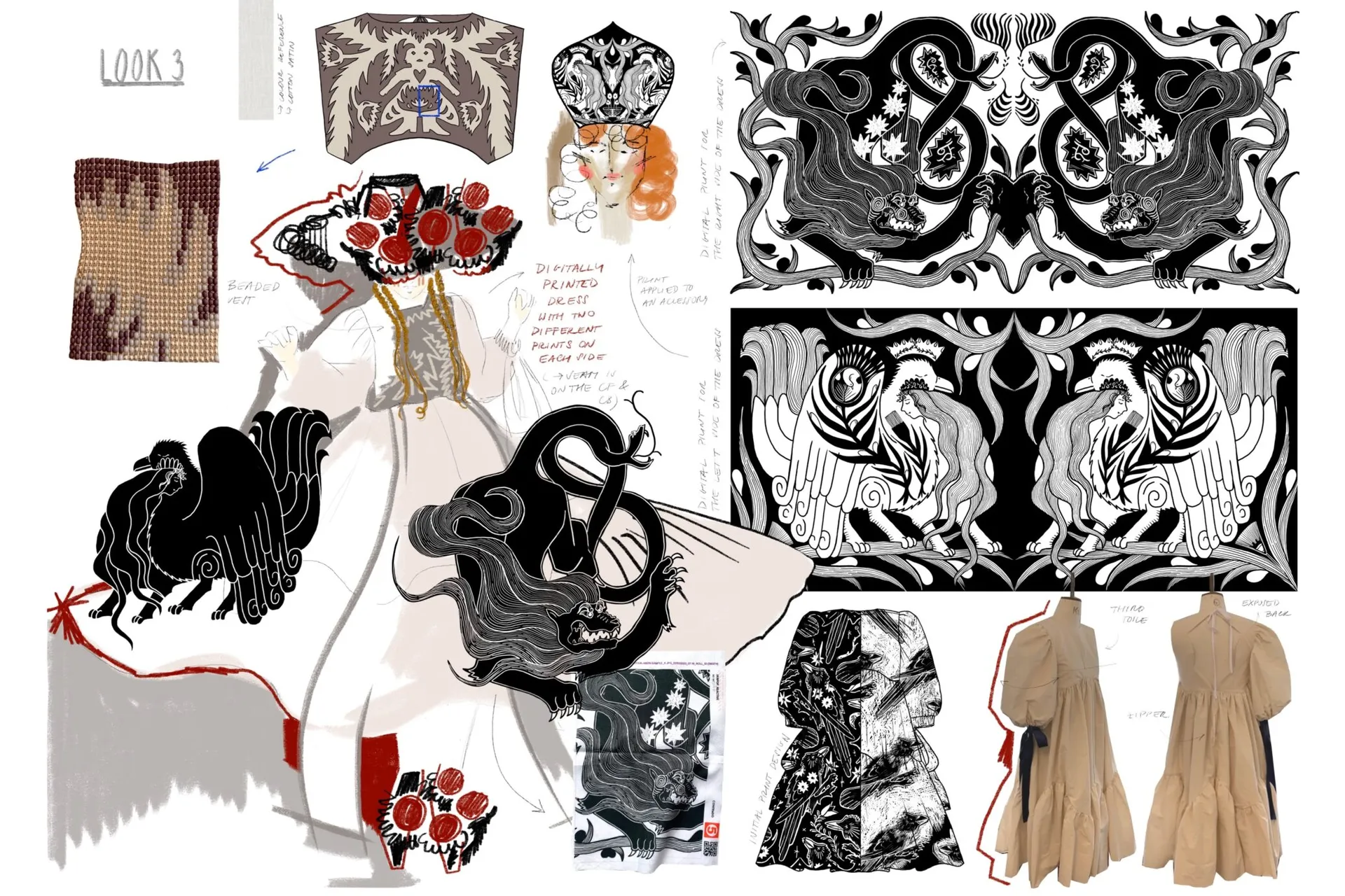 My designs incorporate rich textiles and patterns inspired explicitly by my Czech background as well as other European, South American and African cultures. The dresses have elements of fantasy and mythology, including silhouettes inspired by folk costumes, and geometric shapes inspired by trees and plants. The centrepiece of the collection is a series of dresses. These garments are elegant, sophisticated and modern, yet capture the mythical aspects of print design and the spiritual symbols of nature.