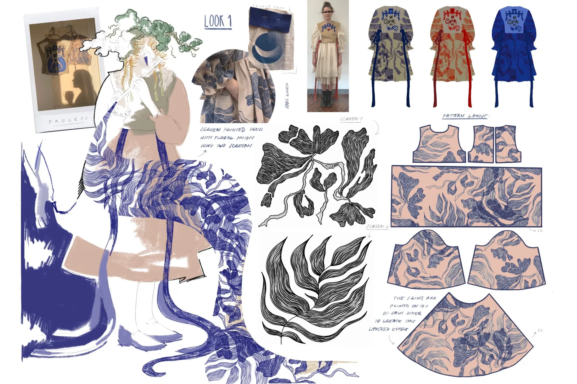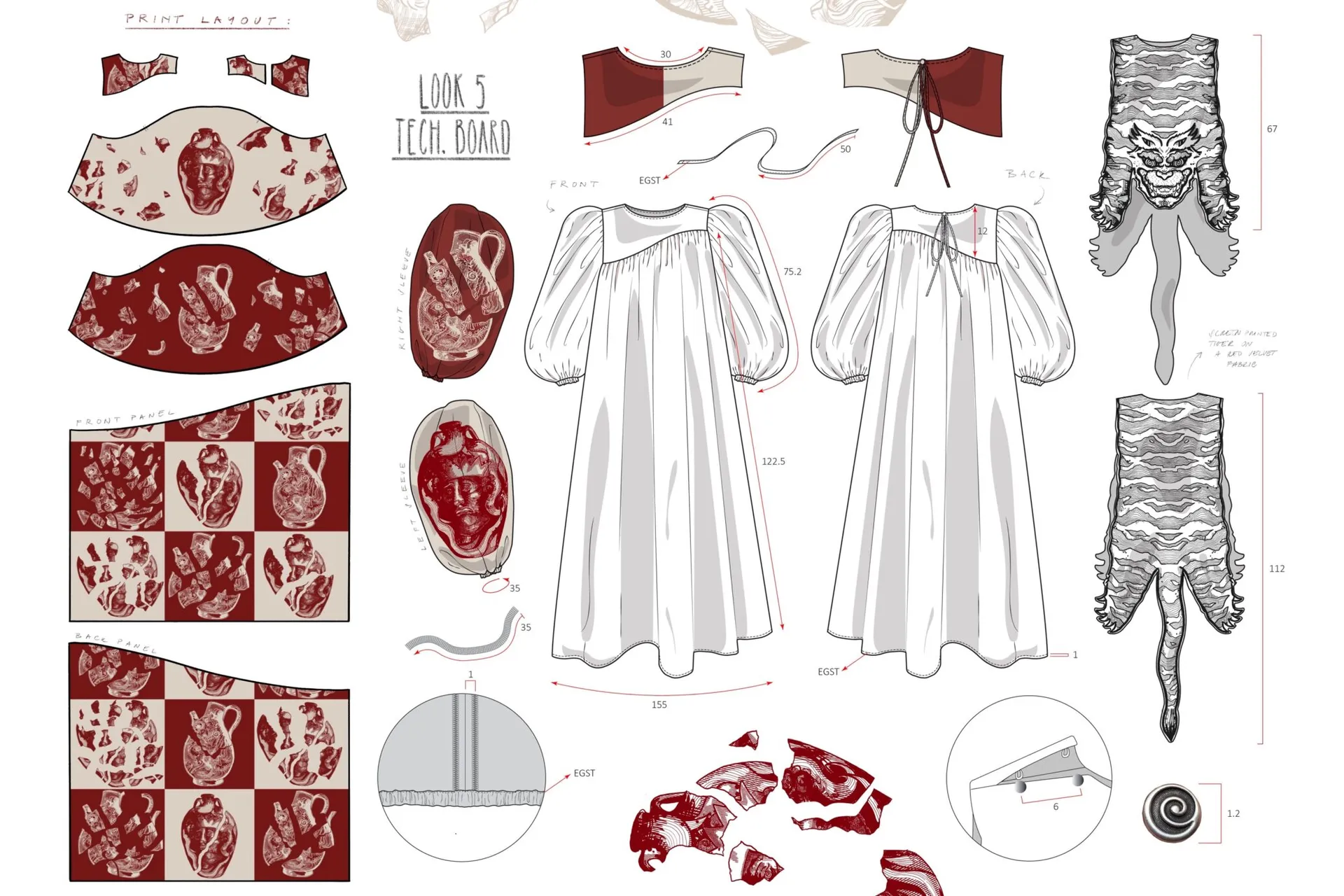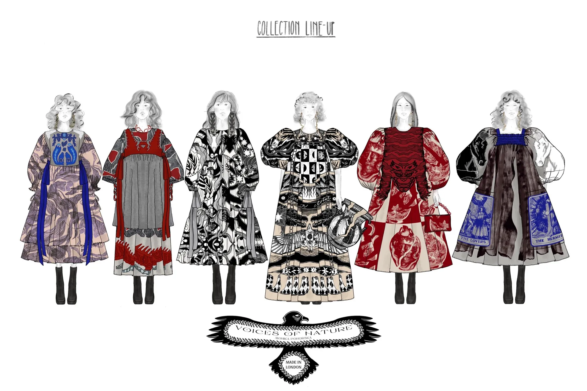 “Voices of Nature” is a womenswear collection where print is the prominent factor. The prints are inspired by nature and mythologies that are explanations of nature’s forces. They embody what was unexplainable for our ancestors; thunder, sea, spring, and fertility. By combining natural colours and prints inspired by patterns and figures from mythology, this collection captures the beauty and complexity of natural landscapes, as well as mythical qualities and the themes they influence.