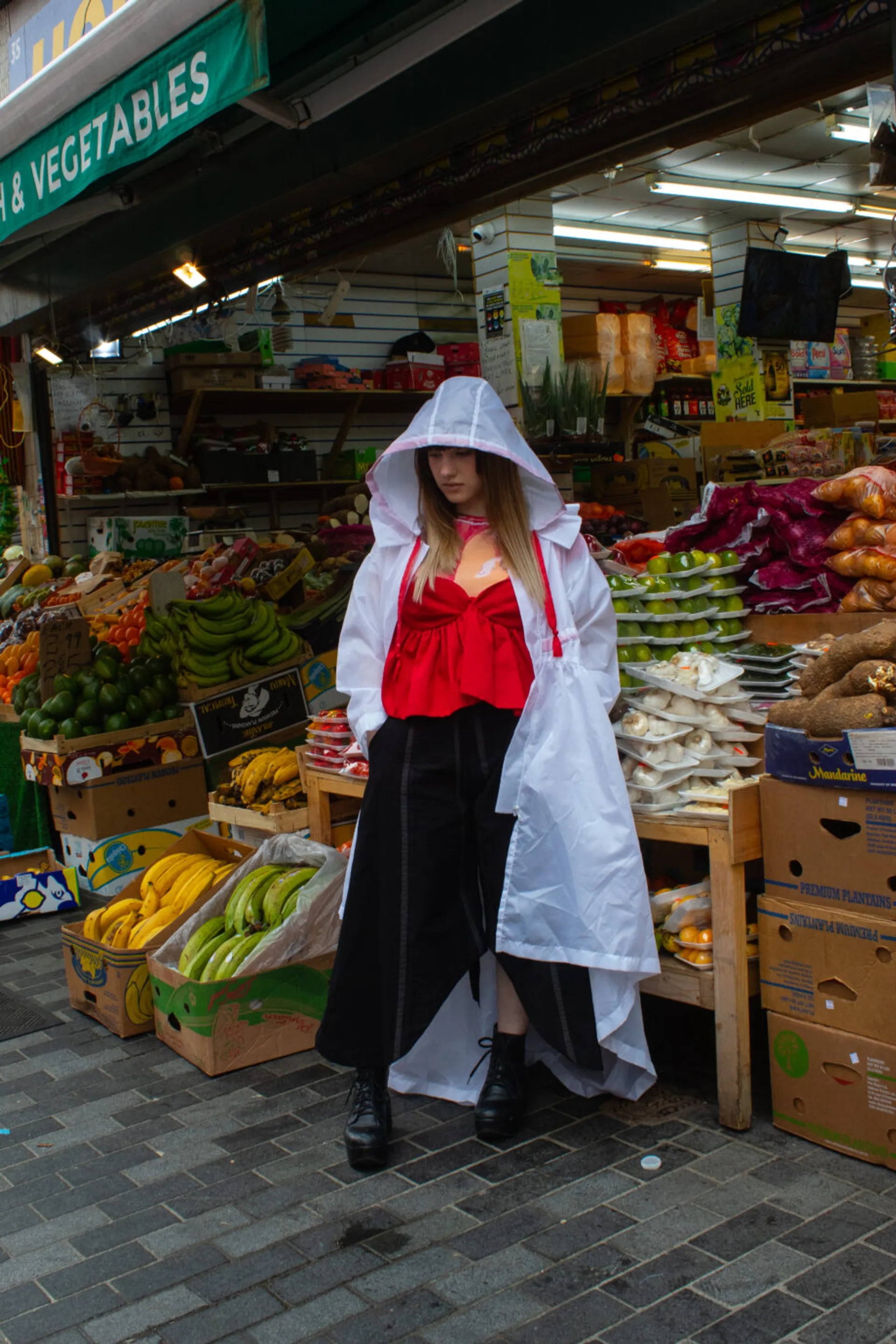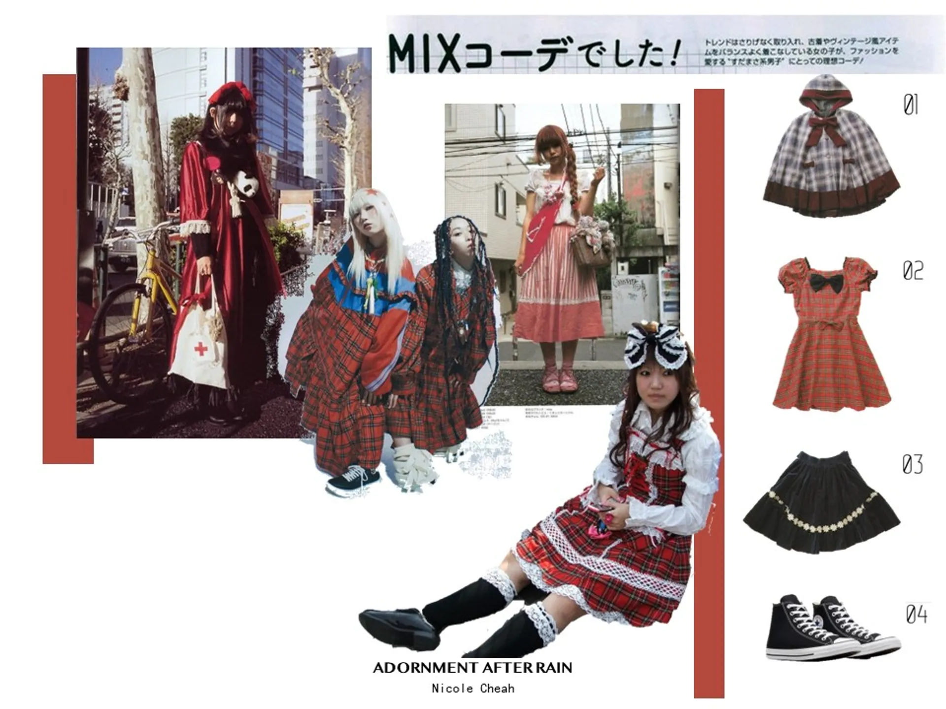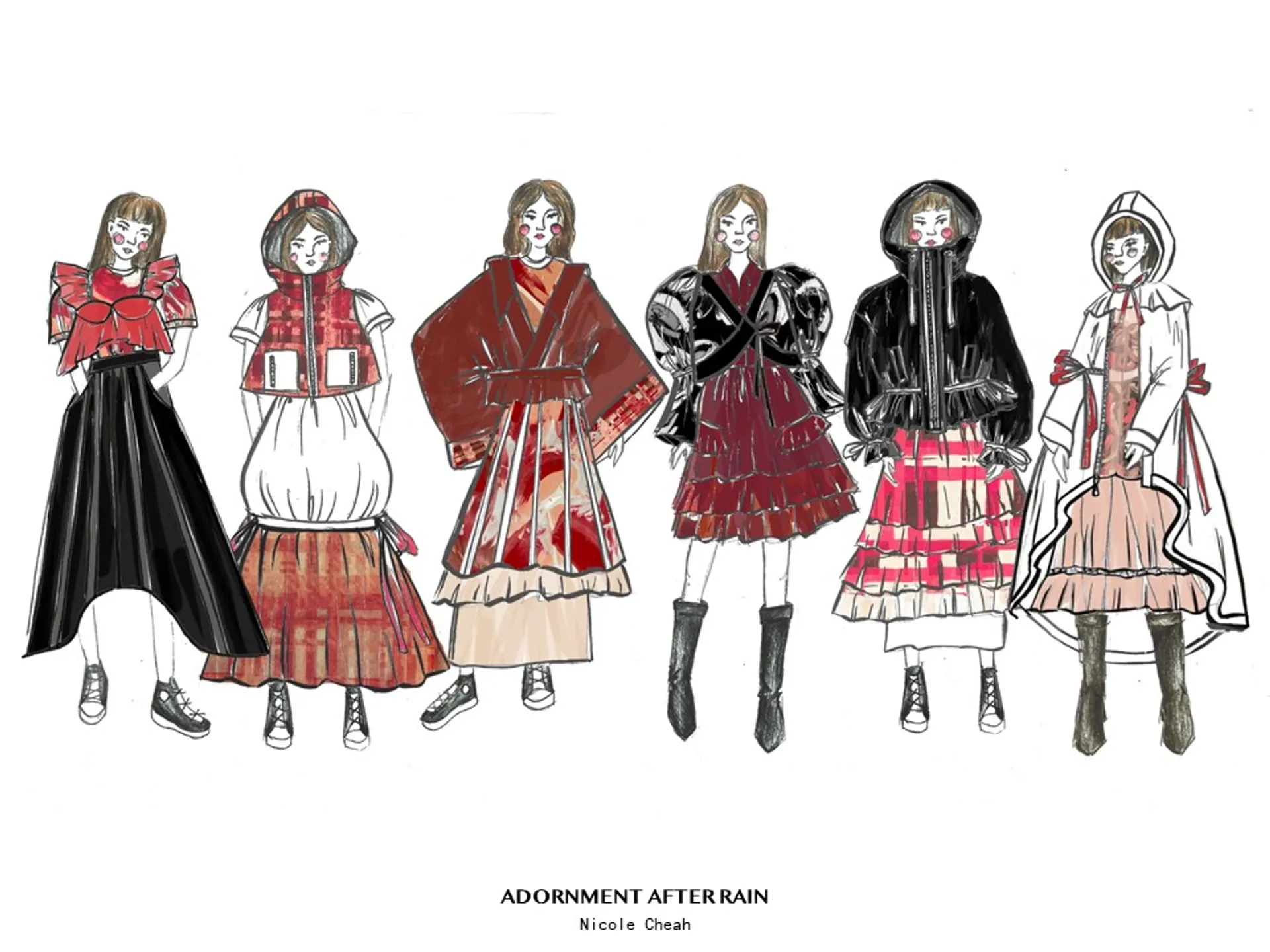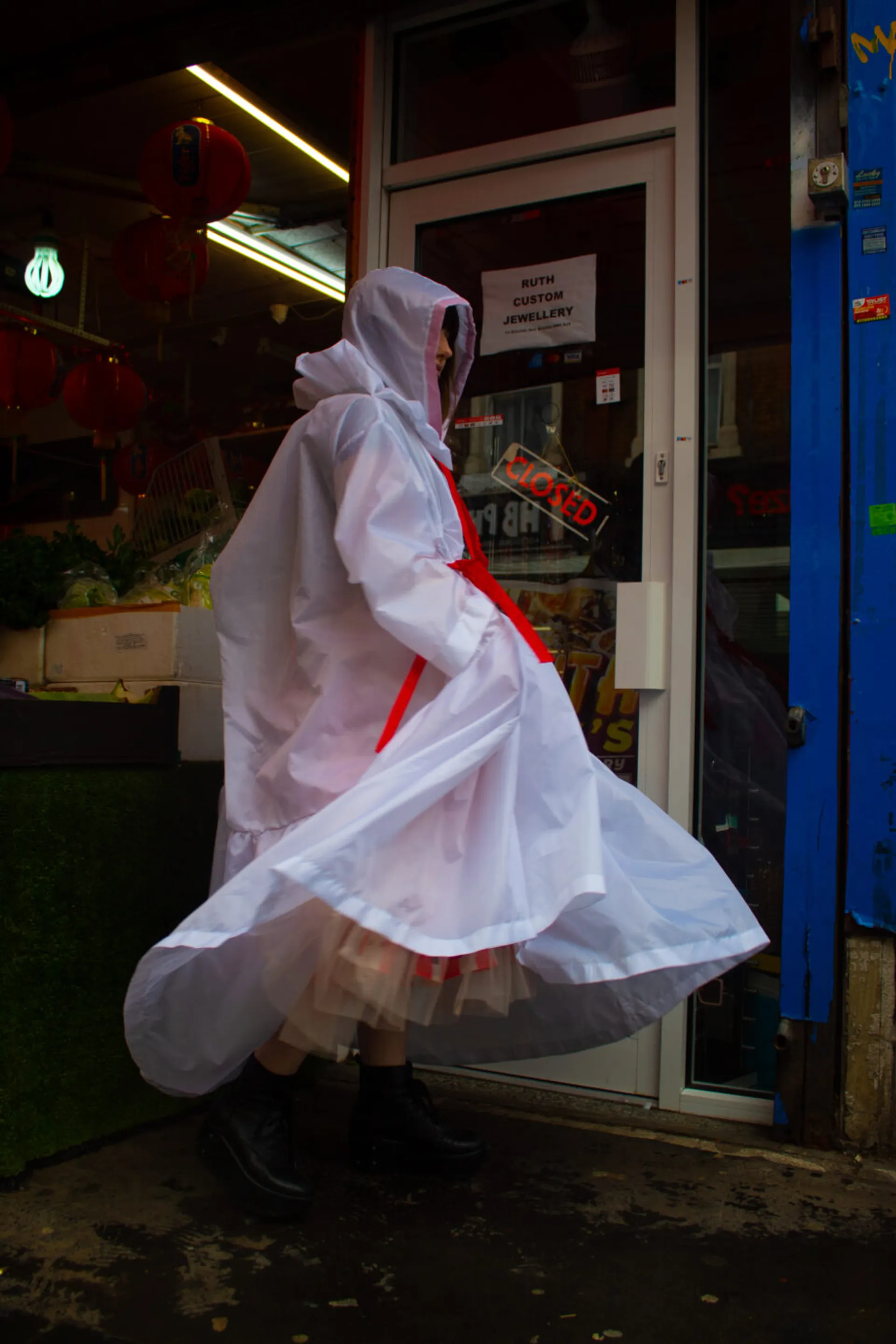 Adornment after Rain takes inspiration from the Japanese Lolita subculture. At its core the Lolita subculture has allowed self-expression, bringing together Western and Asian culture for many years. Embracing traditional elements from both cultures, reflective of my own upbringing as British-born Chinese.