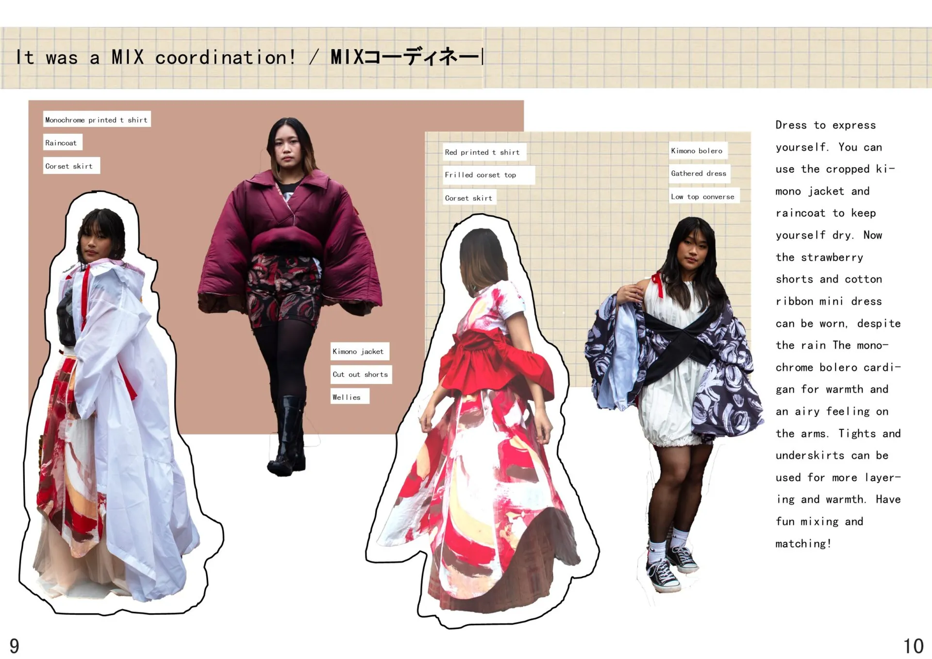My collection consists of various pieces. Dresses, t-shirts, pants, and jackets can all be styled interchangeably. T There is an ensemble for any occasion, and all the pieces can be layered and styled differently based on preference, allowing individual expression. Many oversized silhouettes portray the typical petite Lolita ‘cuteness.’