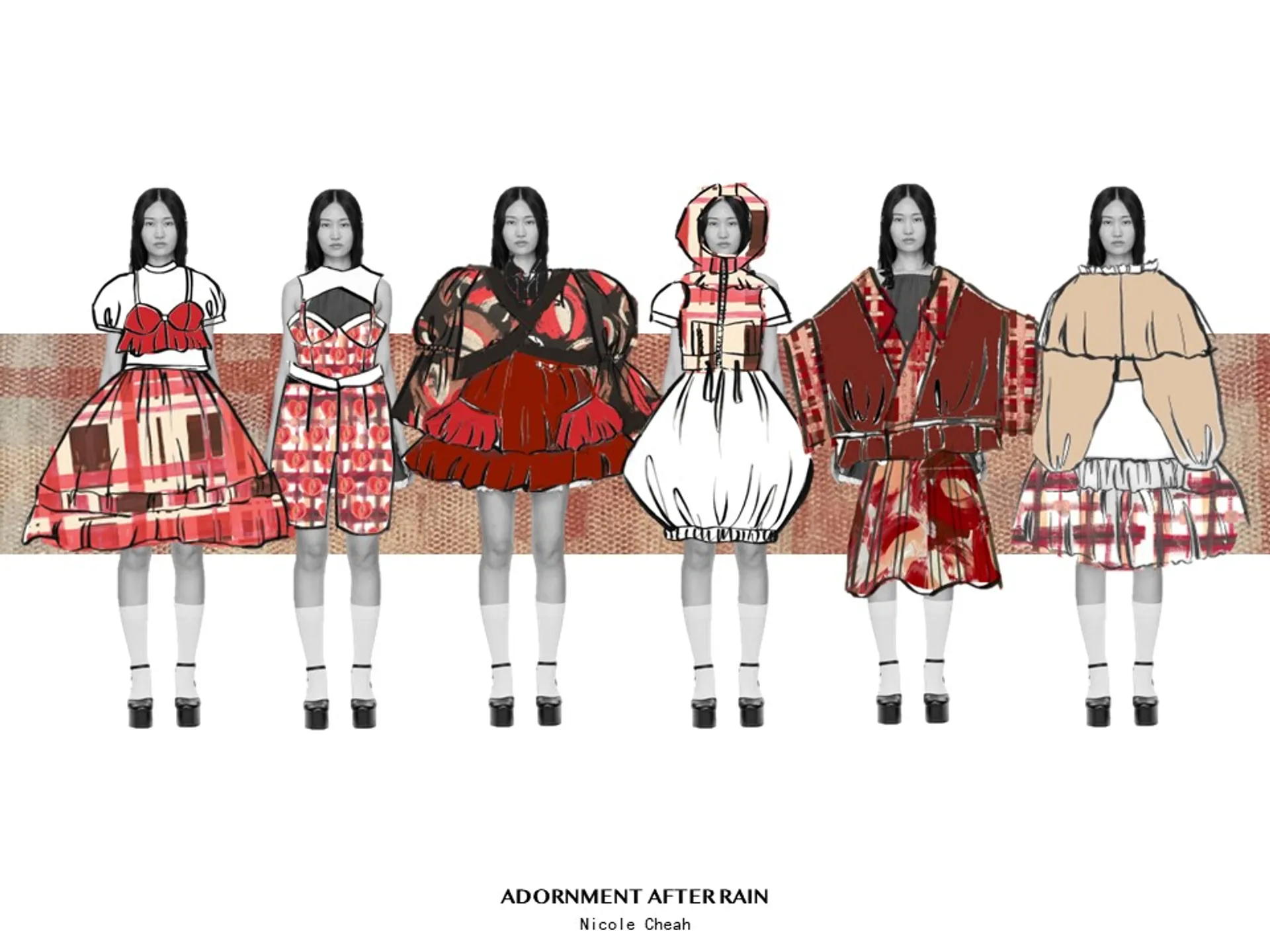 The overarching concept was protection and preservation. Asia is renowned for its rainy season. In utilising waterproof fabrics, the wearer feels sheltered and comfortable. My fabrics consisted of nylon, ripstop, tulle, and seersucker cotton poplin and drill. They follow a darker colour scheme reflective of the rainy weather conditions. Deep burgundy tones and pastel nudes replace the typical pink.
