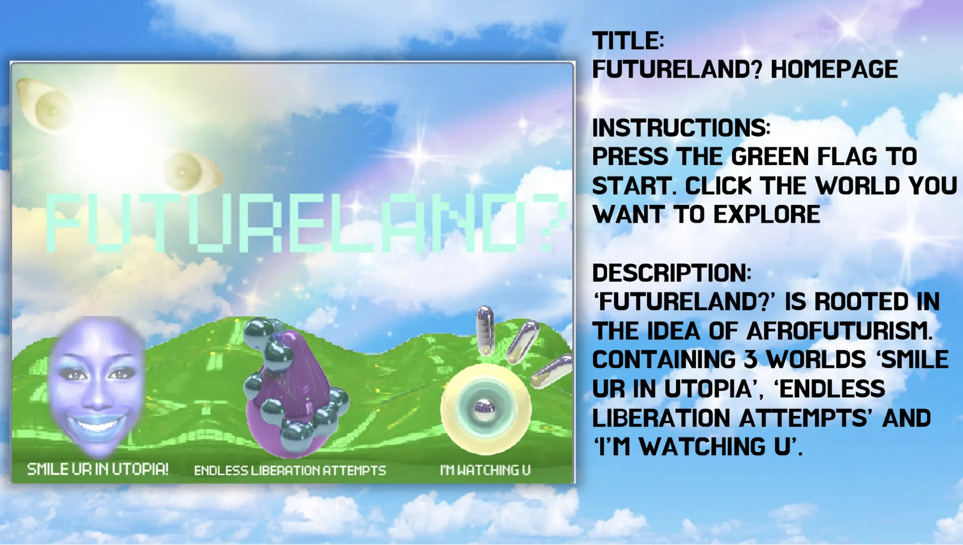 ‘FUTURELAND?’ IS ROOTED IN THE IDEA OF AFROFUTURISM. CONTAINING 3 WORLDS ‘SMILE UR IN UTOPIA’, ‘ENDLESS LIBERATION ATTEMPTS’ AND ‘I’M WATCHING U’.