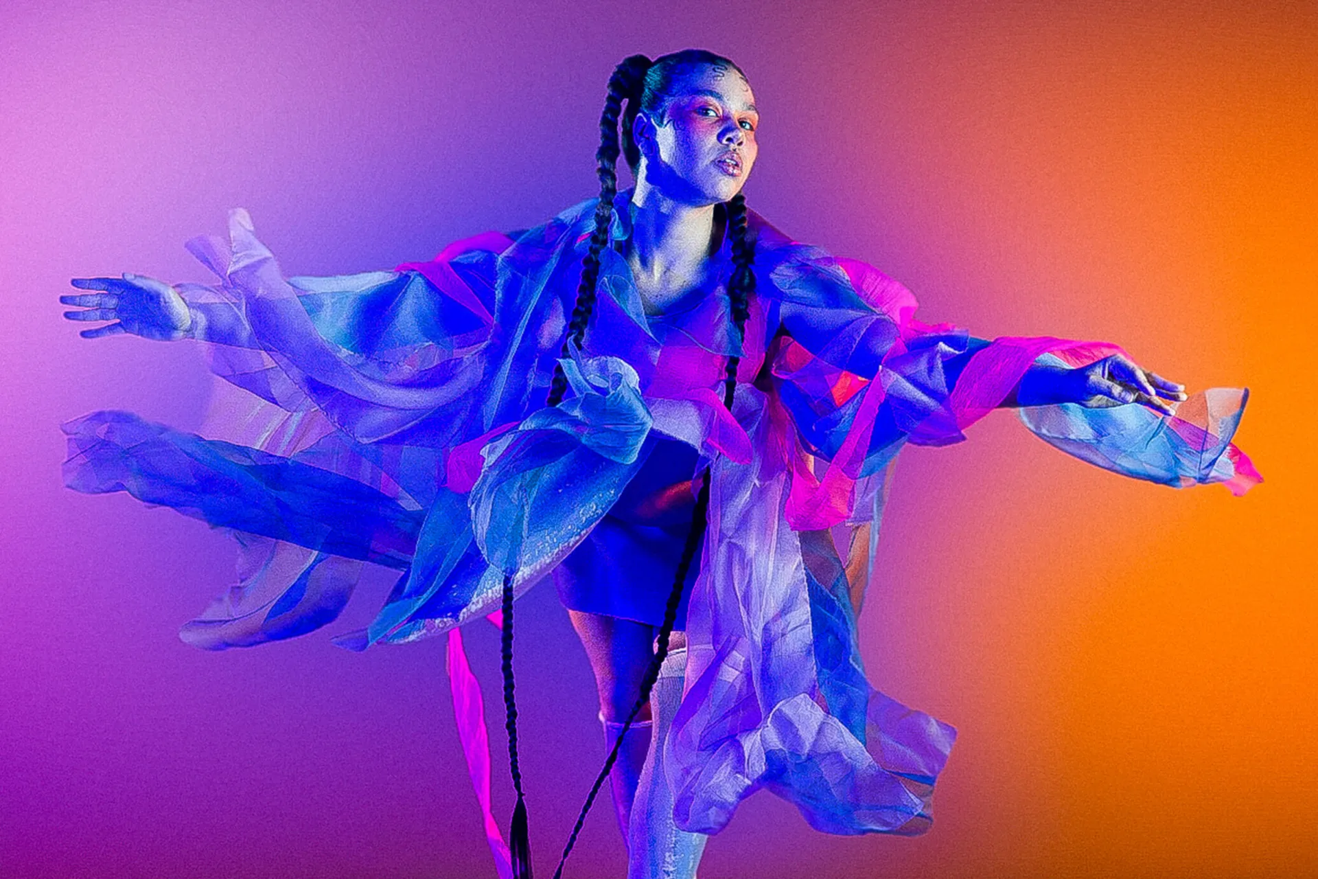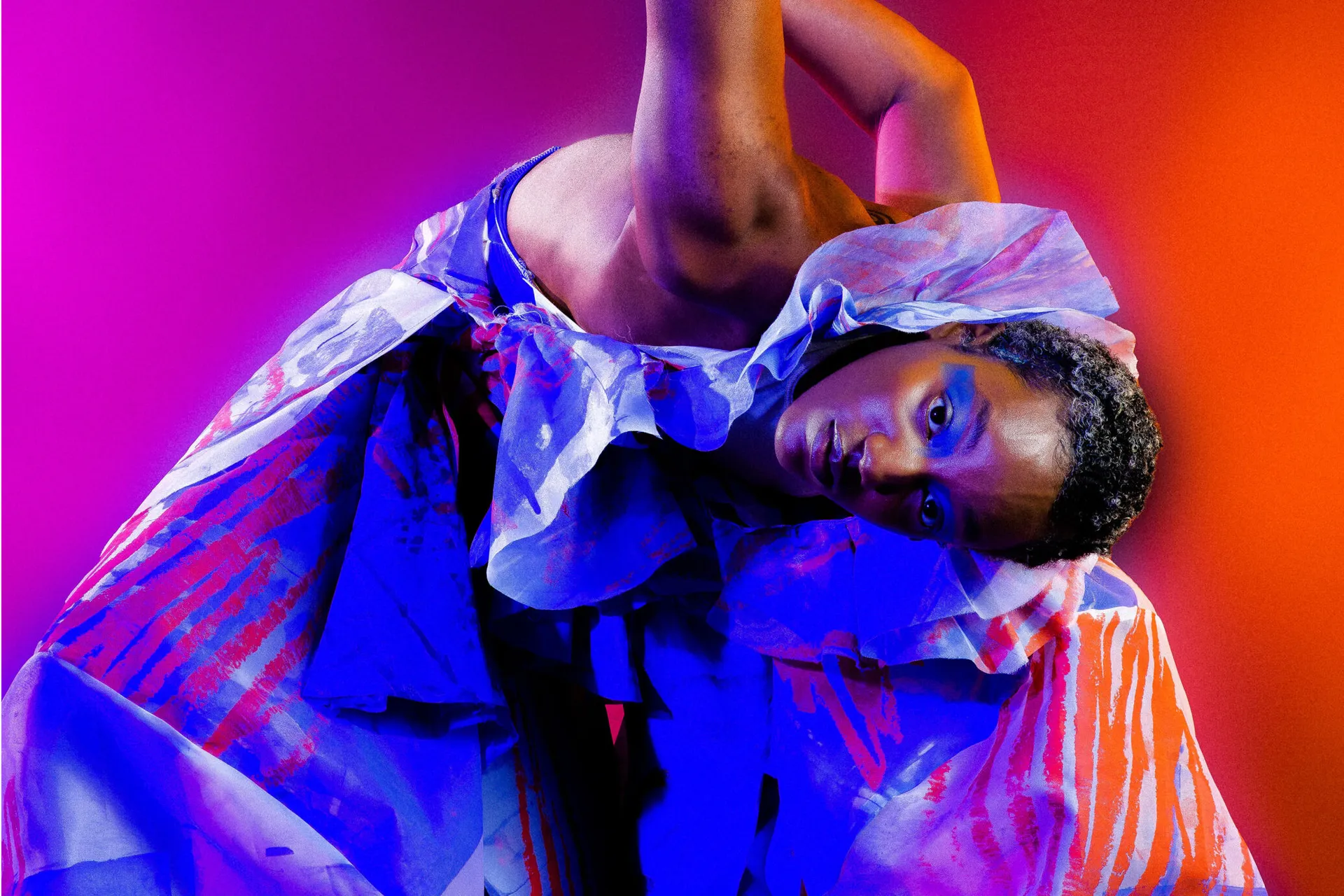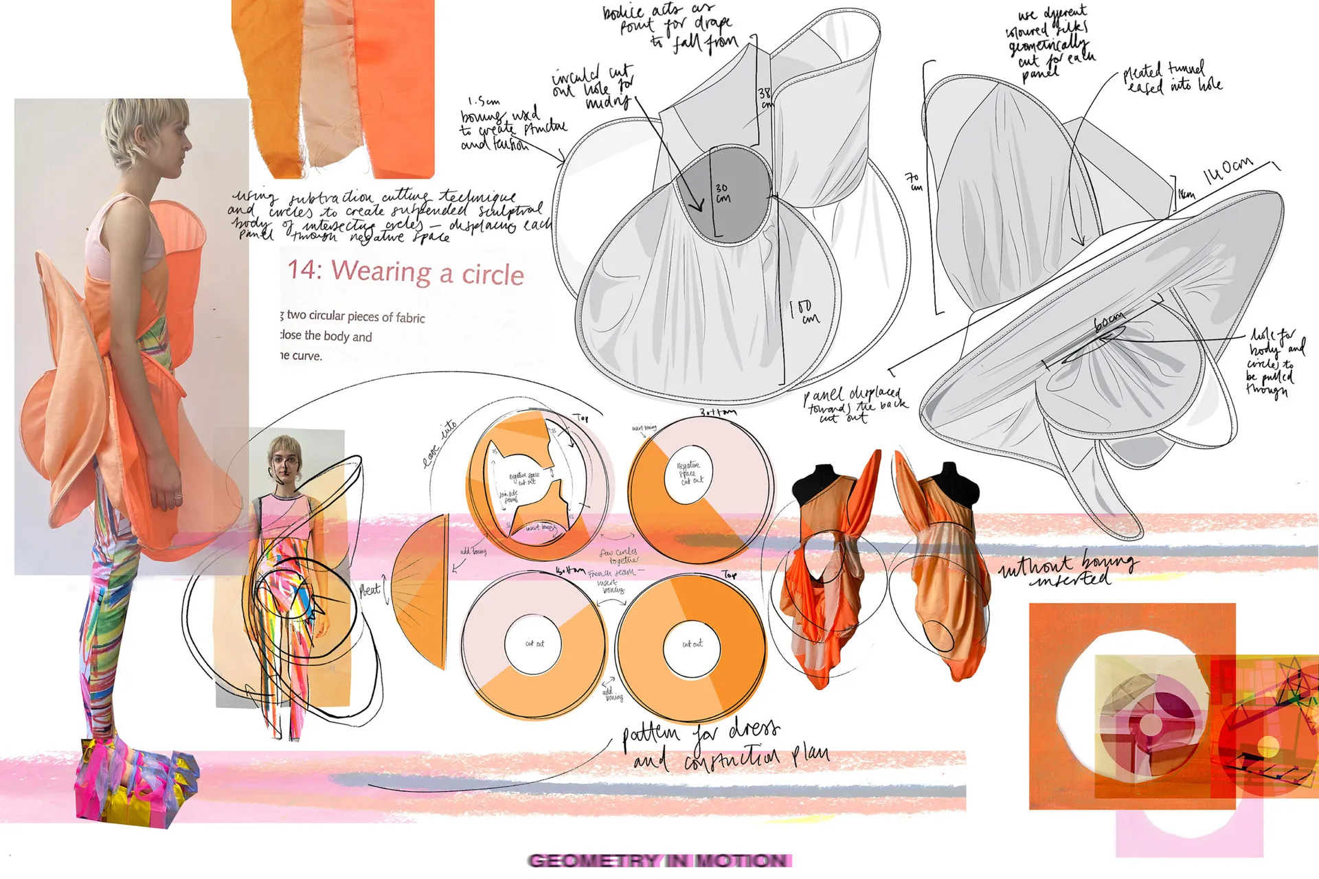My background in ballet acts as a constant source of inspiration for my designs and world-building. I design garments that interact with the body through innovative design techniques such as subtraction cutting and a deep understanding of movement. Artists such as Sonia Delaunay and Oscar Schlemmer, from the Bauhaus movement, act as a source of inspiration for my collection in how they intersected shape, colour and movement into fashion and the performing arts. Print is a dominant feature within my work, through silk screen printing I was able to produce an organic quality which complements my design vision as well as furthering the idea of wearable art.