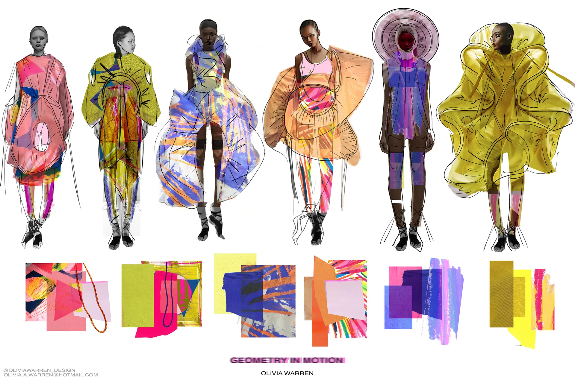 Olivia Warren is a fashion design graduate specialising in womenswear, with a particular interest in creative pattern-cutting, print and textiles. Focusing on fashion for performance, her designs are experimental yet considered, incorporating bold colours, dynamic patterns and luxe fabrications that enhance a sense of movement, fluidity and theatricality.