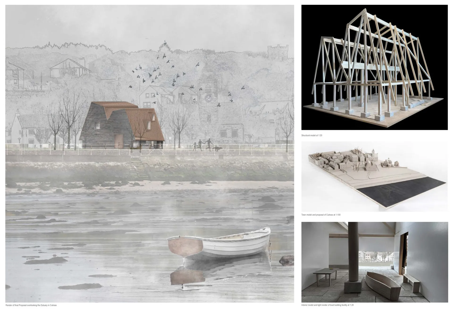 The project aims to remove the disused train line acting as a barrier to the town, utilising its resources for materials in the building. The design integrates a boatbuilding workshop and a covered public exterior for communal activities with differing interior special conditions.