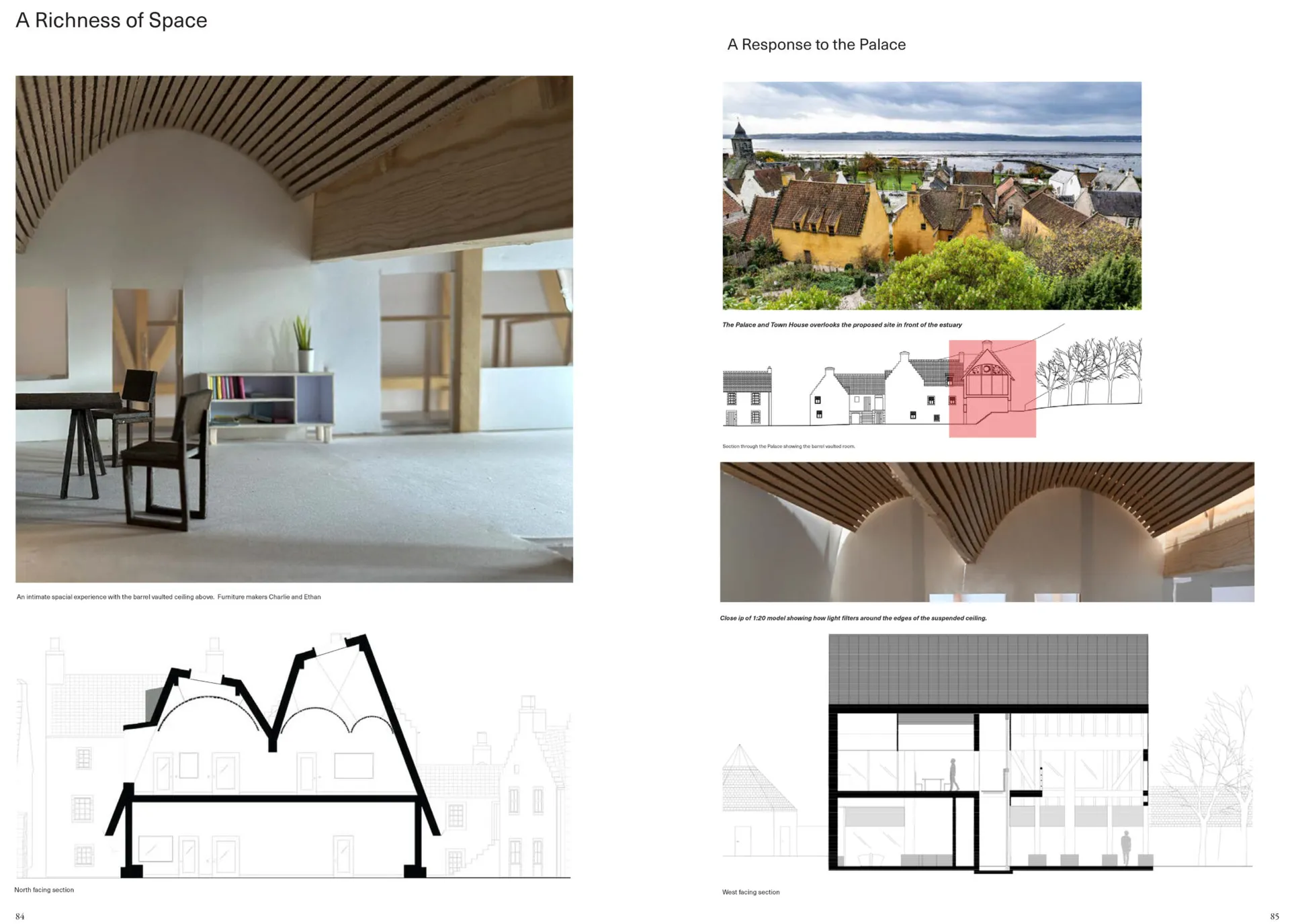 The slender timber structure sits above the solid stone base with an interior characterised by pale and unique patterning made from Douglas Fir timber – a connection is made to Culross Palace, whose barrel-vaulted ceilings are said to be made from upturned boats.