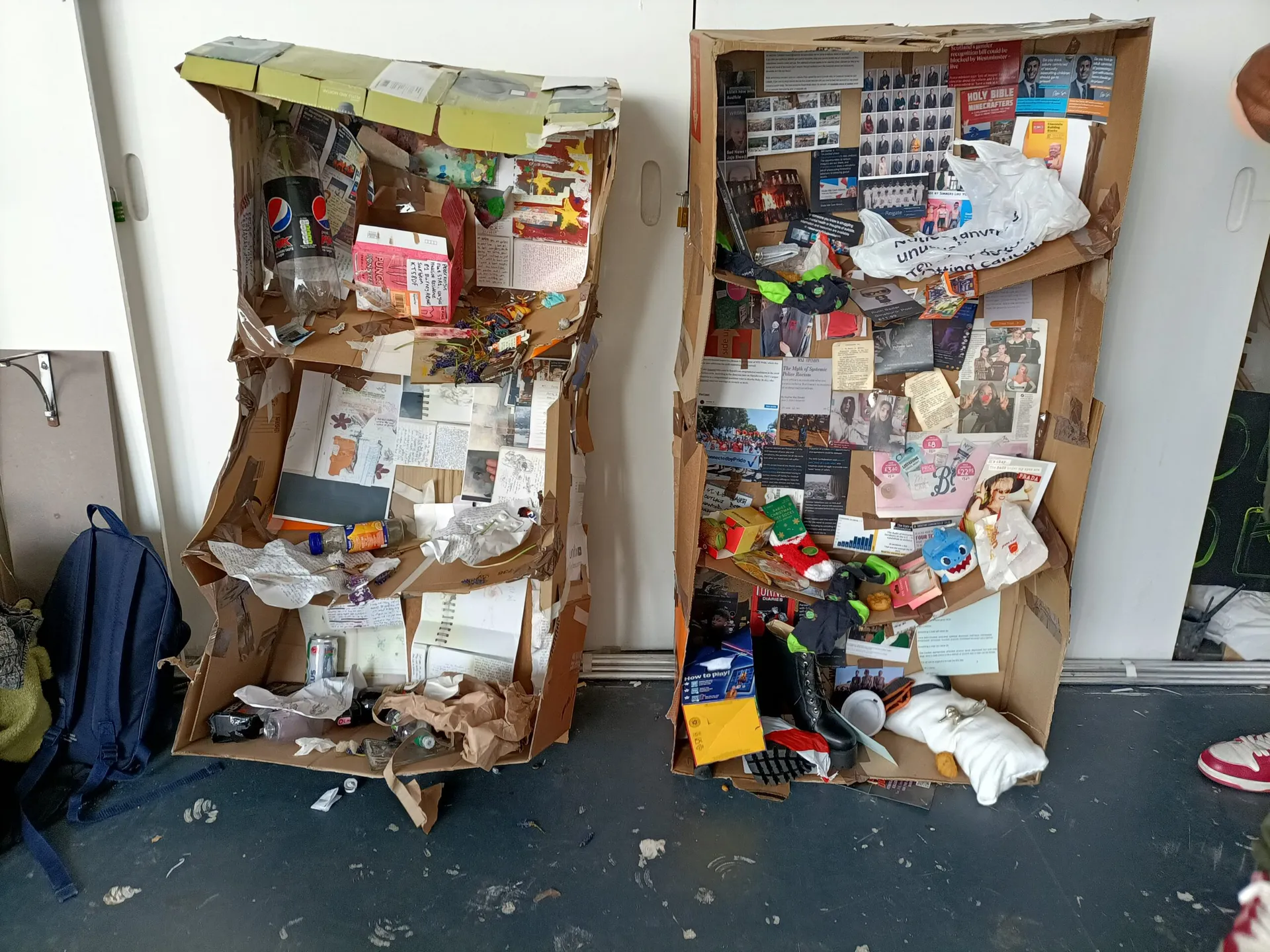 I created an electronically controlled puppet theatre with the help of Sebastian from HackSpace. The curtain will open when a £1 coin is inserted into the coin machine, anticlimatically revealing a dingy mirror. The piece is a commentary on the privatised and marketized fine art world that students are moving into, because how can artists hope to criticise the state of the world within a market leading gentrification and art-washing? It is an ironic mimicry of galleries that asks the viewer to question their complicity in upholding the systems they hope to topple.