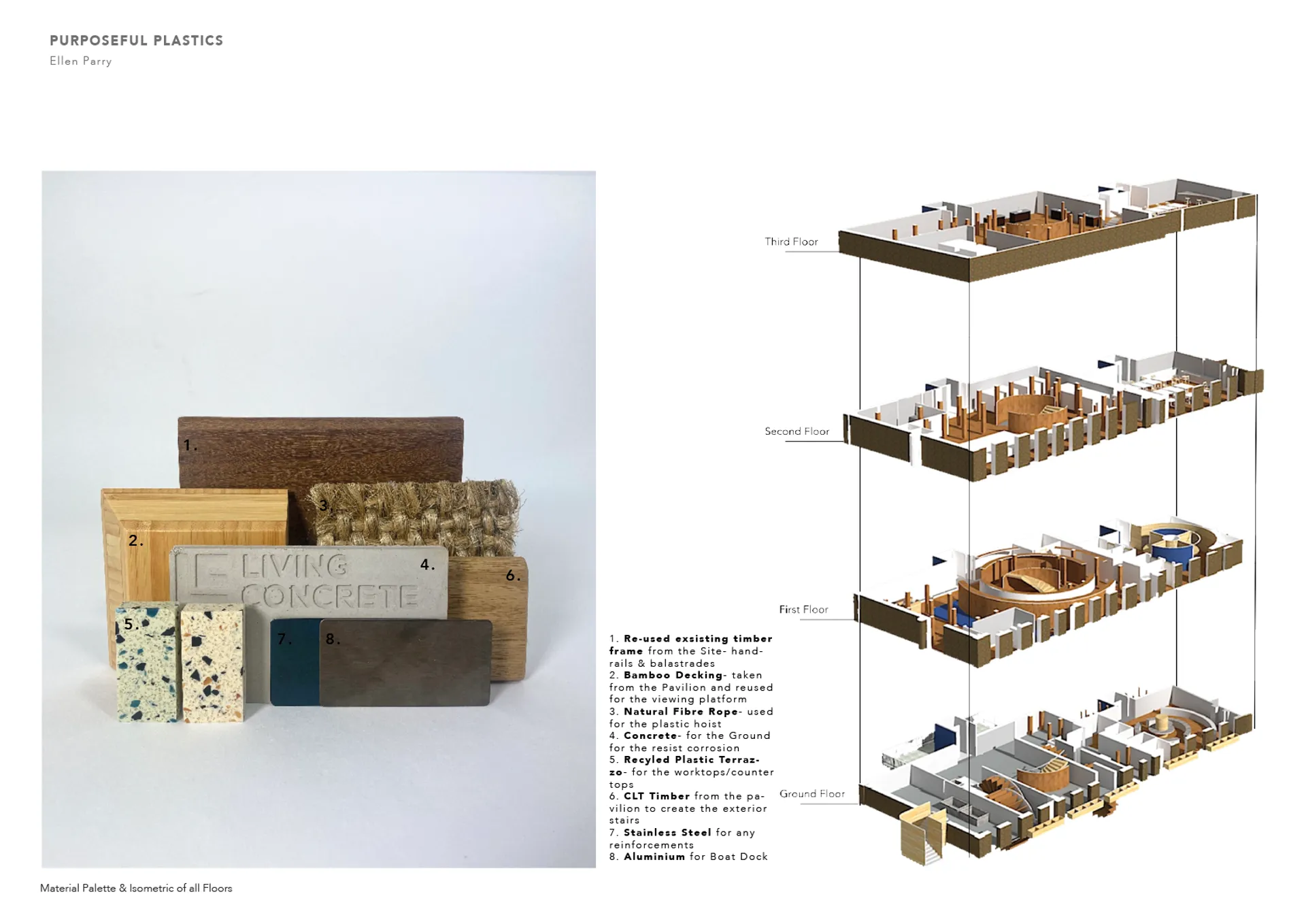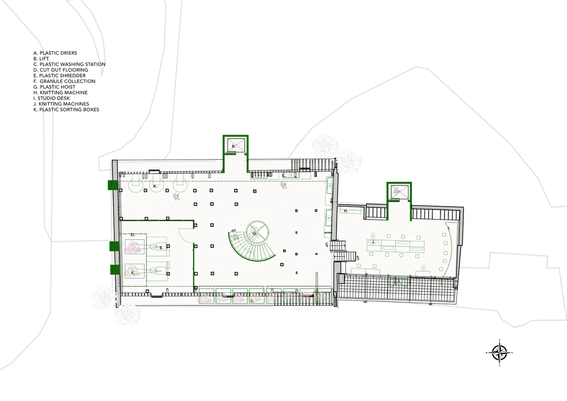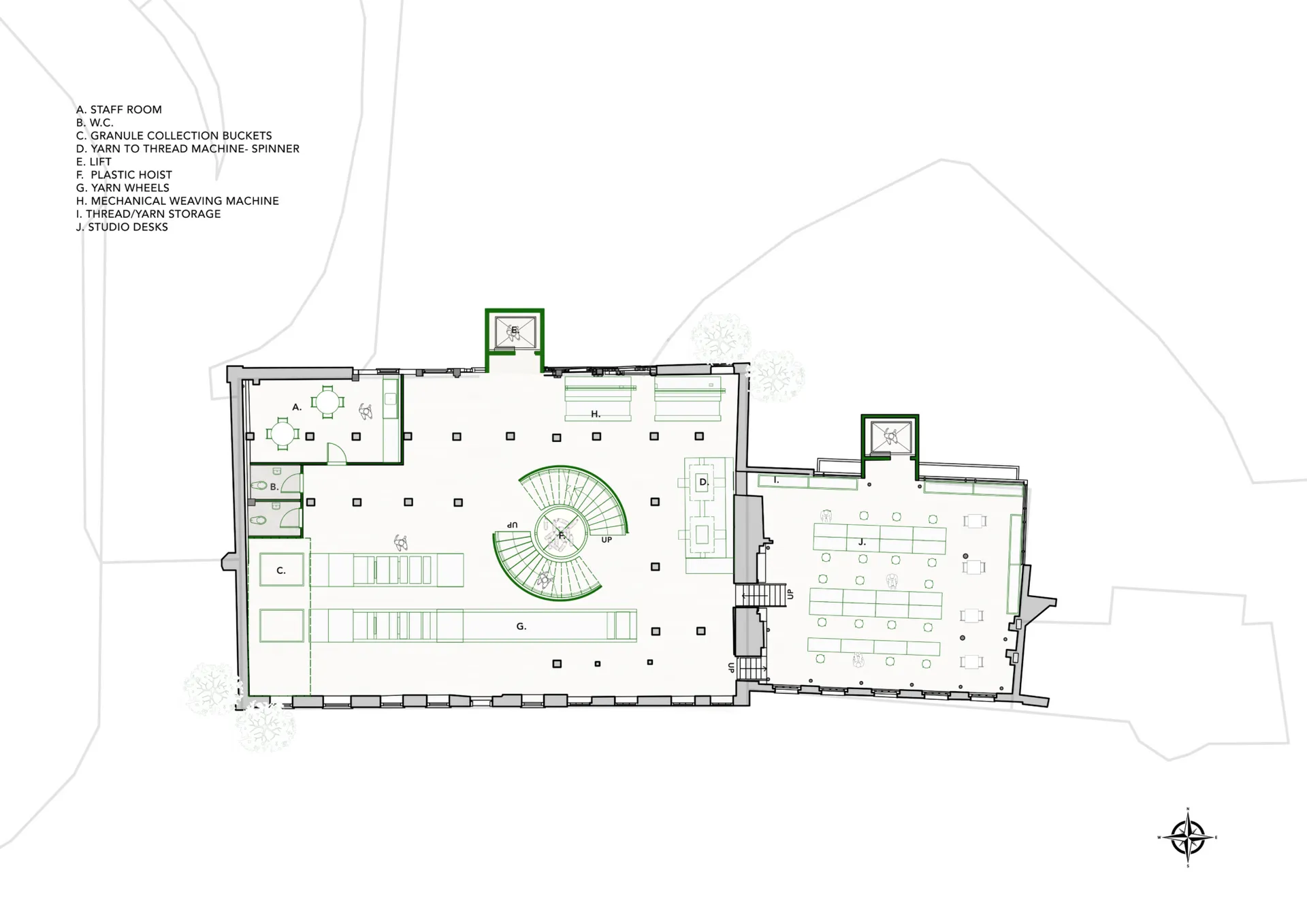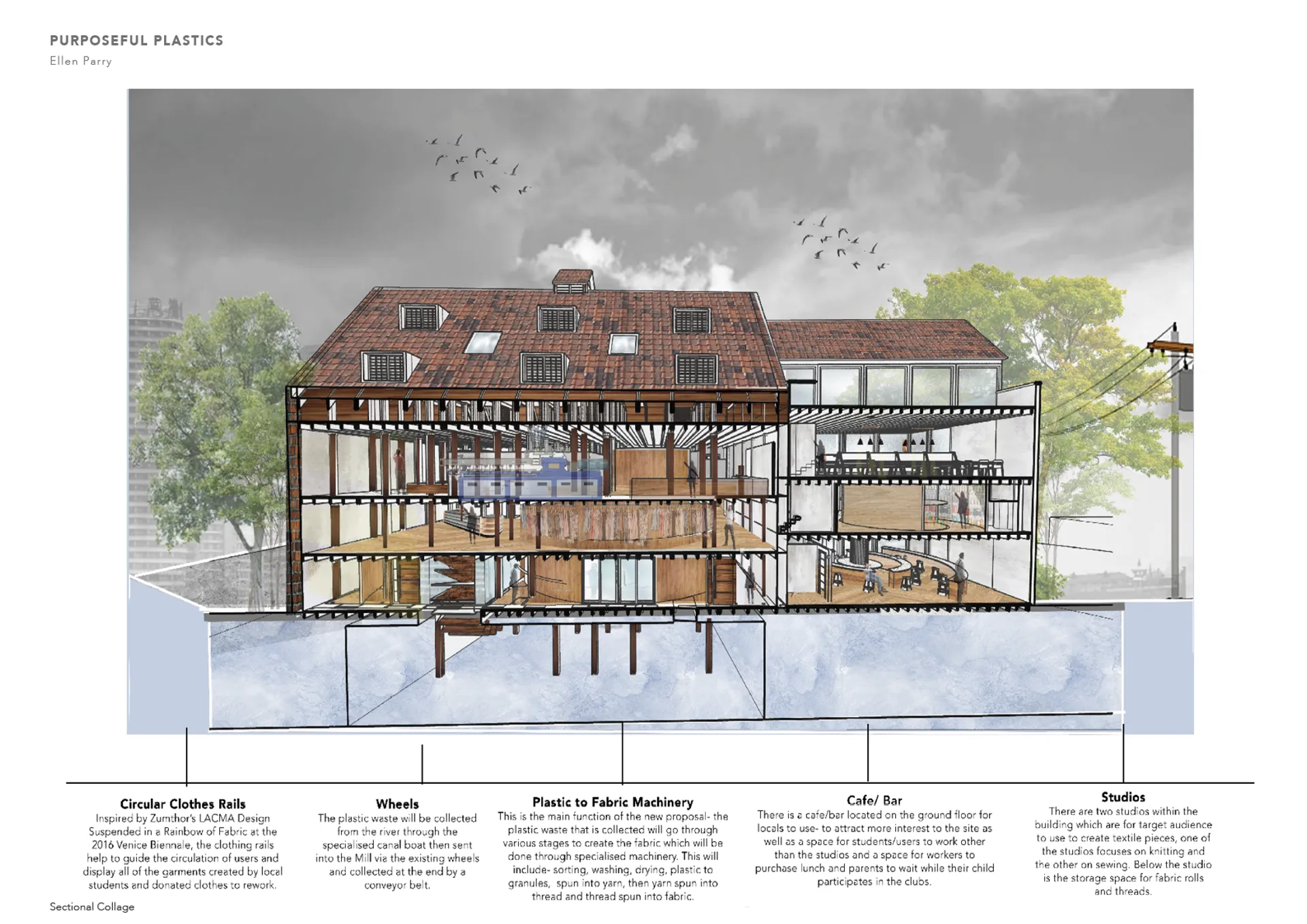 The existing wheels of the Mill will be used to import the plastic from the canal boat (below the building), the plastic will then be collected inside the Mill by workers and sent up to the top floors for processing, via a hoist which will cut through all floors of the Mill and run through the centre of a spiral staircase- which will be one of the main attractions of the space. Visitors will be involved within the process from plastic to fabric, creating an immersive and educational experience. The more plastic waste collected, the more fabric can be created. The garments created by the local and students will displayed throughout the Mill, which will guide the public circulation.
