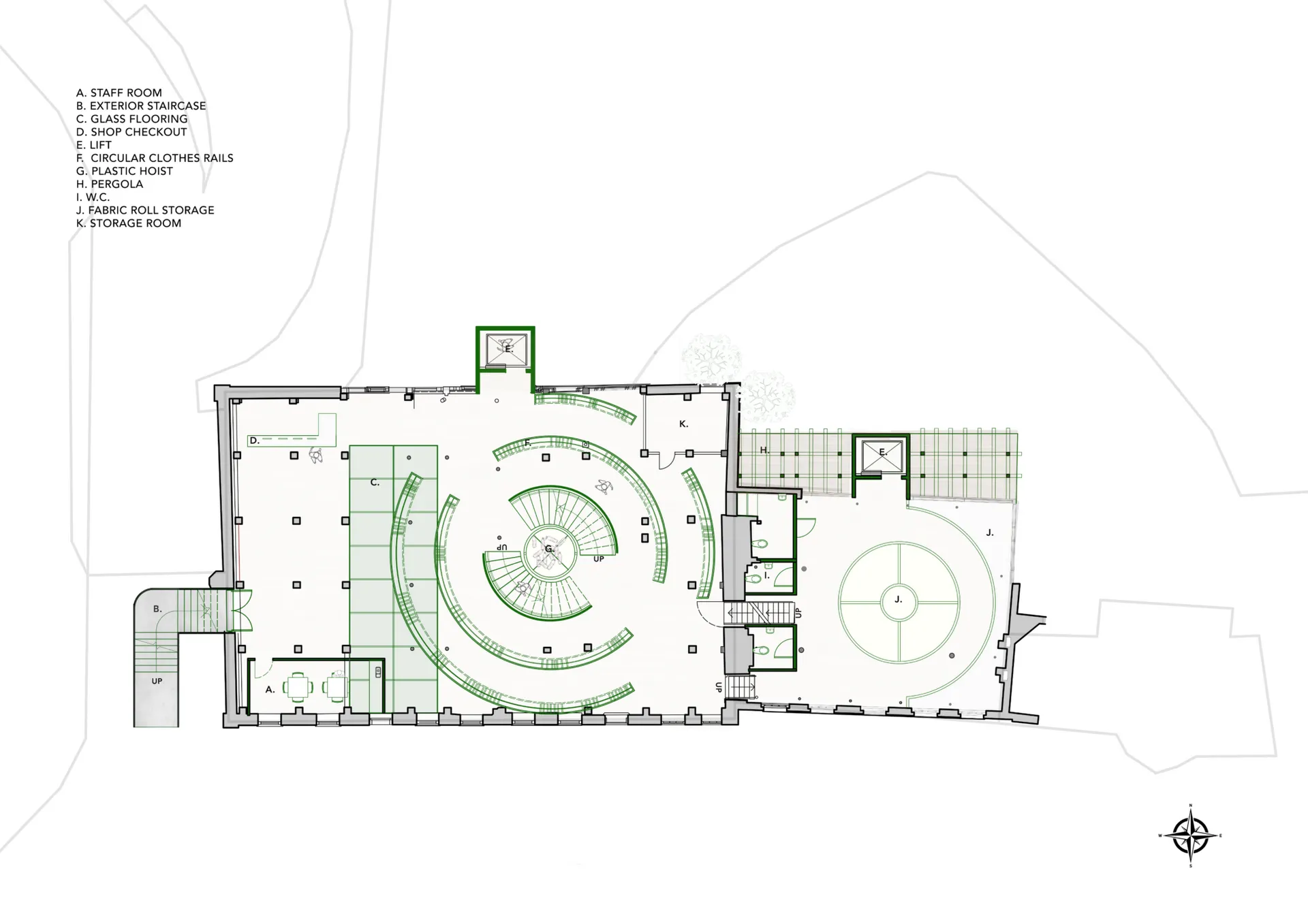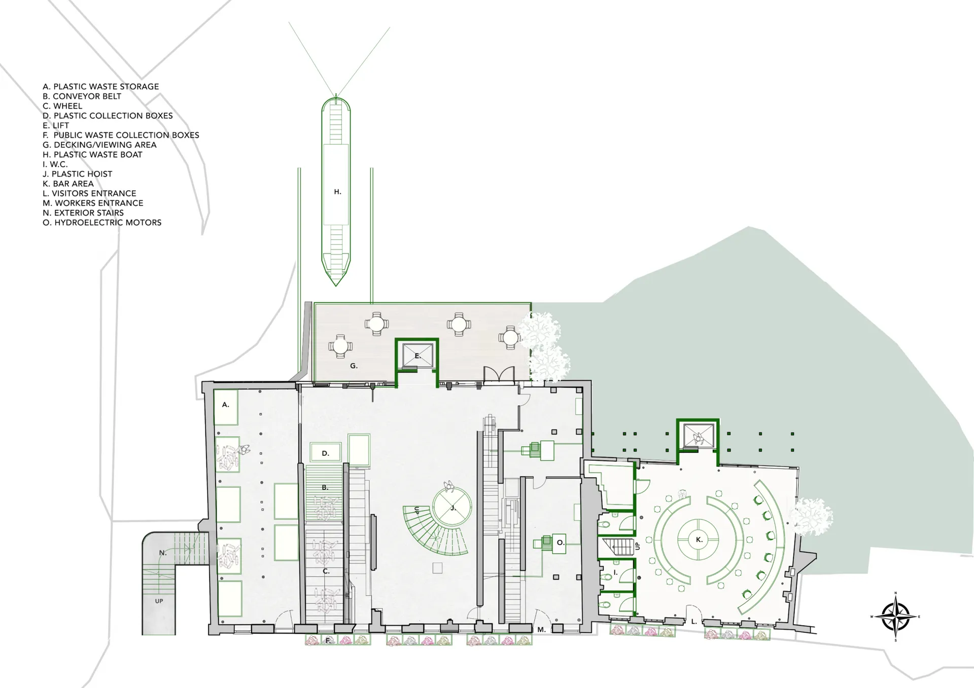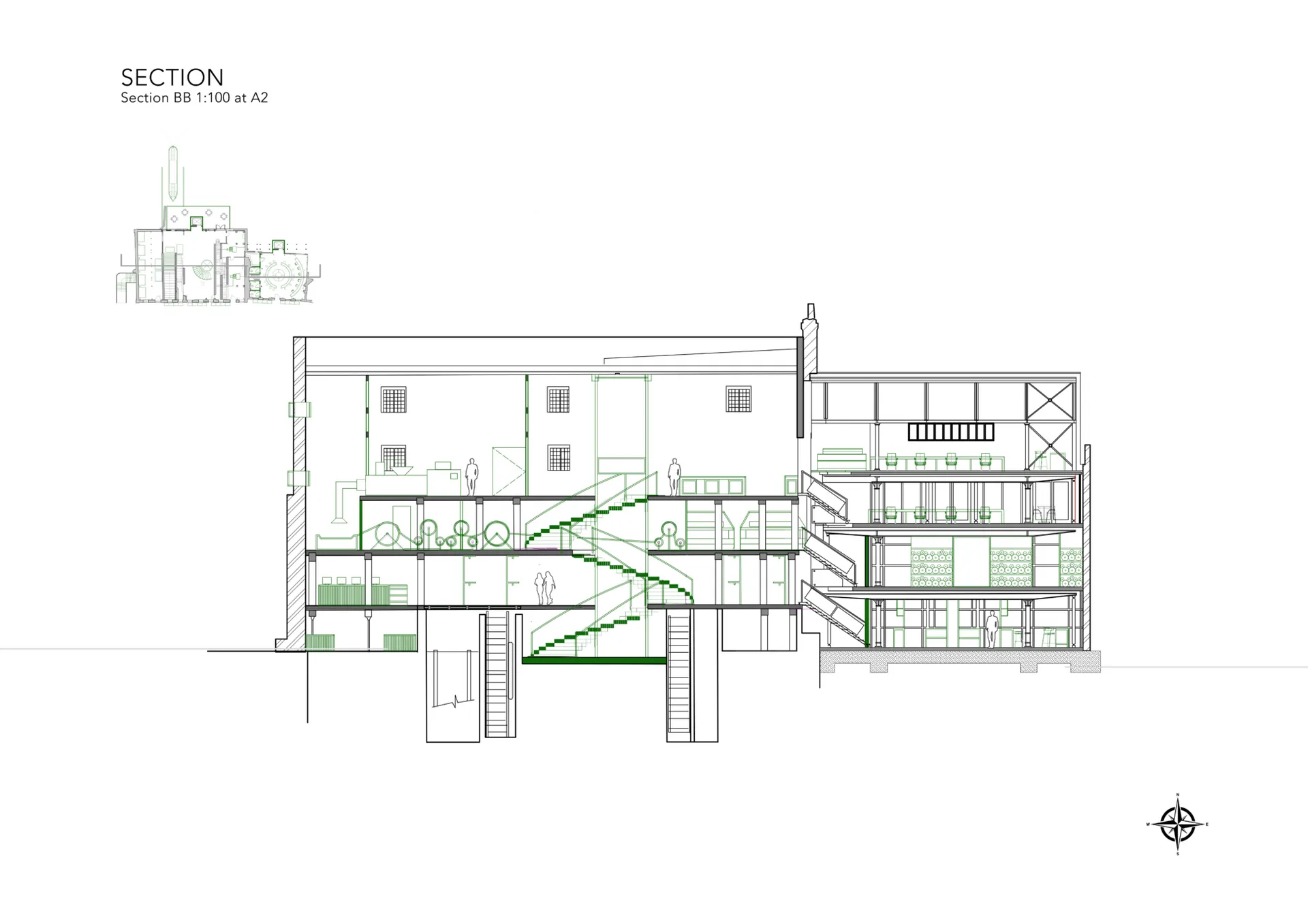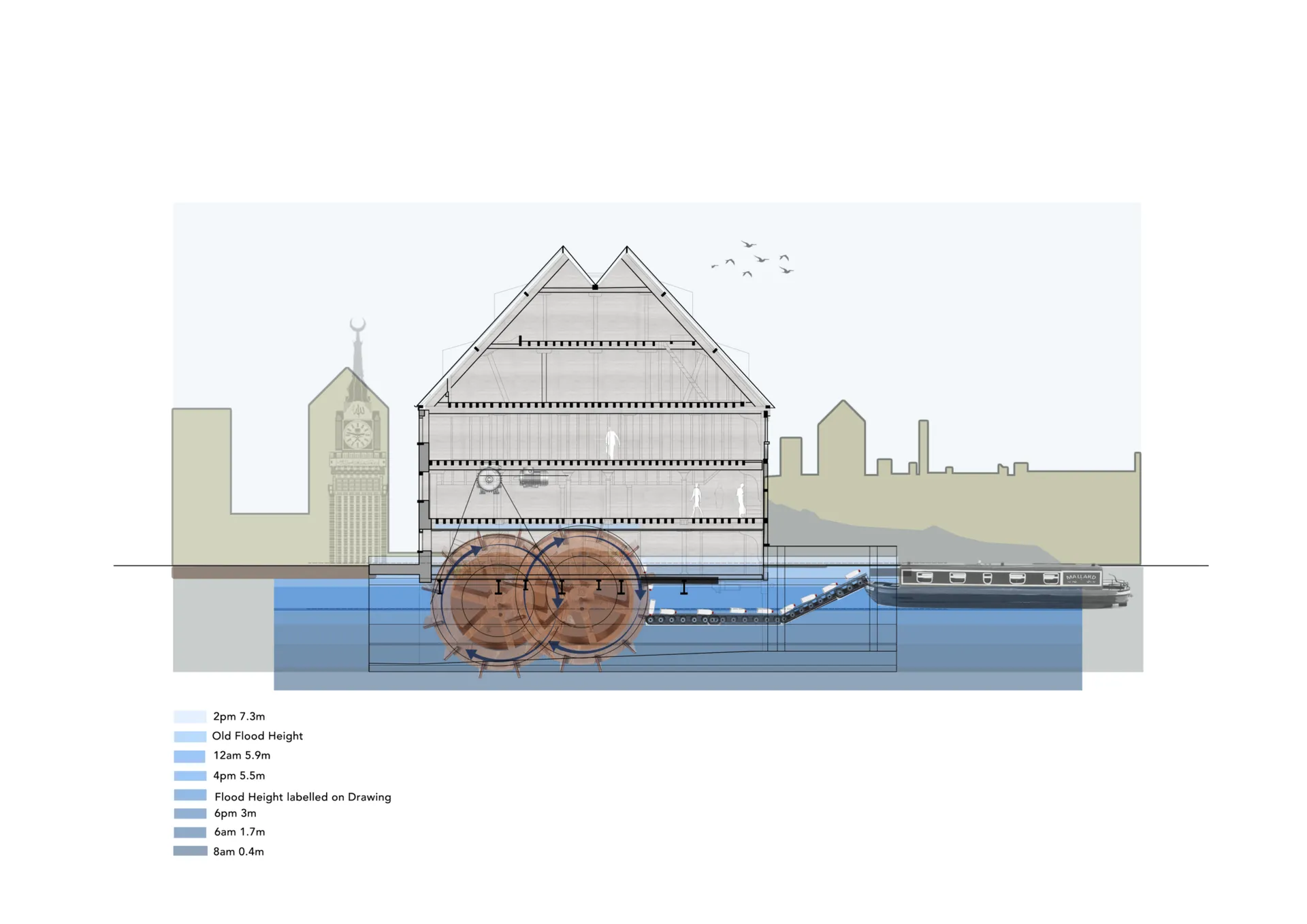 The existing wheels of the Mill will be used to import the plastic from the canal boat (below the building), the plastic will then be collected inside the Mill by workers and sent up to the top floors for processing, via a hoist which will cut through all floors of the Mill and run through the centre of a spiral staircase- which will be one of the main attractions of the space. Visitors will be involved within the process from plastic to fabric, creating an immersive and educational experience. The more plastic waste collected, the more fabric can be created. The garments created by the local and students will displayed throughout the Mill, which will guide the public circulation.