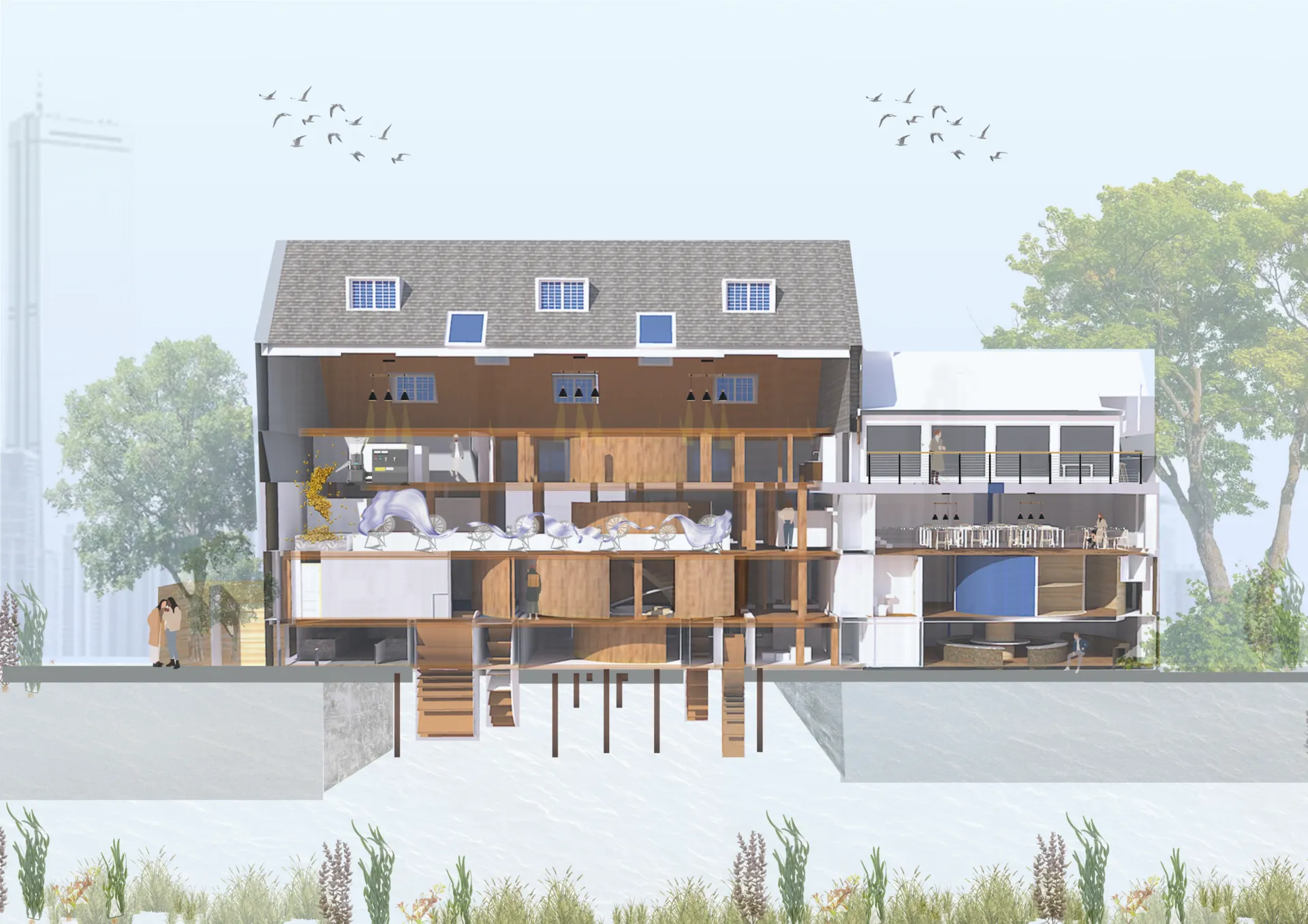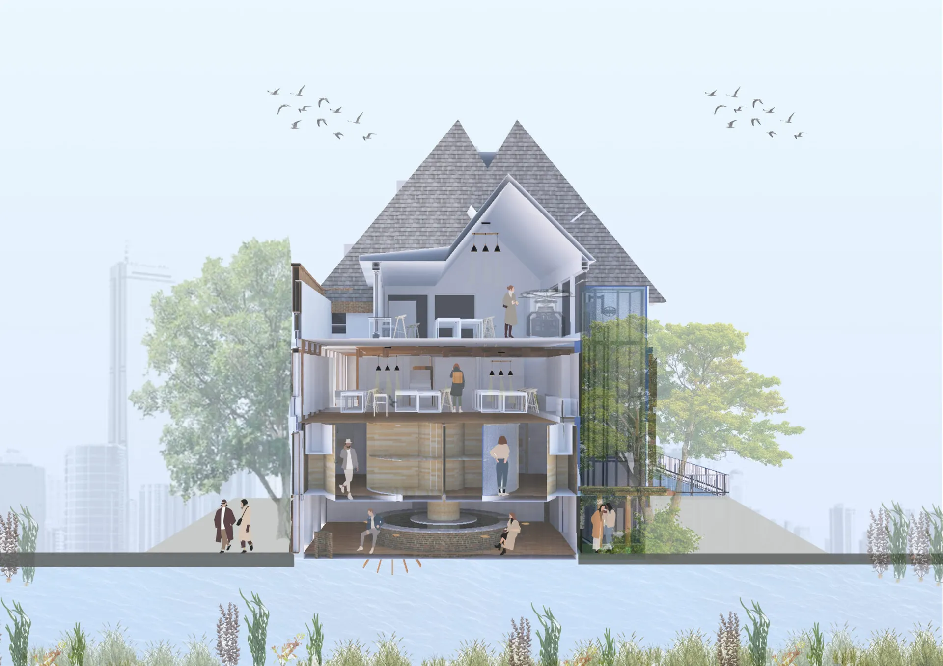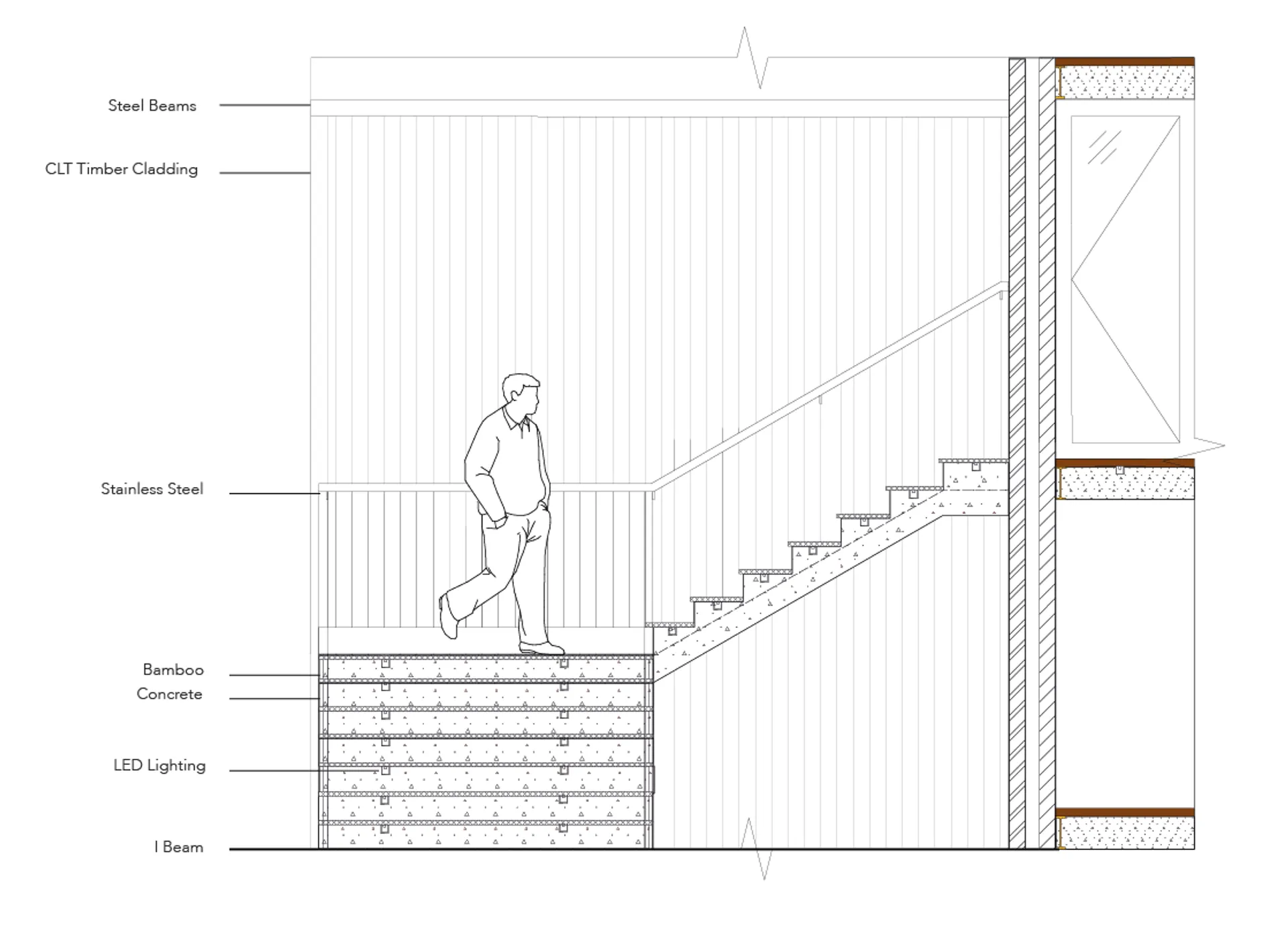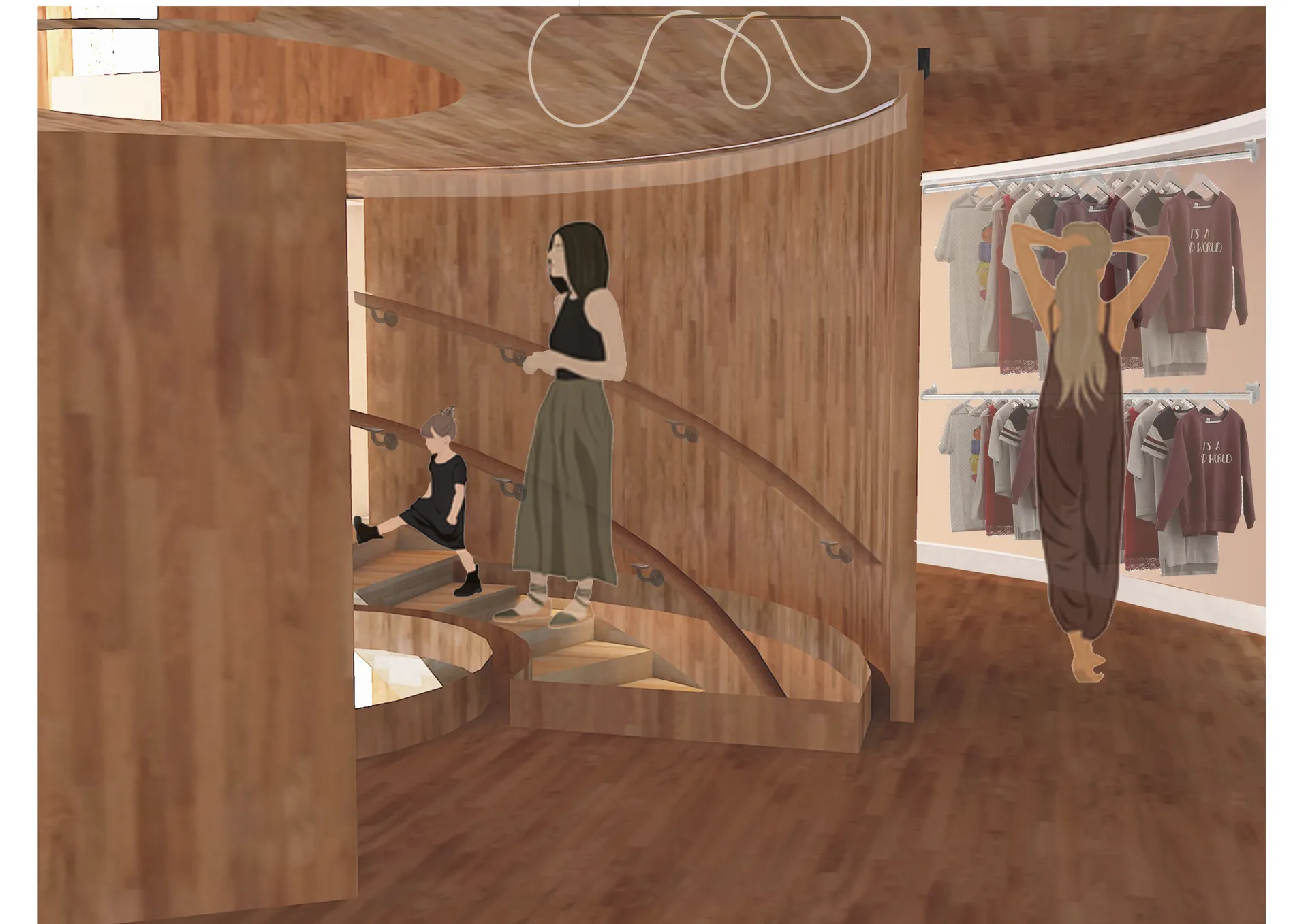 The existing wheels of the Mill will be used to import the plastic from the canal boat (below the building), the plastic will then be collected inside the Mill by workers and sent up to the top floors for processing, via a hoist which will cut through all floors of the Mill and run through the centre of a spiral staircase- which will be one of the main attractions of the space. Visitors will be involved within the process from plastic to fabric, creating an immersive and educational experience. The more plastic waste collected, the more fabric can be created. The garments created by the local and students will displayed throughout the Mill, which will guide the public circulation.