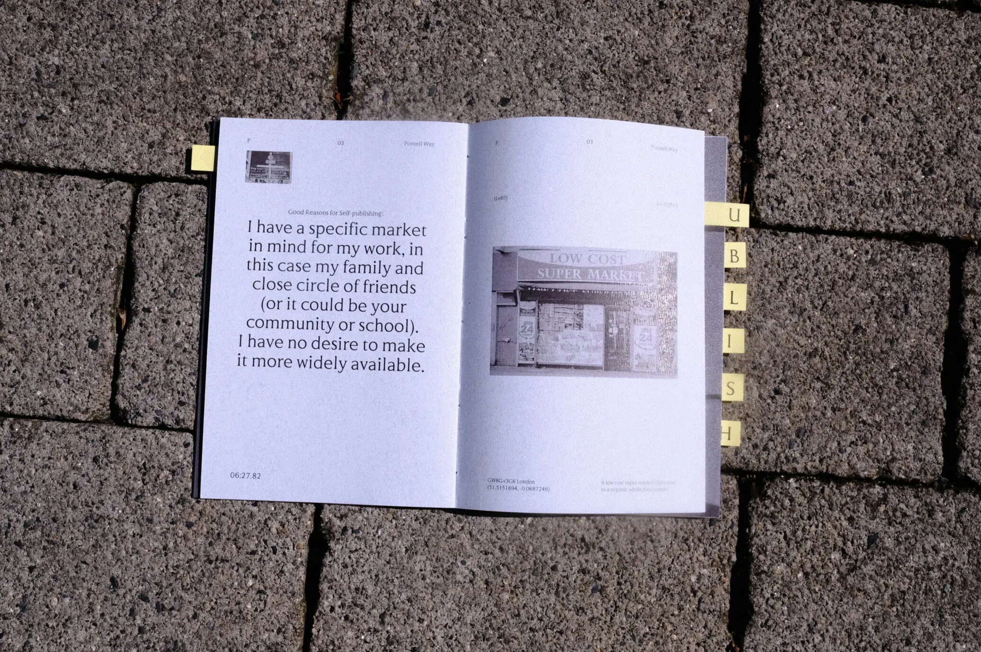 Publish walk is a record of my walk in the London Aldgate. It was inspired by Alison Baverstock’s self-publishing quiz and The Practice of Everyday Life. So, this work has multiple but interconnected layers of meaning. I propose: