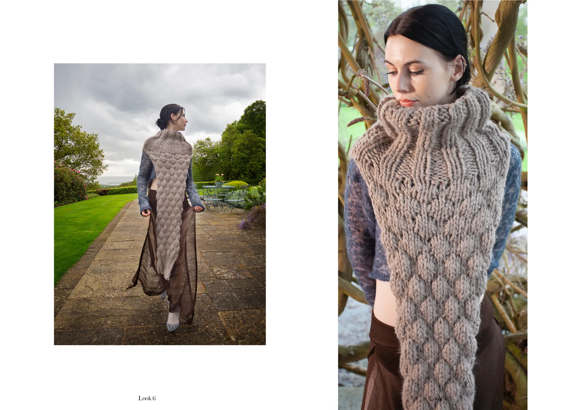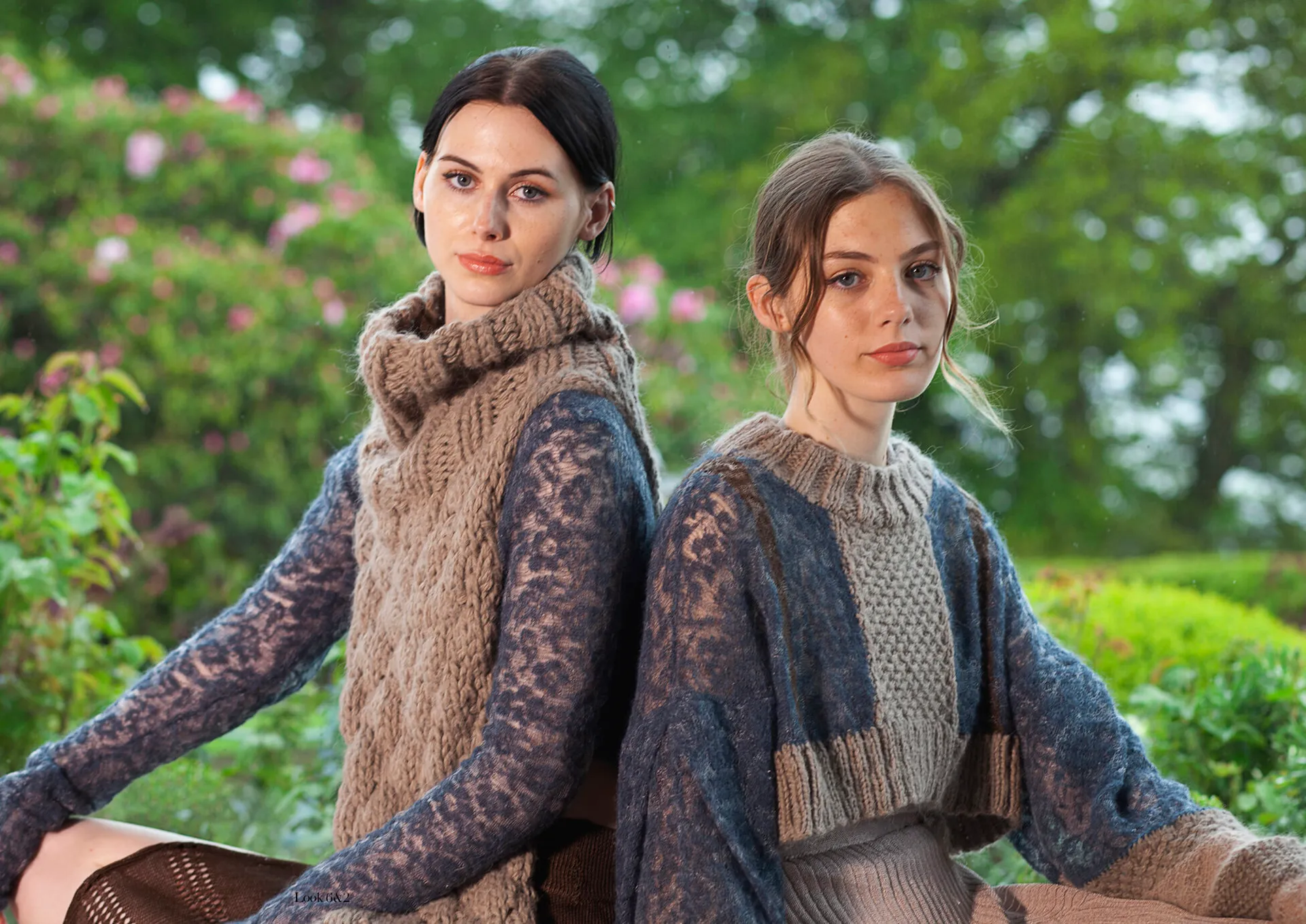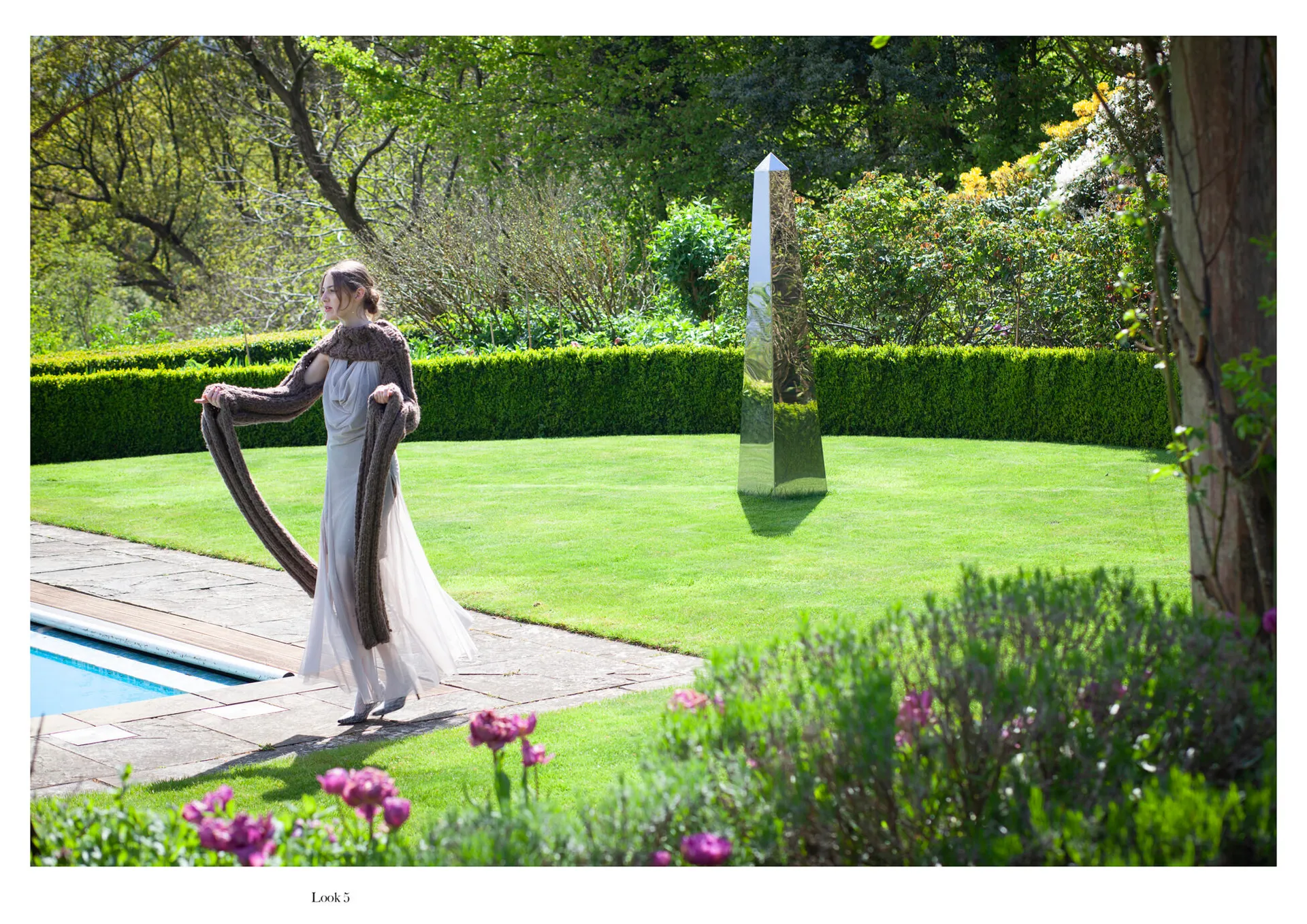 Layers of delicate mohair lace, draped sheer viscose complimented by chunky handknits creating a look evoking the Golden Age of Hollywood. Subtle nuances of blush rose, fawn, mink, steel blue and chocolate create an elegant sophisticated collection.