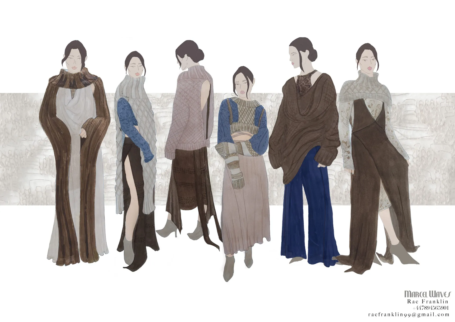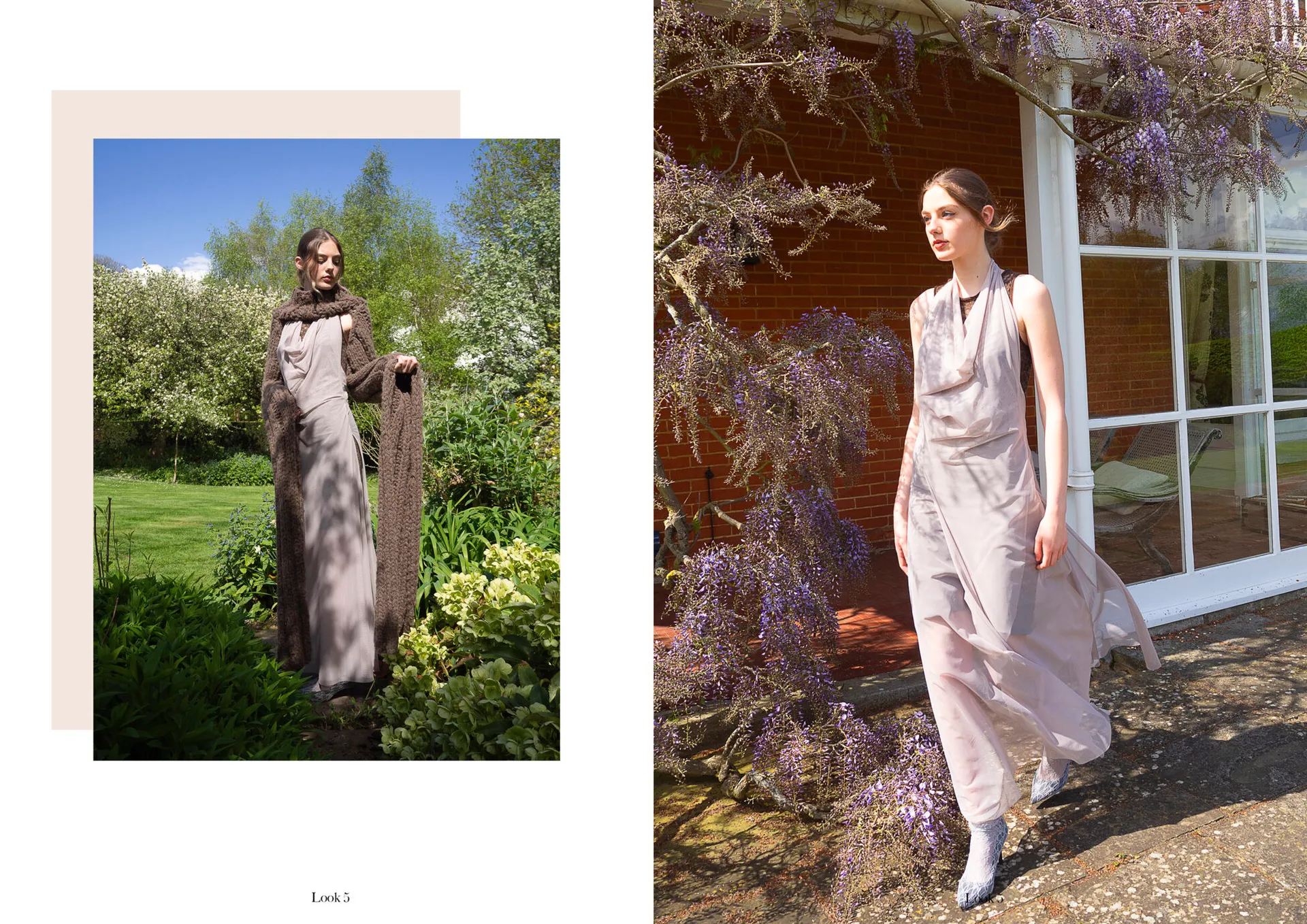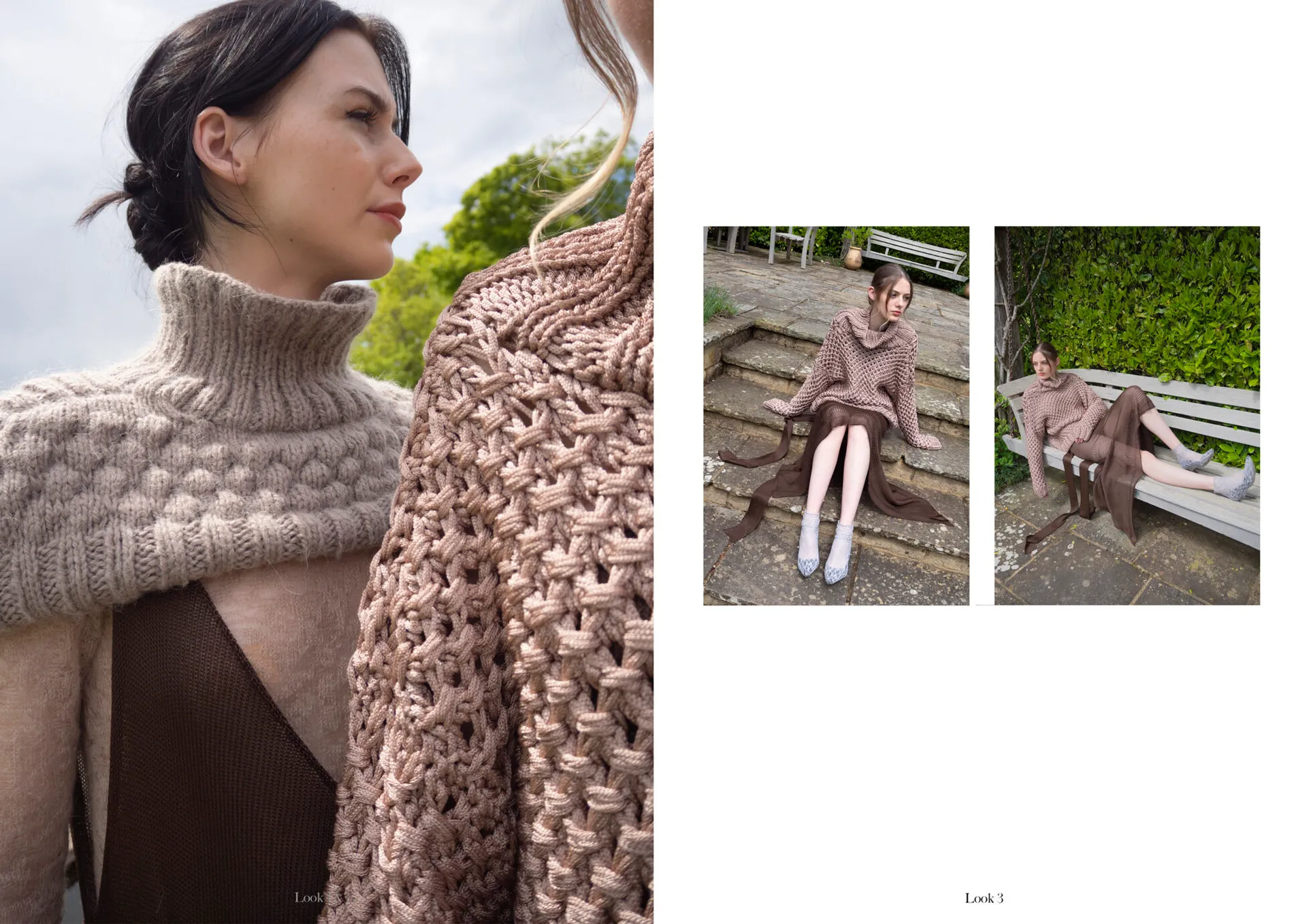 Layers of delicate mohair lace, draped sheer viscose complimented by chunky handknits creating a look evoking the Golden Age of Hollywood. Subtle nuances of blush rose, fawn, mink, steel blue and chocolate create an elegant sophisticated collection.