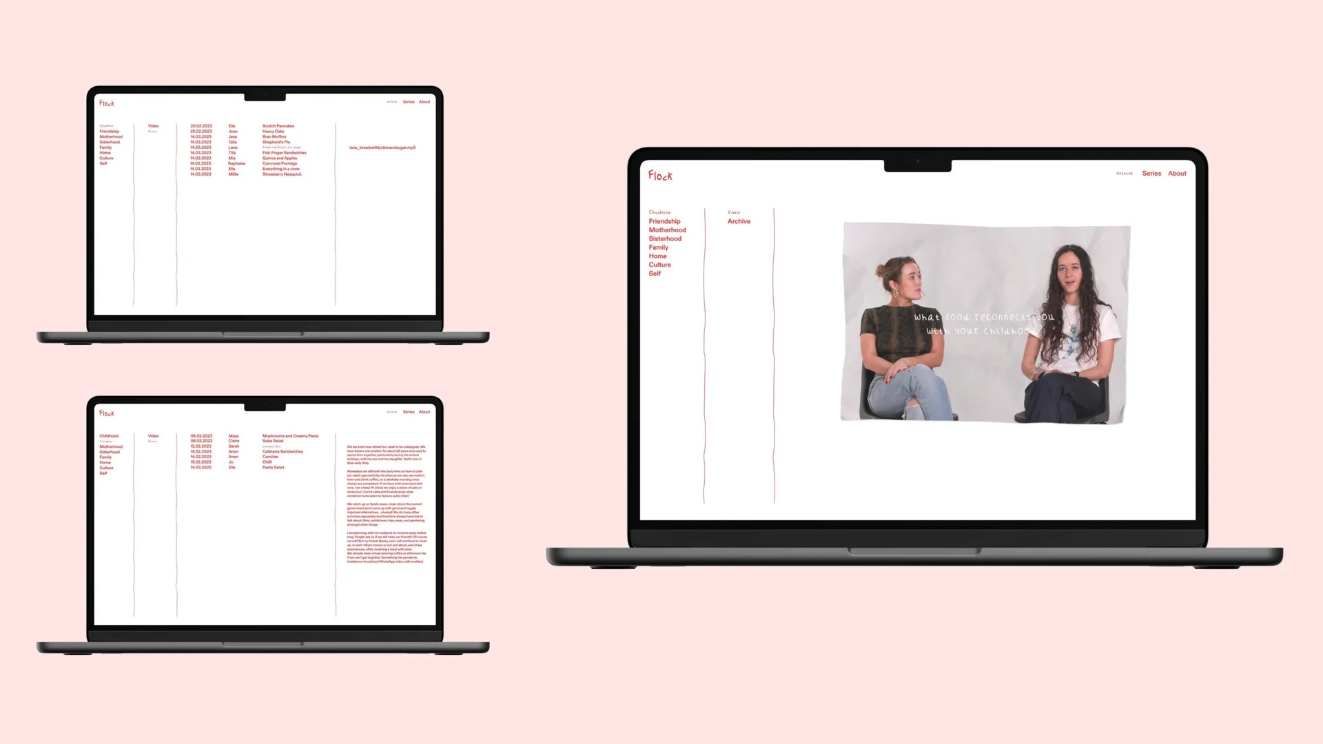 Flock is a passion project that evolved from intimate conversations with my female friends. It serves as an archive that seeks to capture the unique and diverse memories and relationships that women have with food. The project is divided into two components: an archival website that compiles the memories shared with me, and a video series that explores specific themes through the use of various video formats. By creating Flock, I aspire to shed light on the intersection of food and personal narrative and provide a safe space for women to share their stories and experiences.