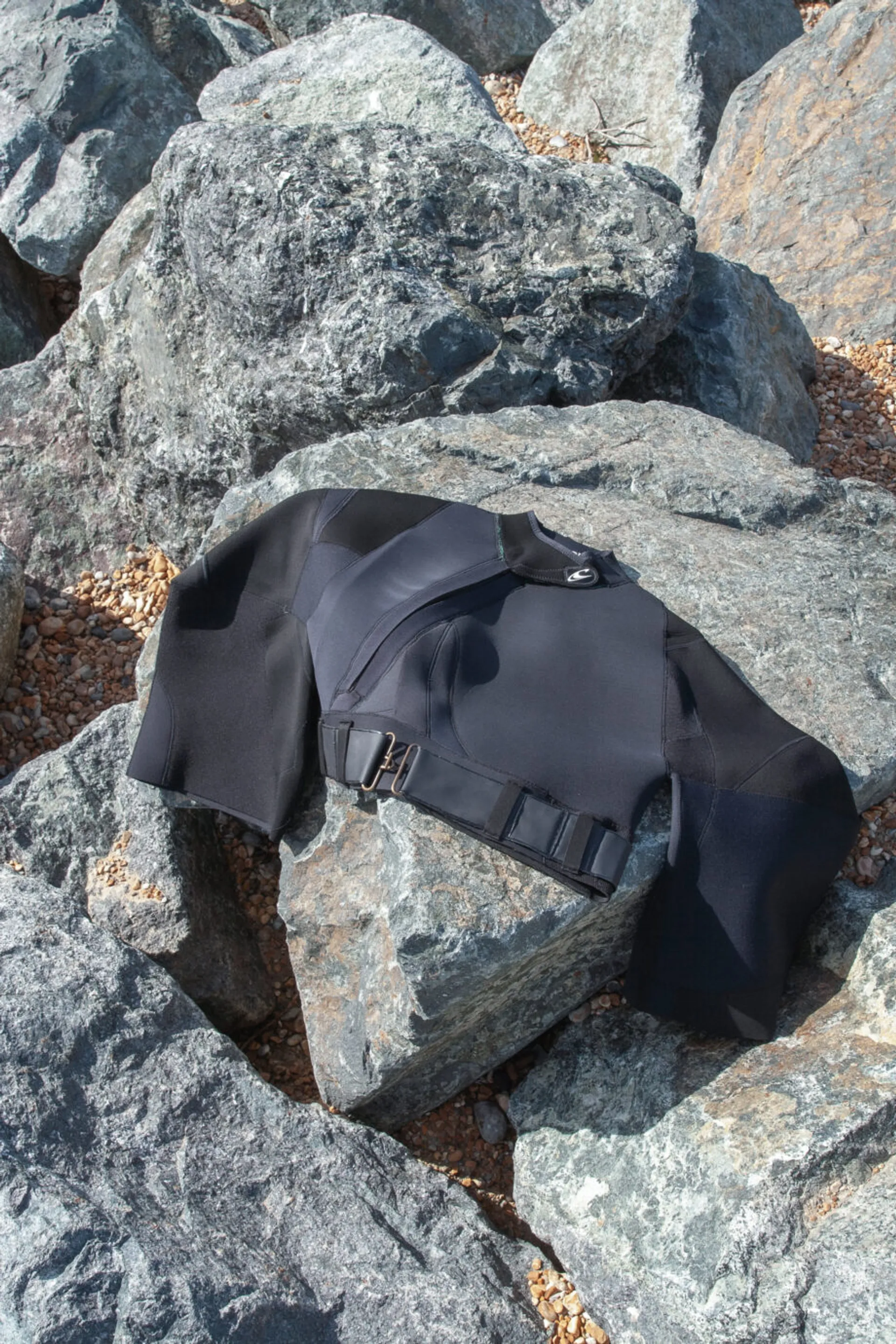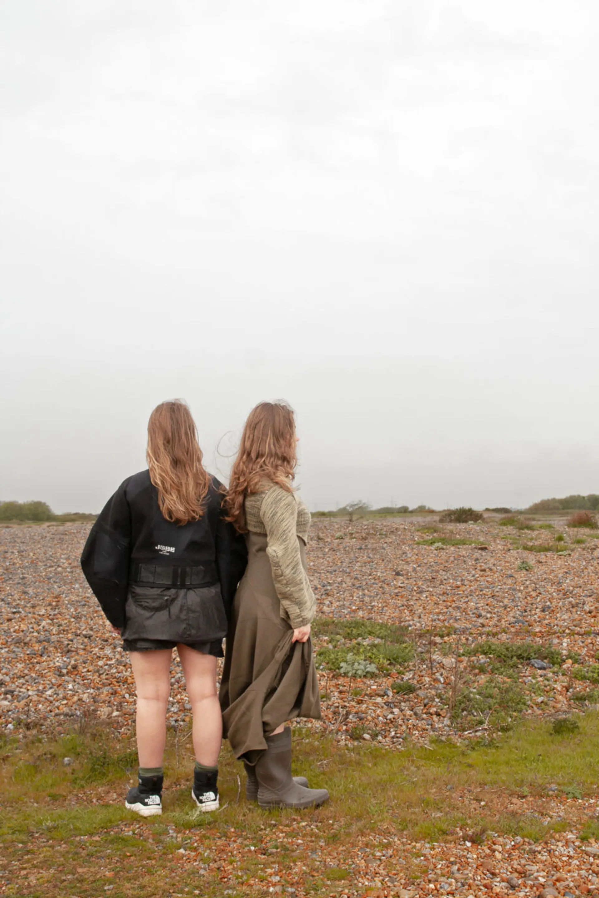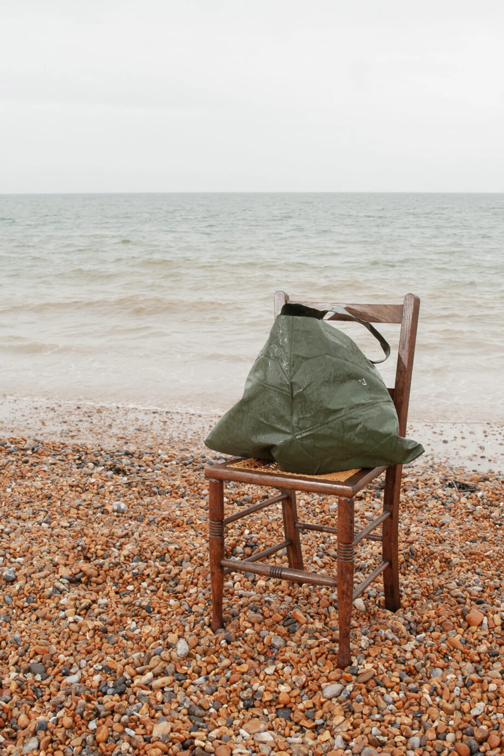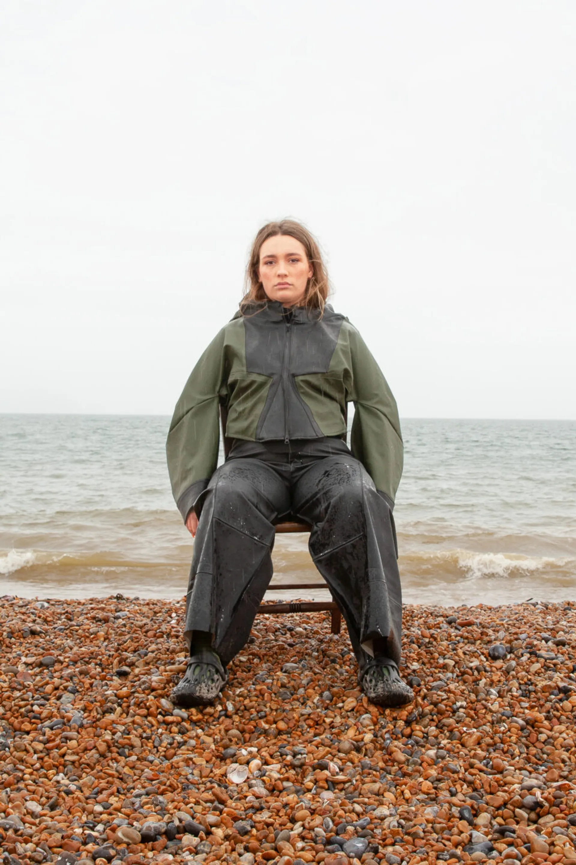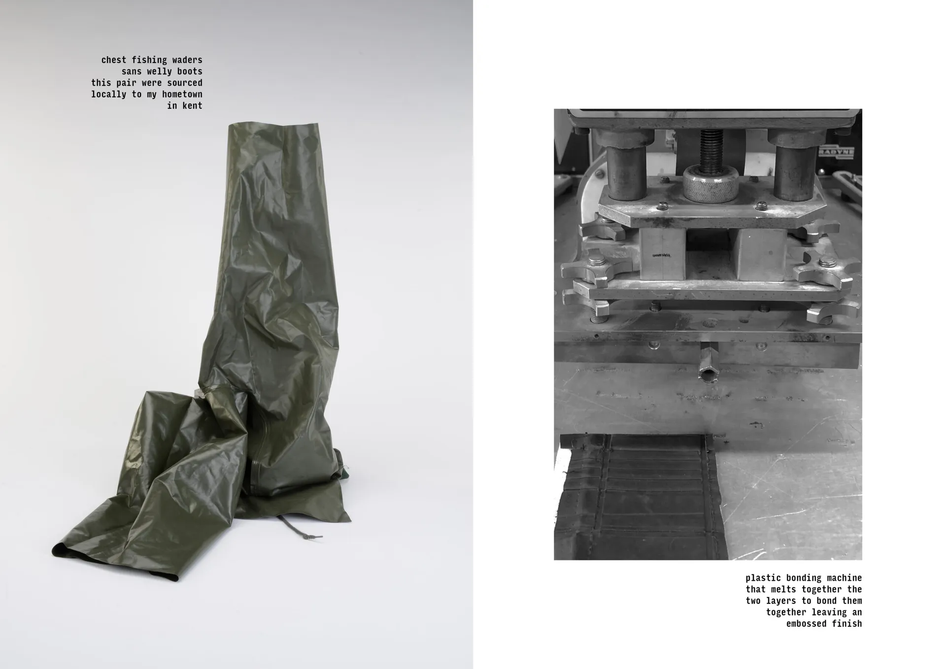 Damaged wetsuits from Action Watersports, Kent. Unloved pac-away anoraks and PVC fishing waders sourced from family, friends and independent sellers/donors across London and the South of England. Deadstock ripstop and ribbing jersey from Raeburn, Hackney. Deadstock yarn and cotton lining from The Work and Play Scrapstore, Earlsfield.