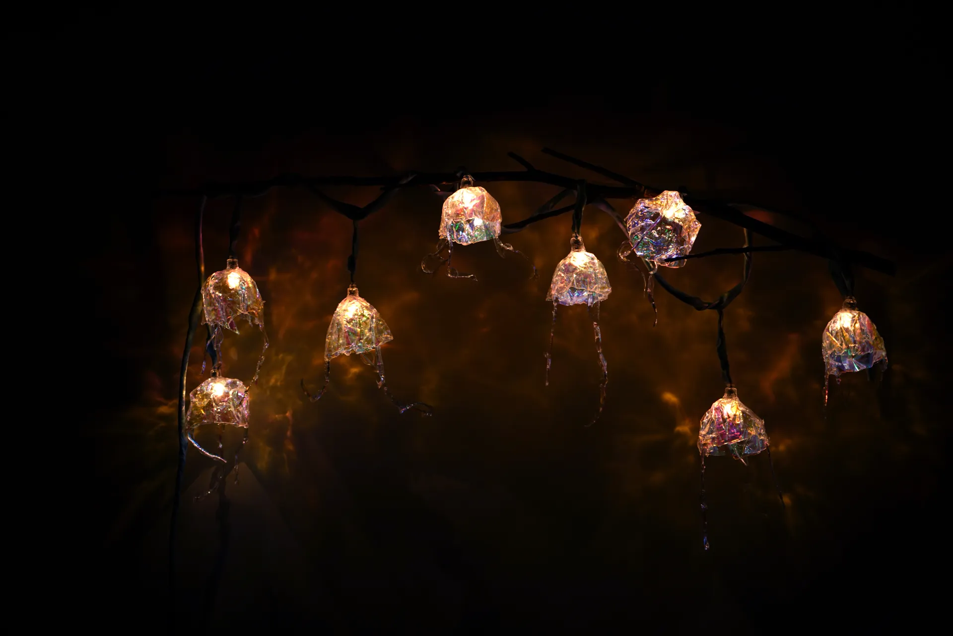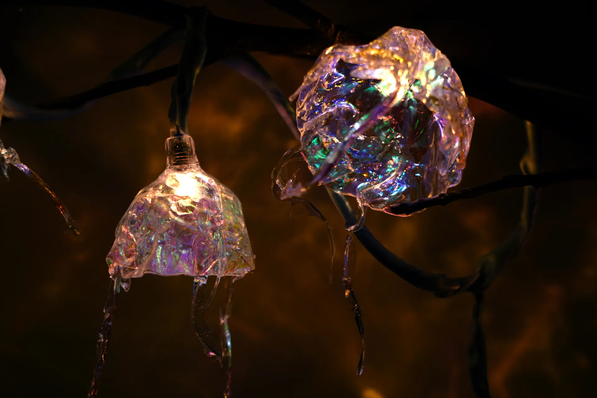 Ultimately, this light project serves as a testament to the power of art in preserving and celebrating the essence of childhood memories. By combining the evocative qualities of iridescent wrapping paper, the transformative potential of resin, and the captivating allure of natural forms, the installation aims to immerse viewers in a vibrant and luminous journey through the cherished recollections of their youth.
