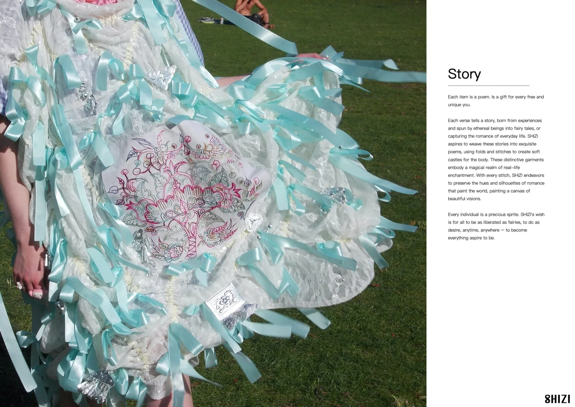 Each verse tells a story, born from experiences and spun by ethereal beings into fairy tales, or capturing the romance of everyday life. SHIZI aspires to weave these stories into exquisite poems, using folds and stitches to create soft castles for the body. These distinctive garments embody a magical realm of real-life enchantment. With every stitch, SHIZI endeavors to preserve the hues and silhouettes of romance that paint the world, painting a canvas of beautiful visions.