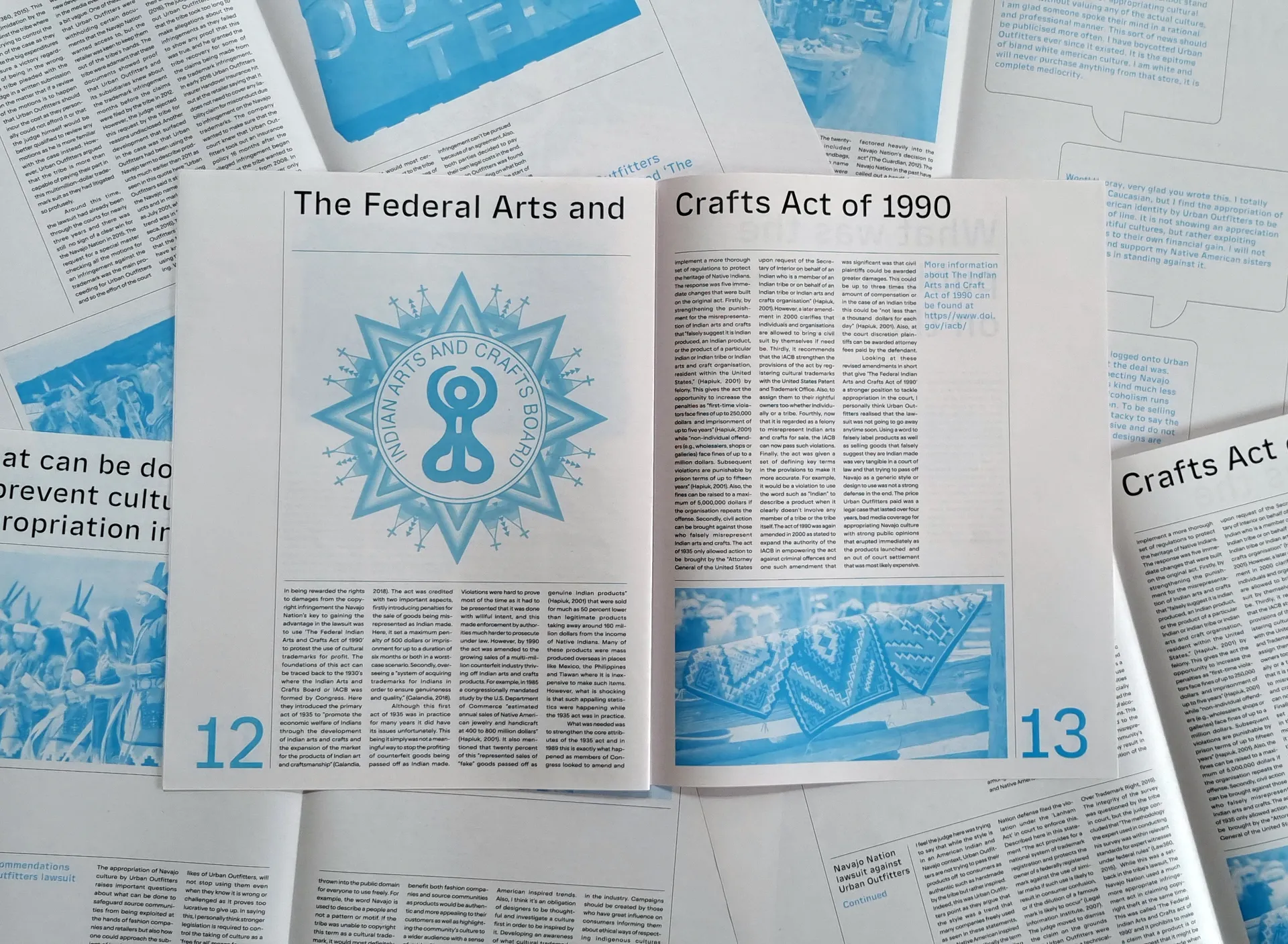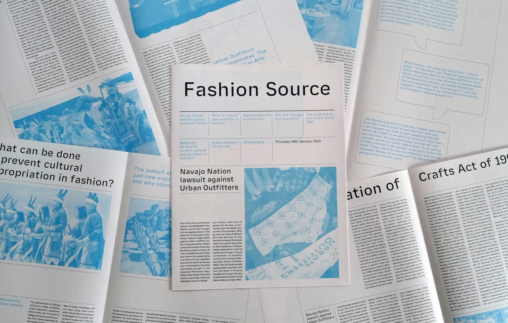 Fashion Source is a tabloid style newspaper of my dissertation that focuses on cultural appropriation in the fashion industry by highlighting one of the most publicised lawsuits in the media between the Navajo Nation and Urban Outfitters. The publication highlights how the taking of culture when done in a non-ethical way harms a source community with details from the lawsuit about what was appropriated, how this affected the tribe and how the infringement was eventually settled along with the public reaction to the case. Highlighting cultural appropriation in this way shows just how exploitive it is when a global retailer gets their hands on the cultural identity of an indigenous people and why this colonising of culture must stop.
