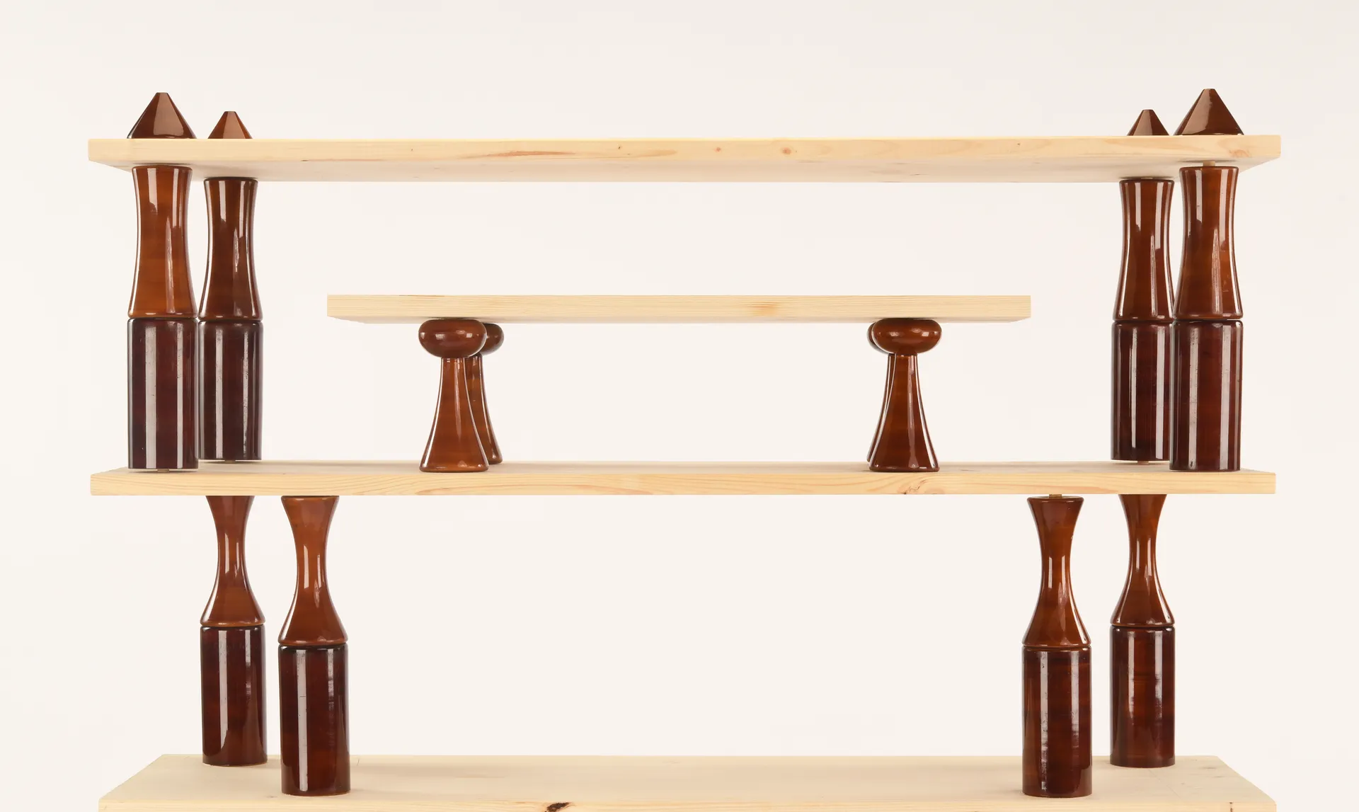 This shelving unit draws its design inspiration from the stacking method used for multiple charpais (traditional Indian beds) and incorporates the associated joinery techniques. The unique leg design features chess coins, reflecting the historical use of charpais as spaces for playing games. The primary goal of the product is to retain the essence of Channapatna toys while expanding into furniture.