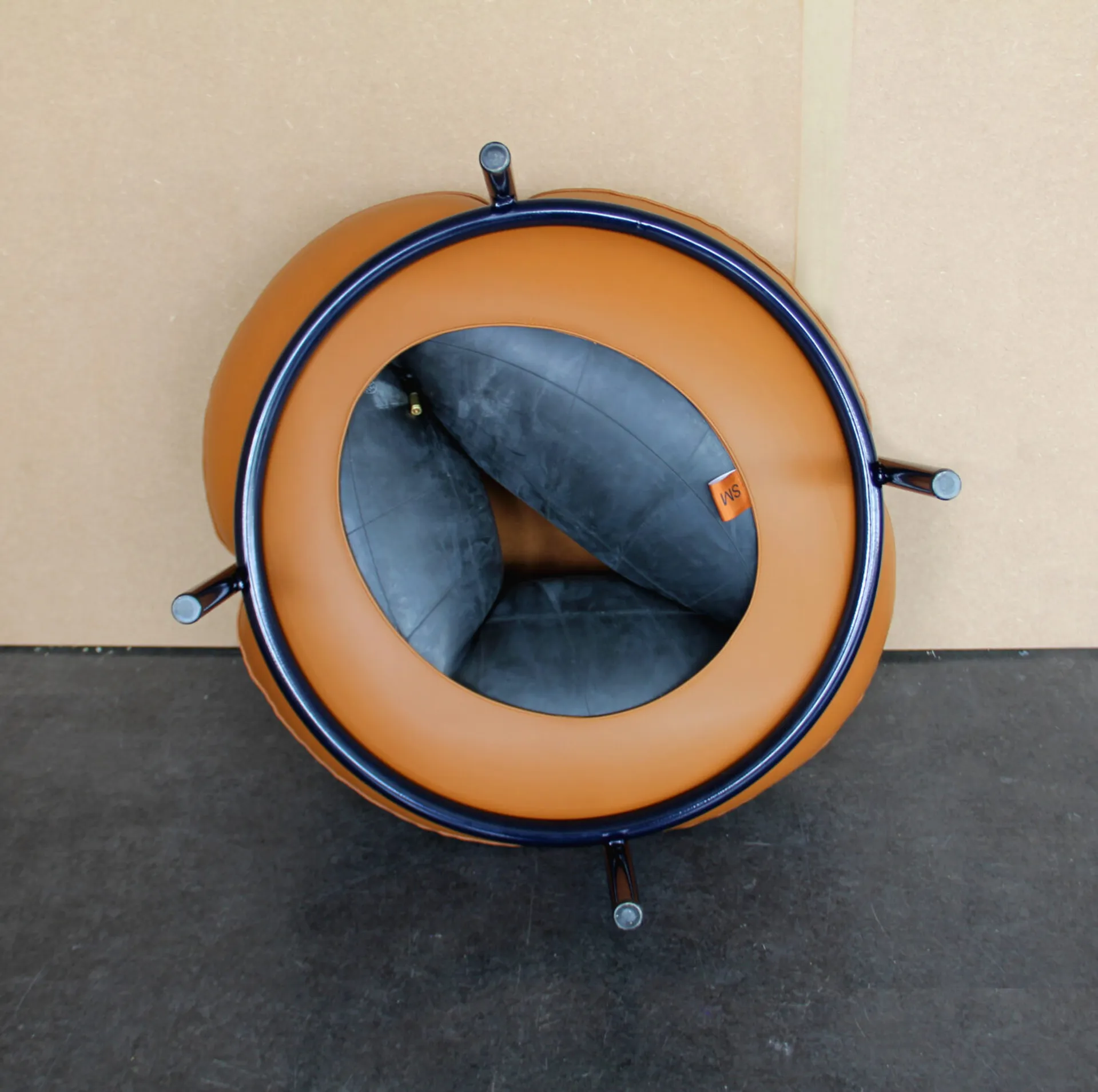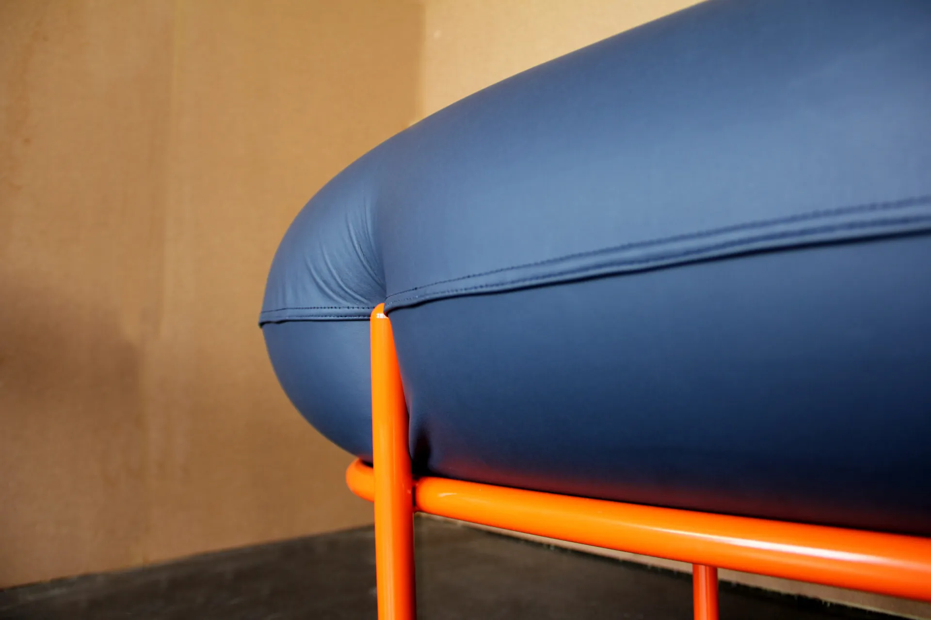 I have created straightforward and honest designs that demonstrate the potential of inflatable furniture in an innovative way. By utilising repurposed inner tube, a steel frame, and leather (of which all leather were donated offcuts from Upholstery company Coakley&Cox), I have eliminated the need for foam, padding, and glue typically found in traditional furniture. Additionally, these pieces are lightweight, easy to transport, and can be deflated and re-inflated whenever necessary.