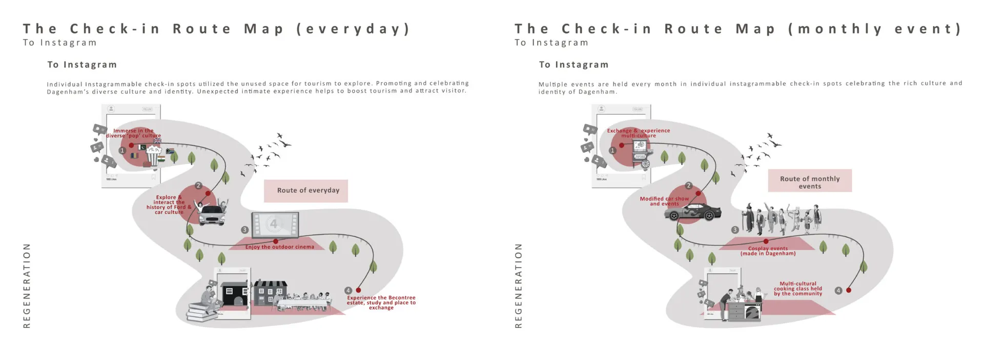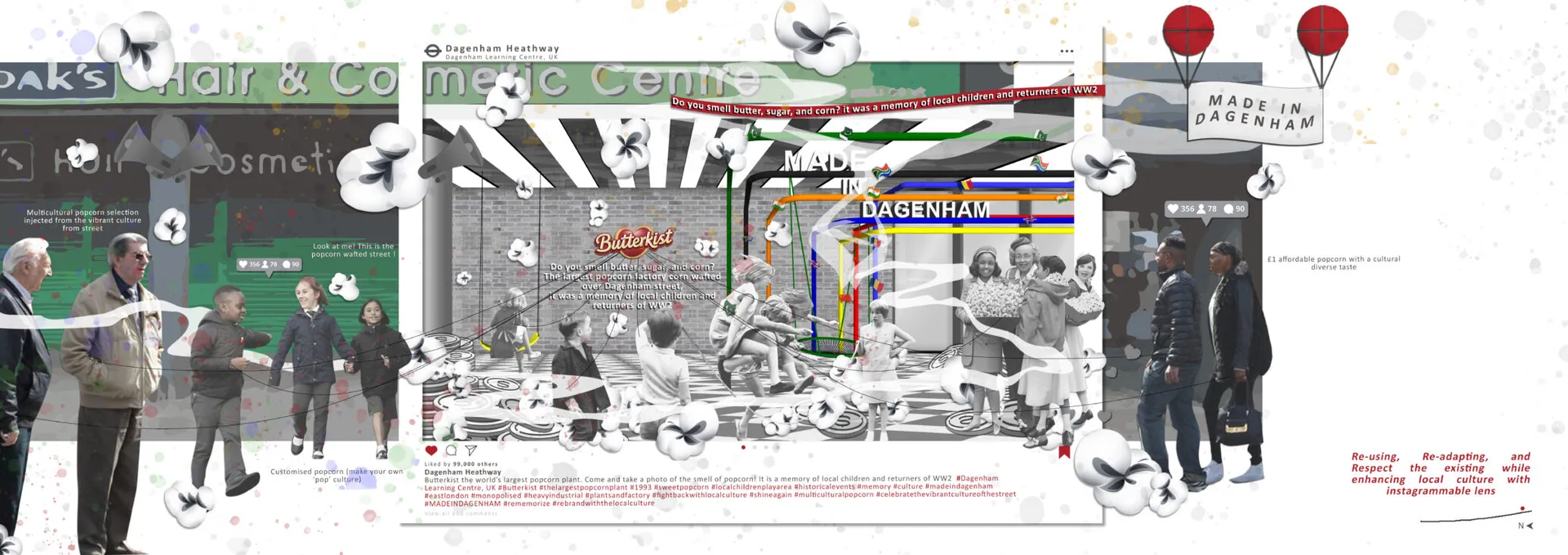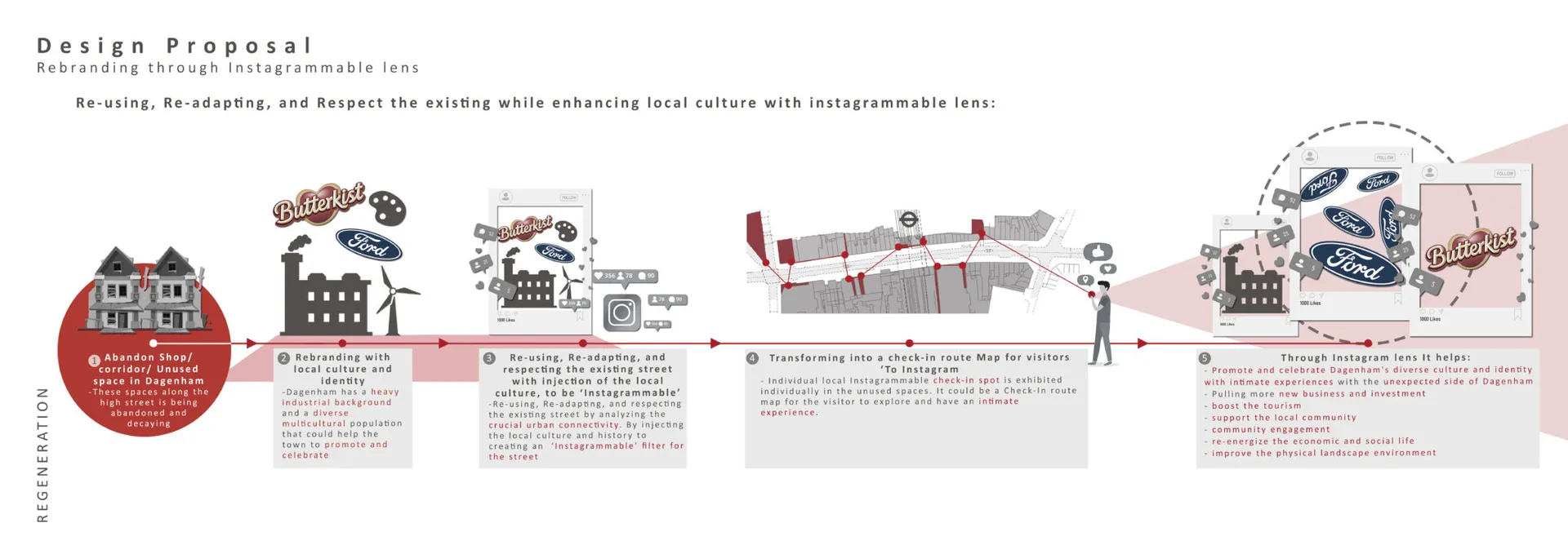 London has been designed in a monopolized way. A tale of 4 cities: The East is poor, the West is posh, the South is rough, and the North is intellectual. Dagenham is on the east edge of London, with heavy industrial plants and factories. But what if ‘To Instagram’ became a design agent, advertising and rebranding the deprived area for the community, celebrating the historical and iconic events of Dagenham? Boosting tourism and business that benefiting the local community through the Instagrammable lens.