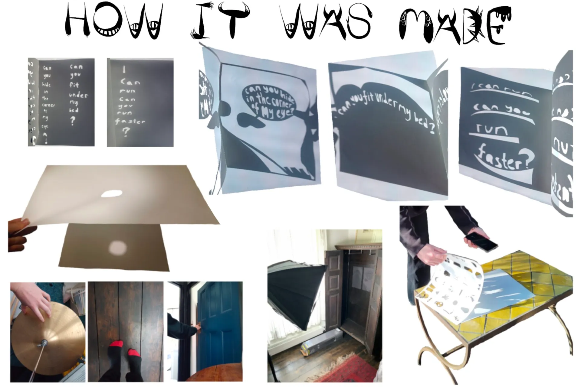 My animation is titled ‘BOO!’ and is meant to creep you out. This project is all about monsters and how children use them to explain their fears. In this animation I used stencils to cast shadows of objects, faces and phrases. The language came from my research based on where children think their monsters hide and why they make them up. The different objects and faces show what shadows can look like in the corner of the eye, and could cause the fear of the dark. It is all about what I think the purpose of a monster is.