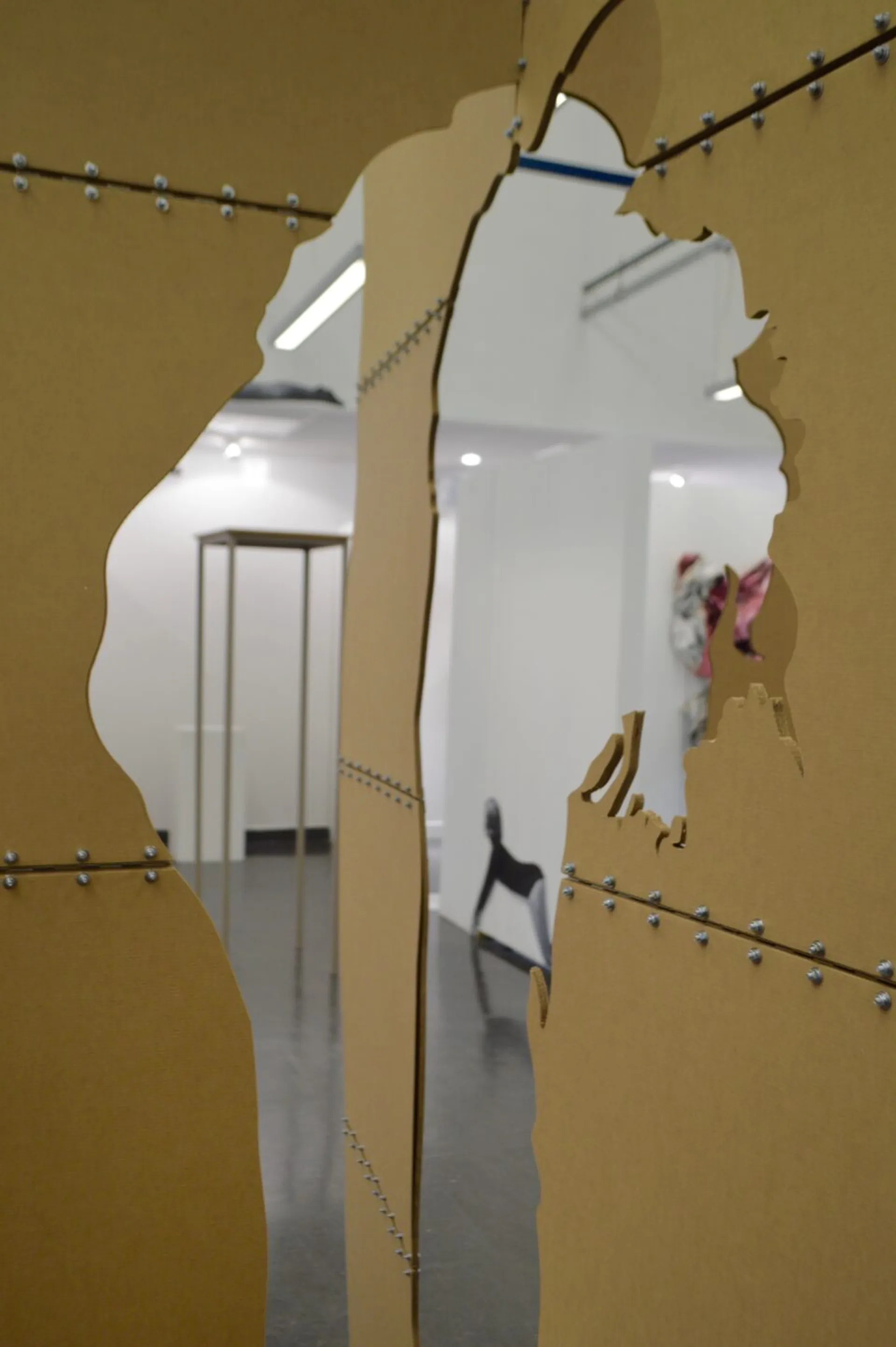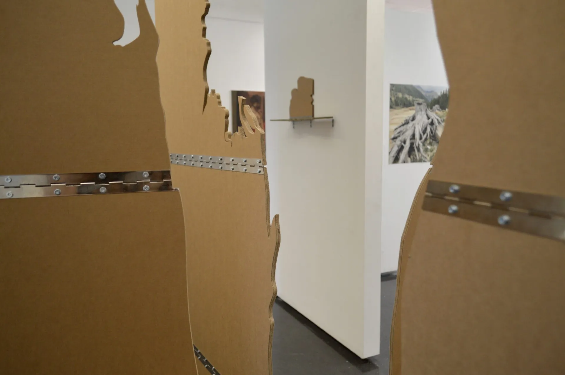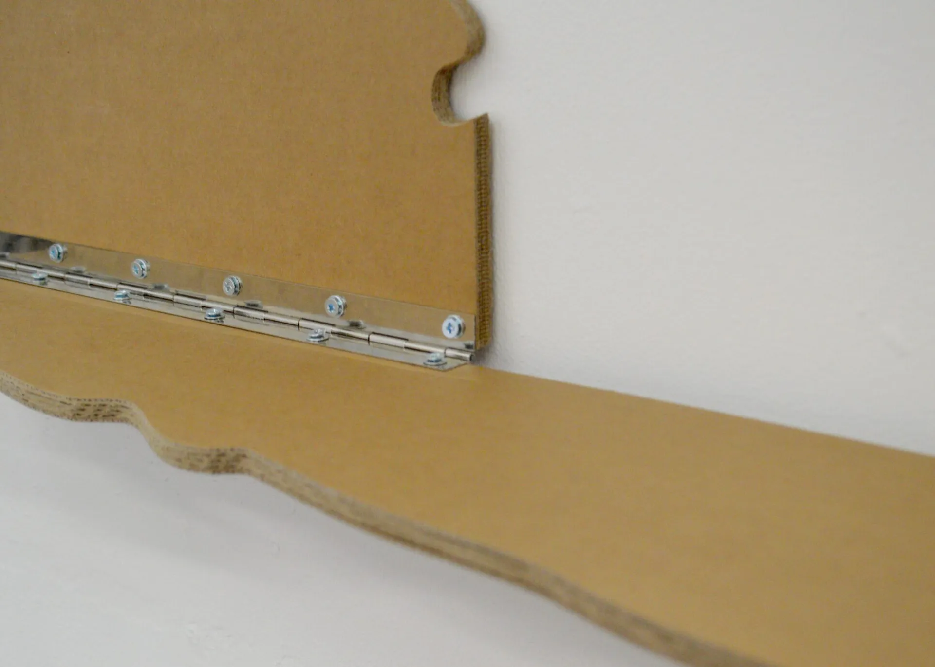 A continued theme within my works as an artist is the exploration of materiality. I enjoy pushing the physical and aesthetic boundaries of materials in art communication settings such as exhibitions and critiques. This year I have focused my exploration on cardboard as a medium, initially using the deep sandy colour sheets for maquette purposes; I became fixated on its sculptural possibilities. I have enjoyed the utilitarian aesthetic and nature of the material; for me, it provided a sense of meditative simplicity. I introduced contrasting hard-wear elements to my works, including silver-coloured handles, hinges, nuts and bolts, hooks and loops. This experimentation played with ideas of usefulness/uselessness of the results, a concept particularly interesting when brought into the exhibition context. I enjoy blurring the lines of the viewer’s role and engagement with the artwork. Throughout the year, I have found concepts of space, landscape, environment, and set design to be emerging themes that run through my practice. I have enjoyed working with these concepts; where cardboard is cheap and light, I have been able to explore in greater depths and perspectives.