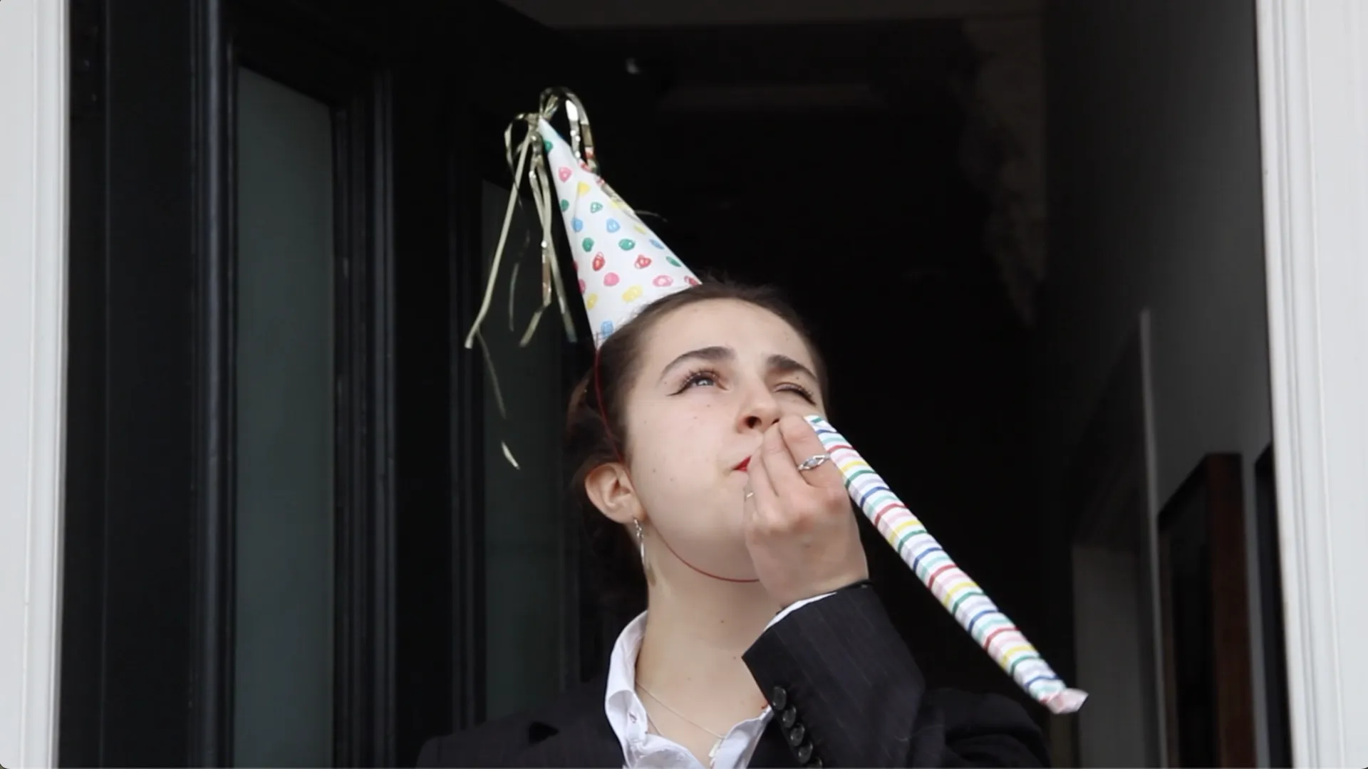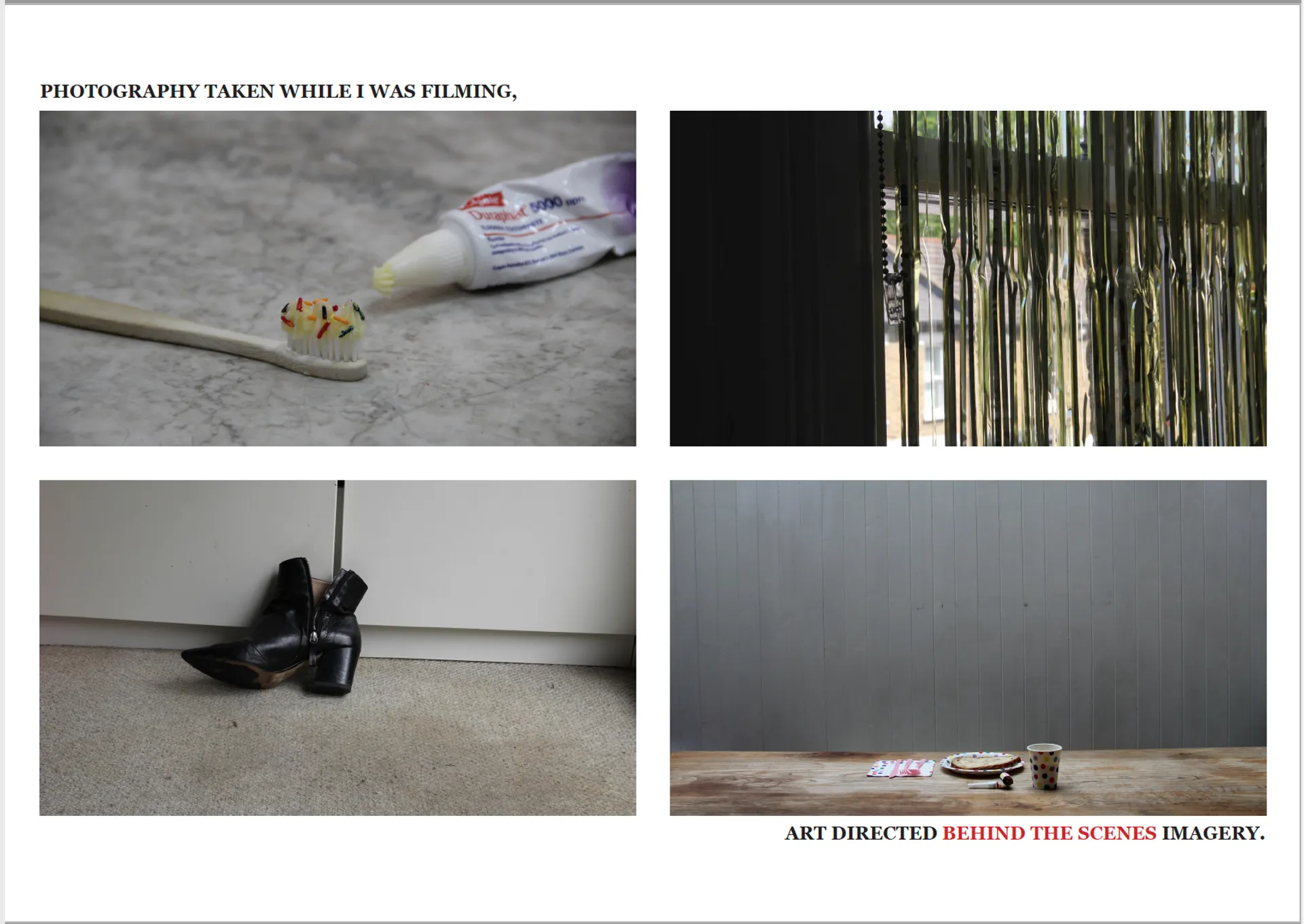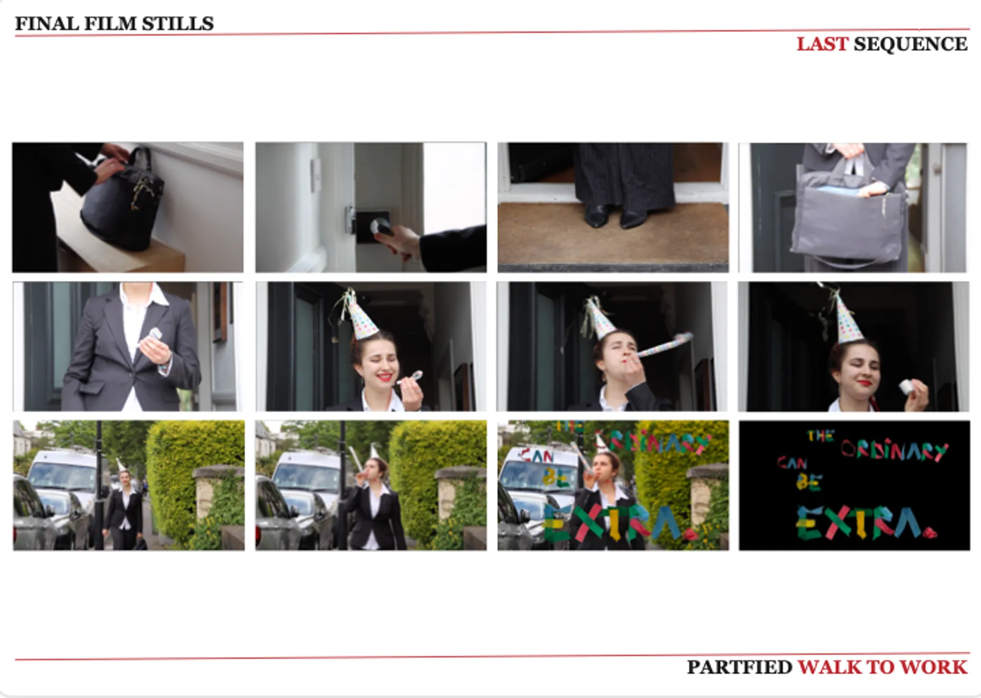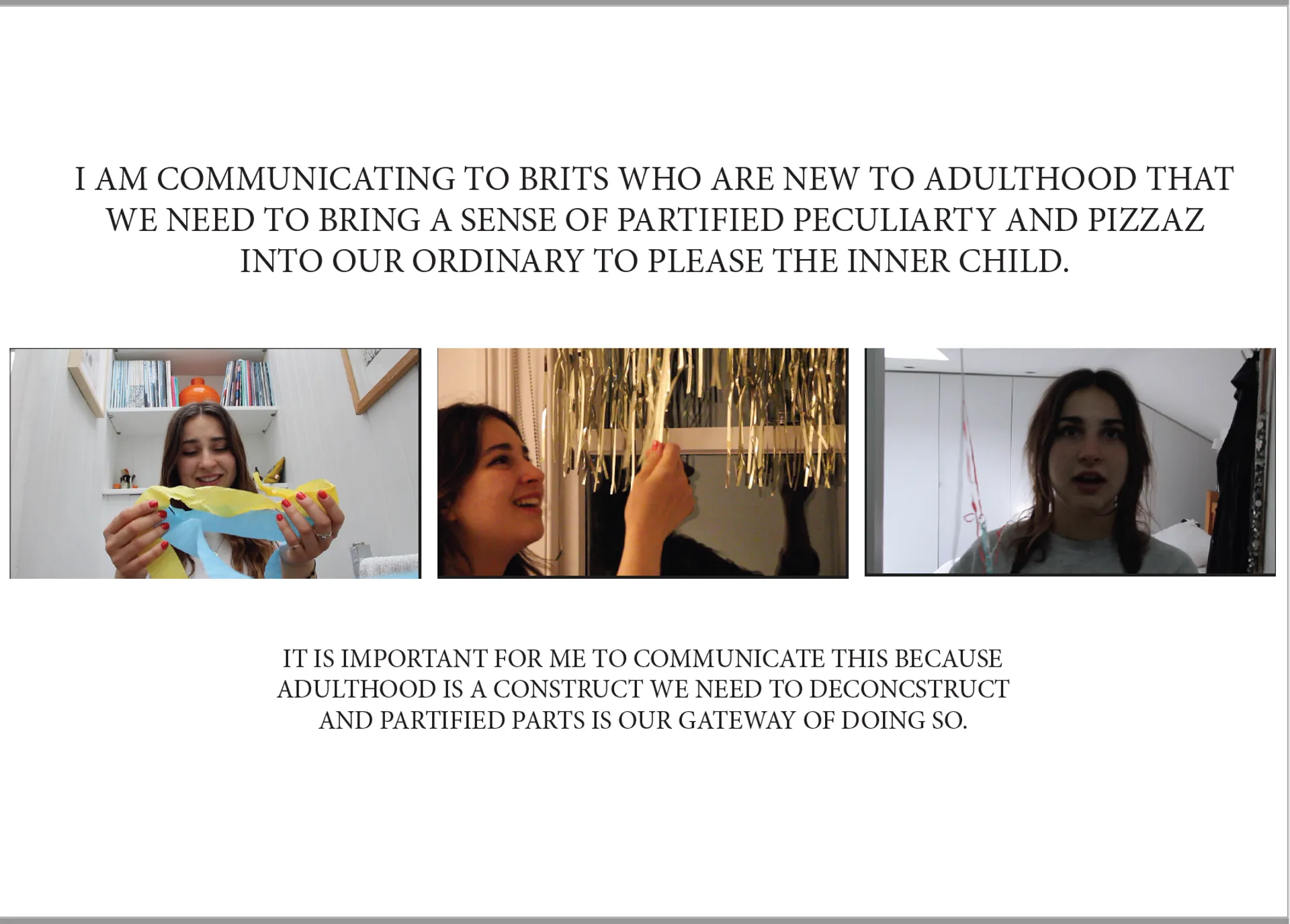 I have made a short film accompanied by a flip book of stills taken from the film. The film follows a young working woman’s normal morning routine but ‘partified’. It is a speculation of what life could be if we deconstructed the concept of adulthood and implemented the silly, playful and childish acts that we do when celebrating but into daily life. The flip book captures this in a tangible and interactive way.