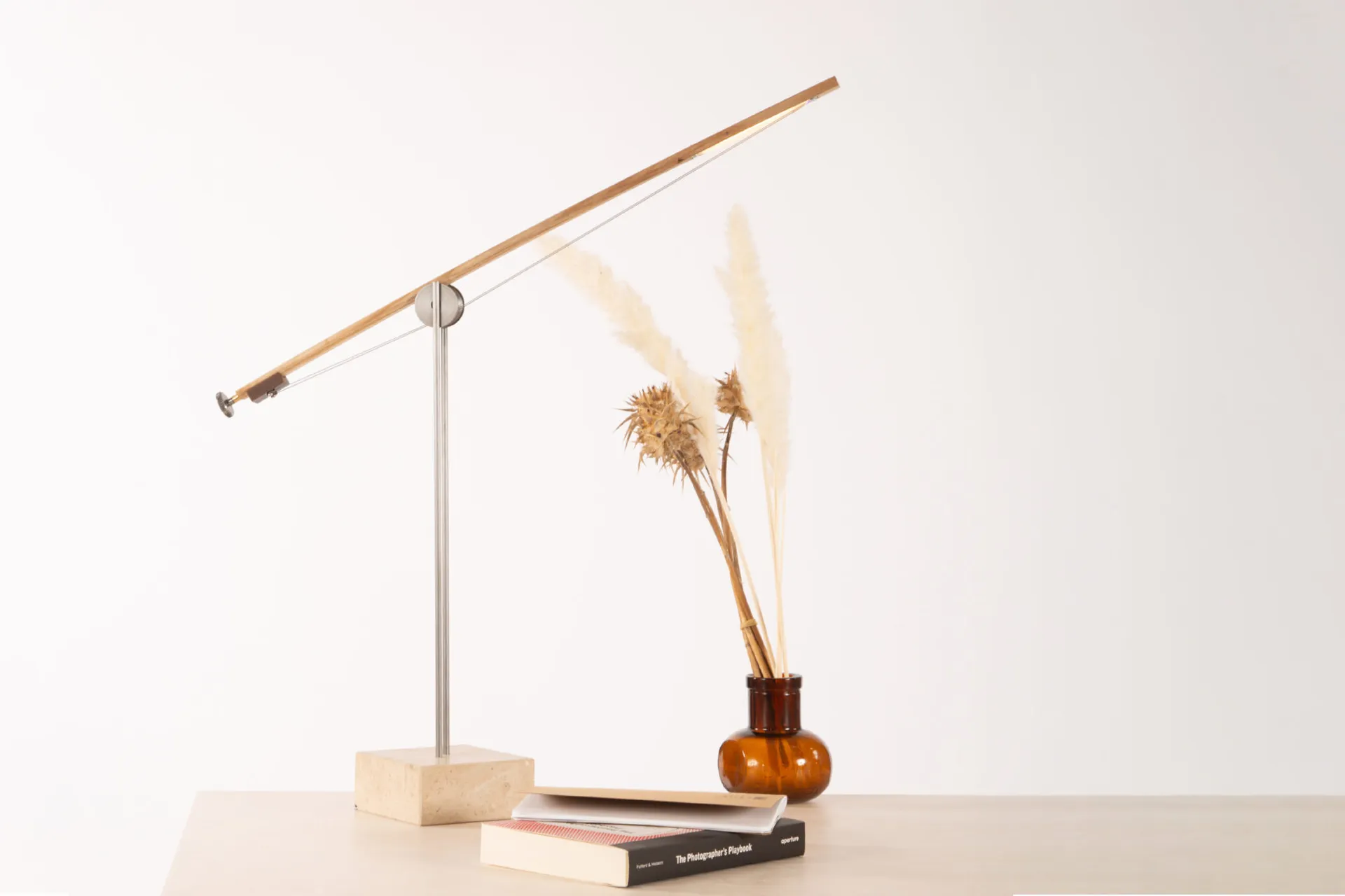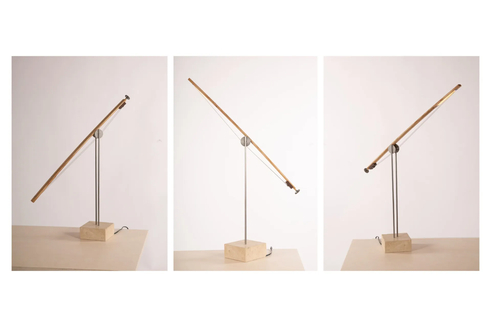 Bow task light is a table lamp to work, read and make by. Based on a violin bow, this live wire task light moves around a wheel on tensioned strings. Inspired by the sculpture of Calder, the engineering of Gaudi and a childhood obsession with moving toys, I wanted to design a functional sculpture based on physic principles.